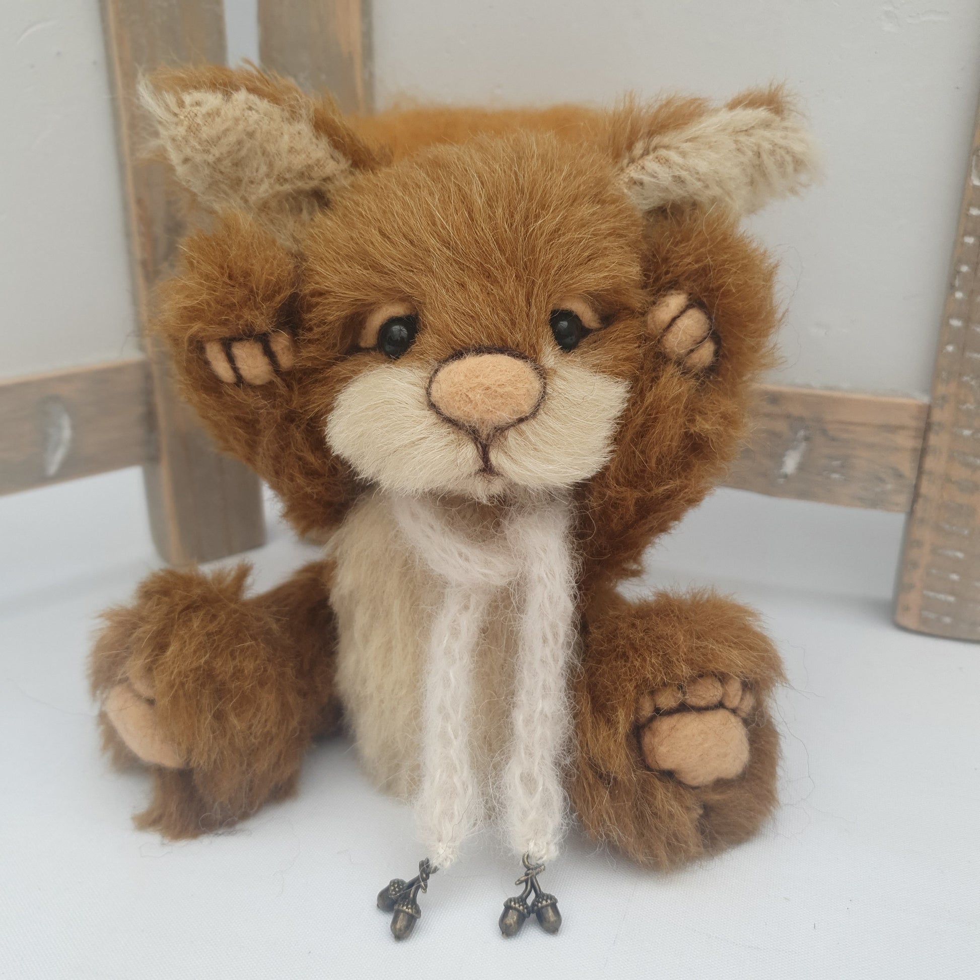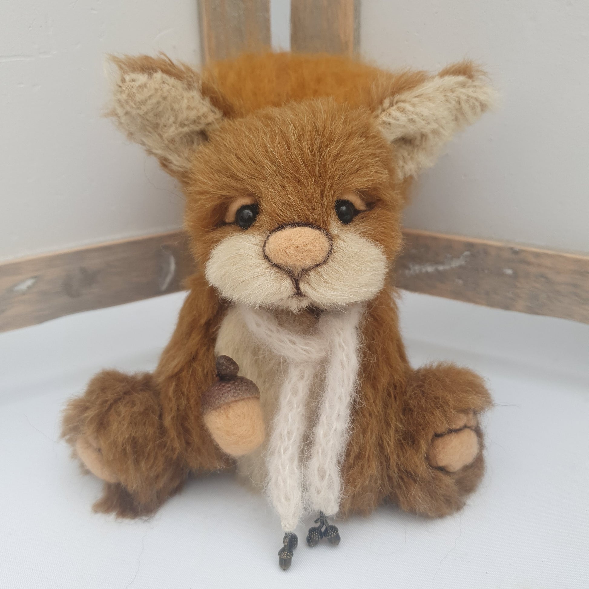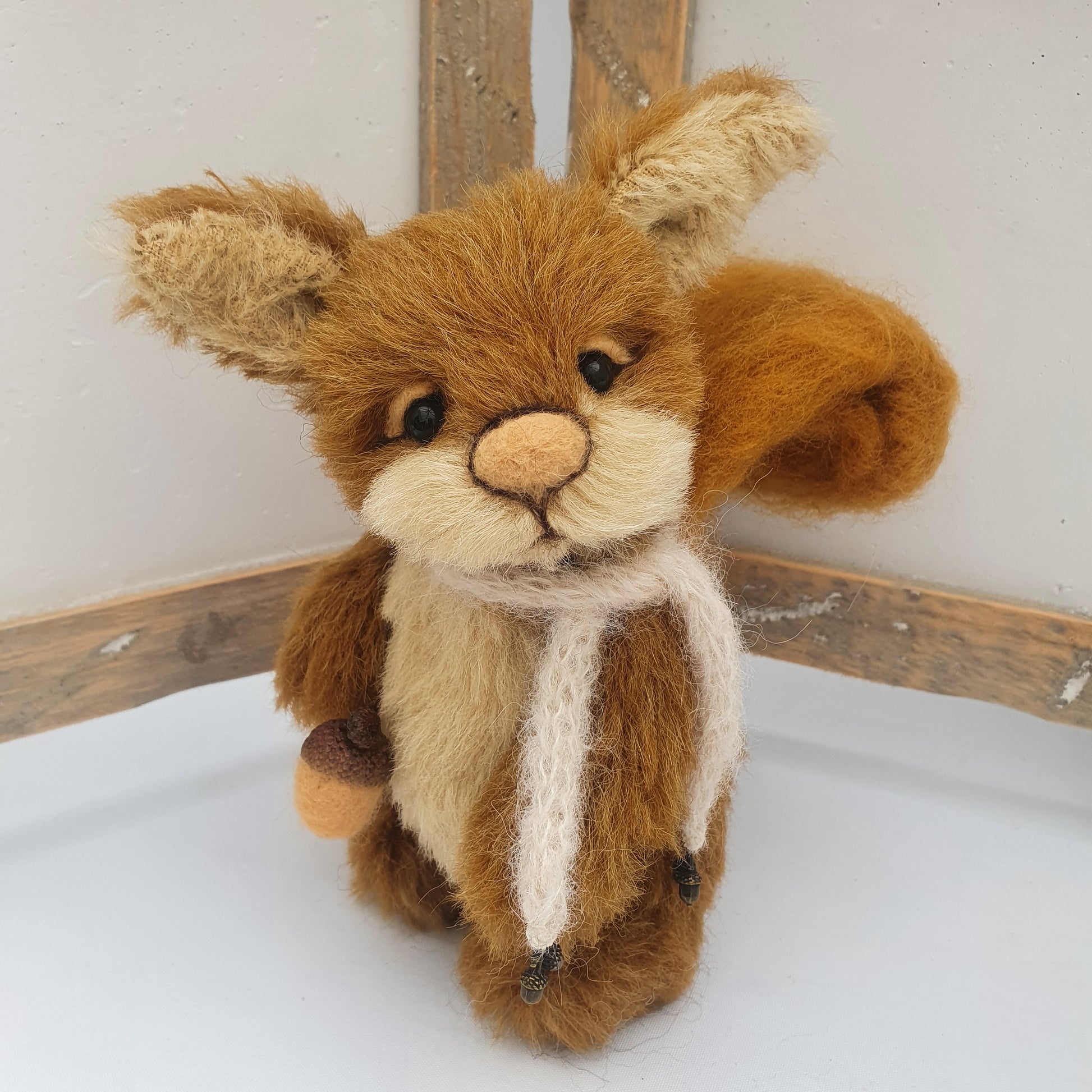 Decorated with an ivory alpaca wool knitted ribbon scarf, decorated with little metal acorn charms, his name is Mr Squirrel.