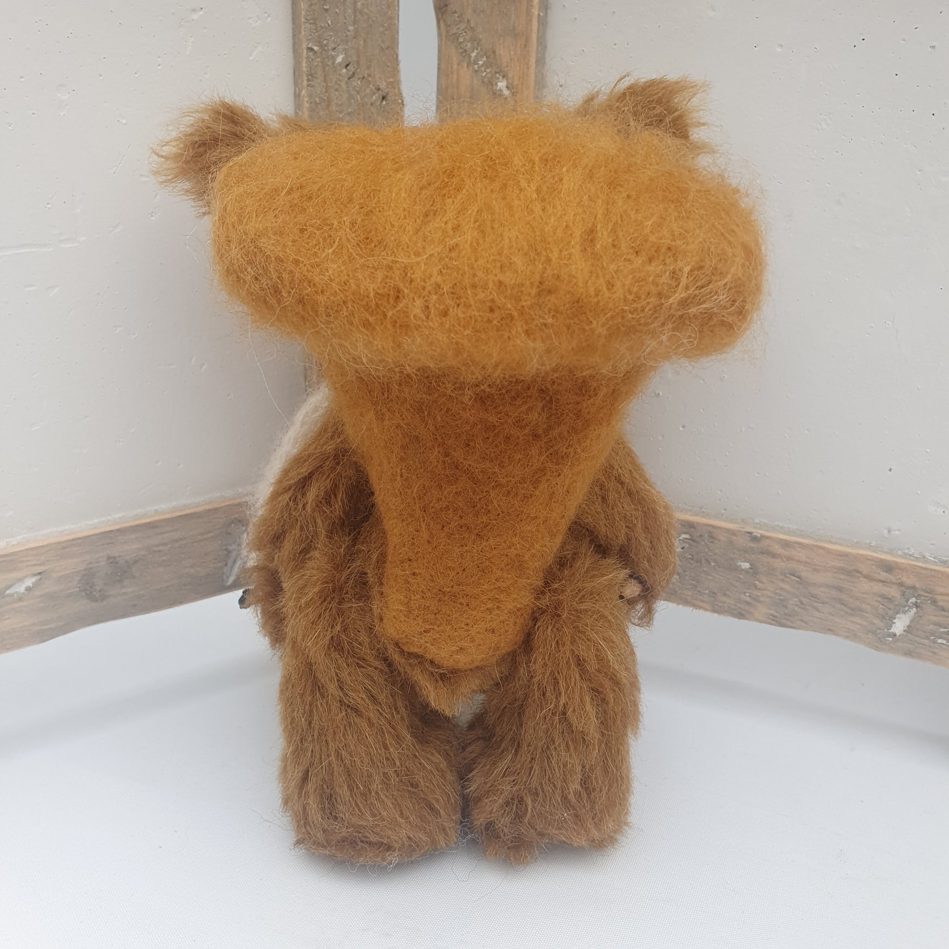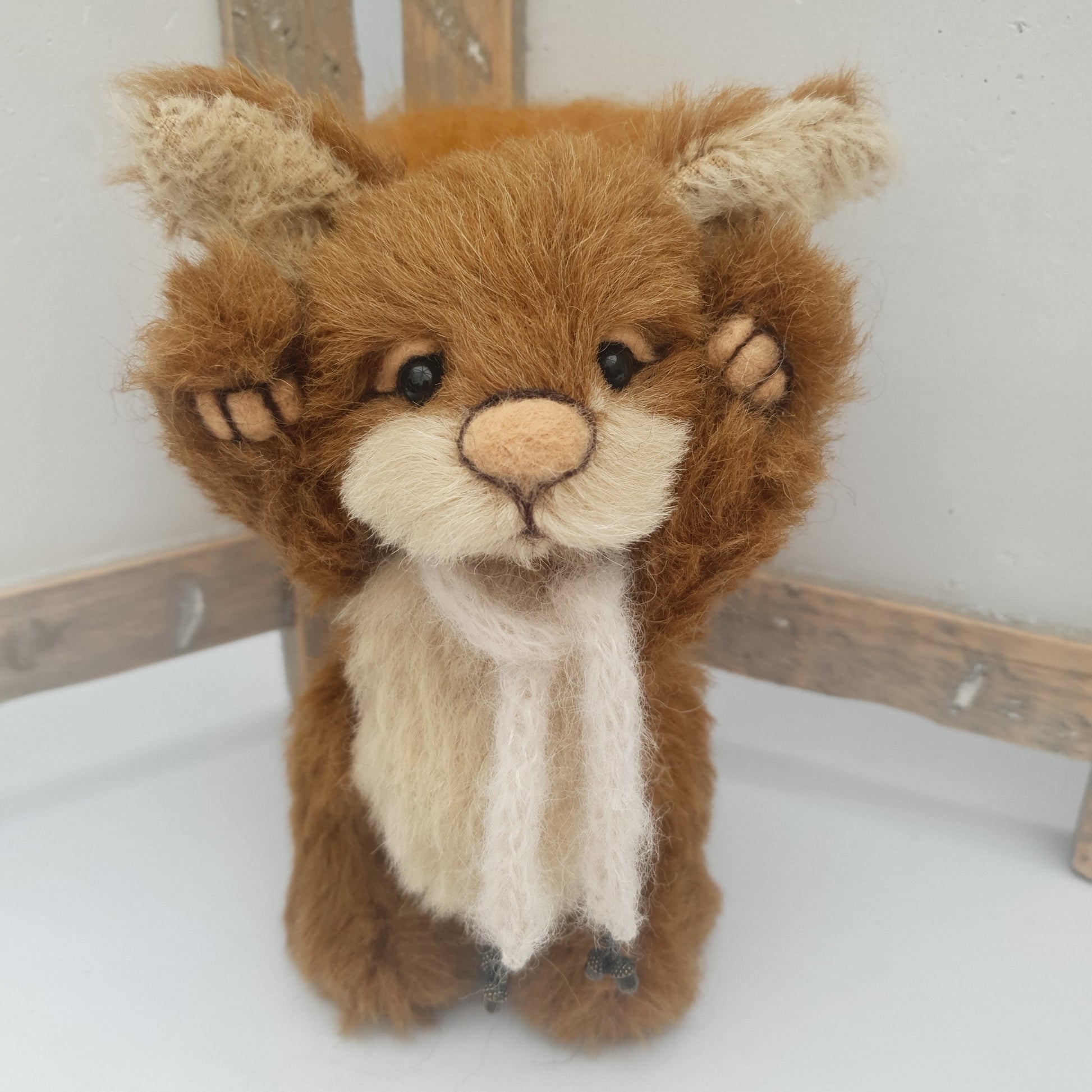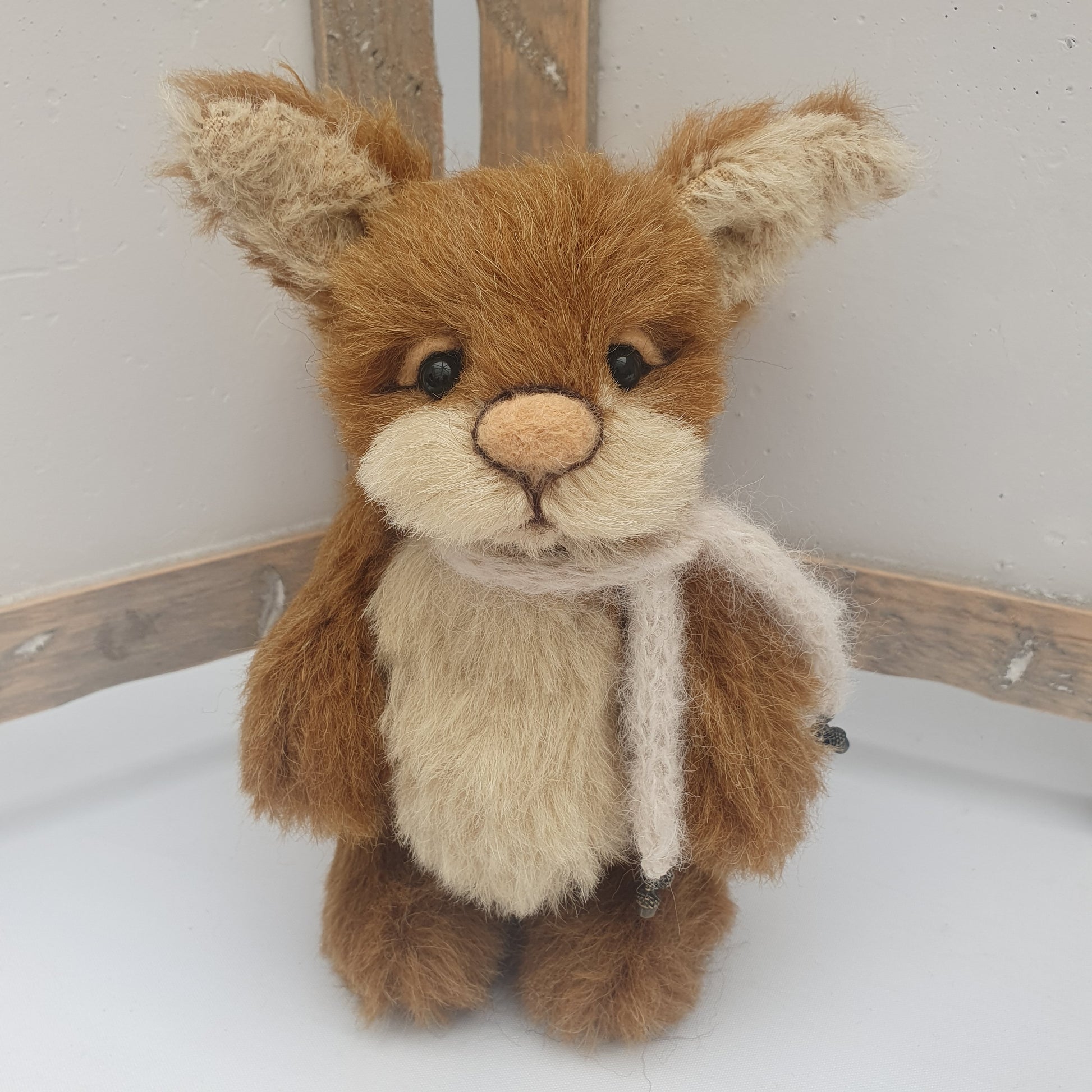 Decorated with an ivory alpaca wool knitted ribbon scarf, decorated with little metal acorn charms, his name is Mr Squirrel.