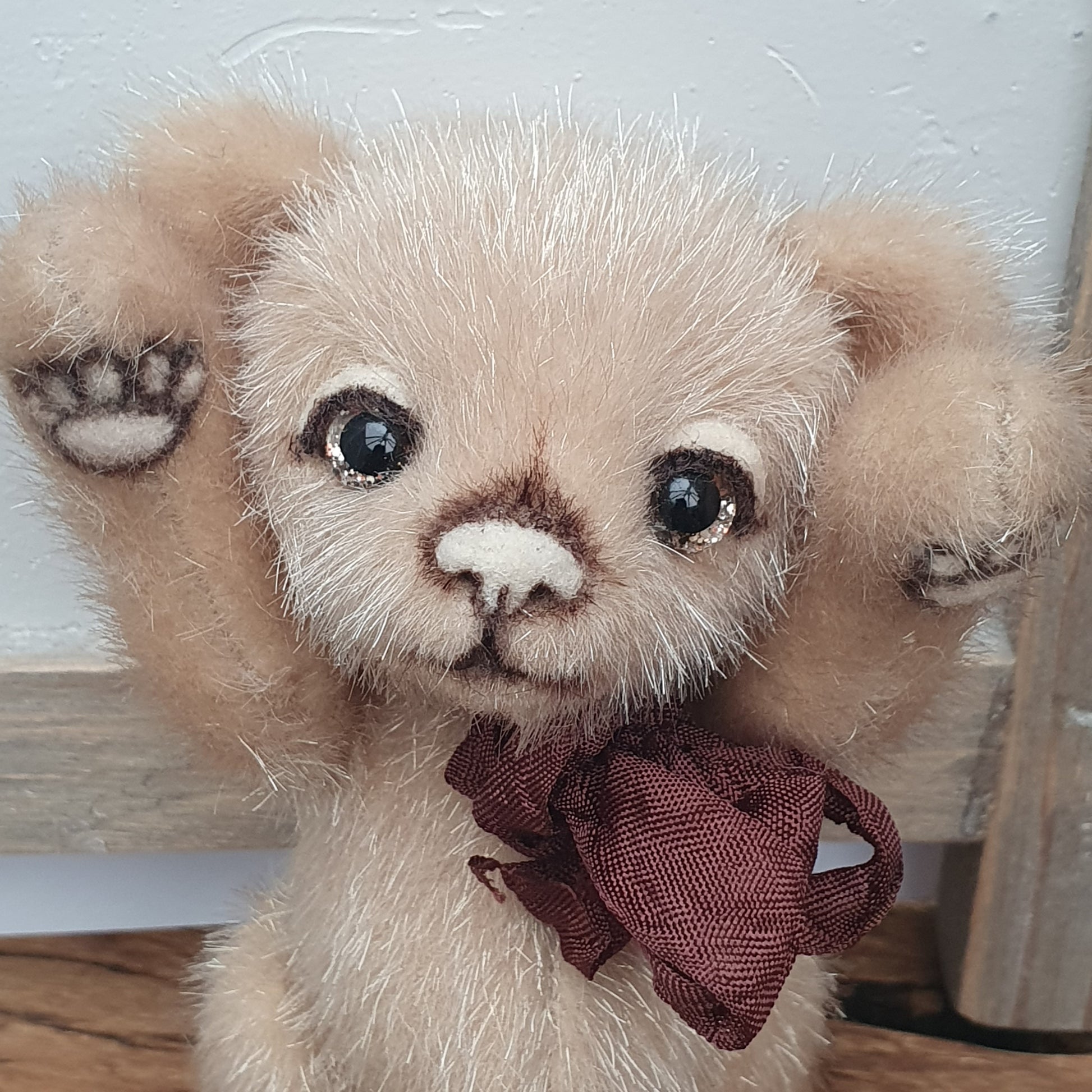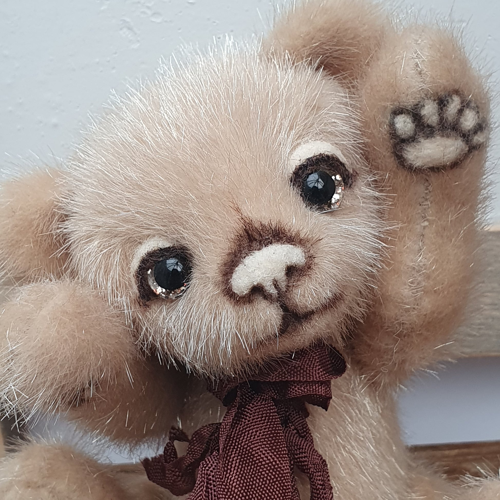 His paw-pads, nose and eyelids are all needle felted using merino wool in a complementary ivory colour with brown shading and his glass eyes are hand-painted with a golden glitter effect to them.