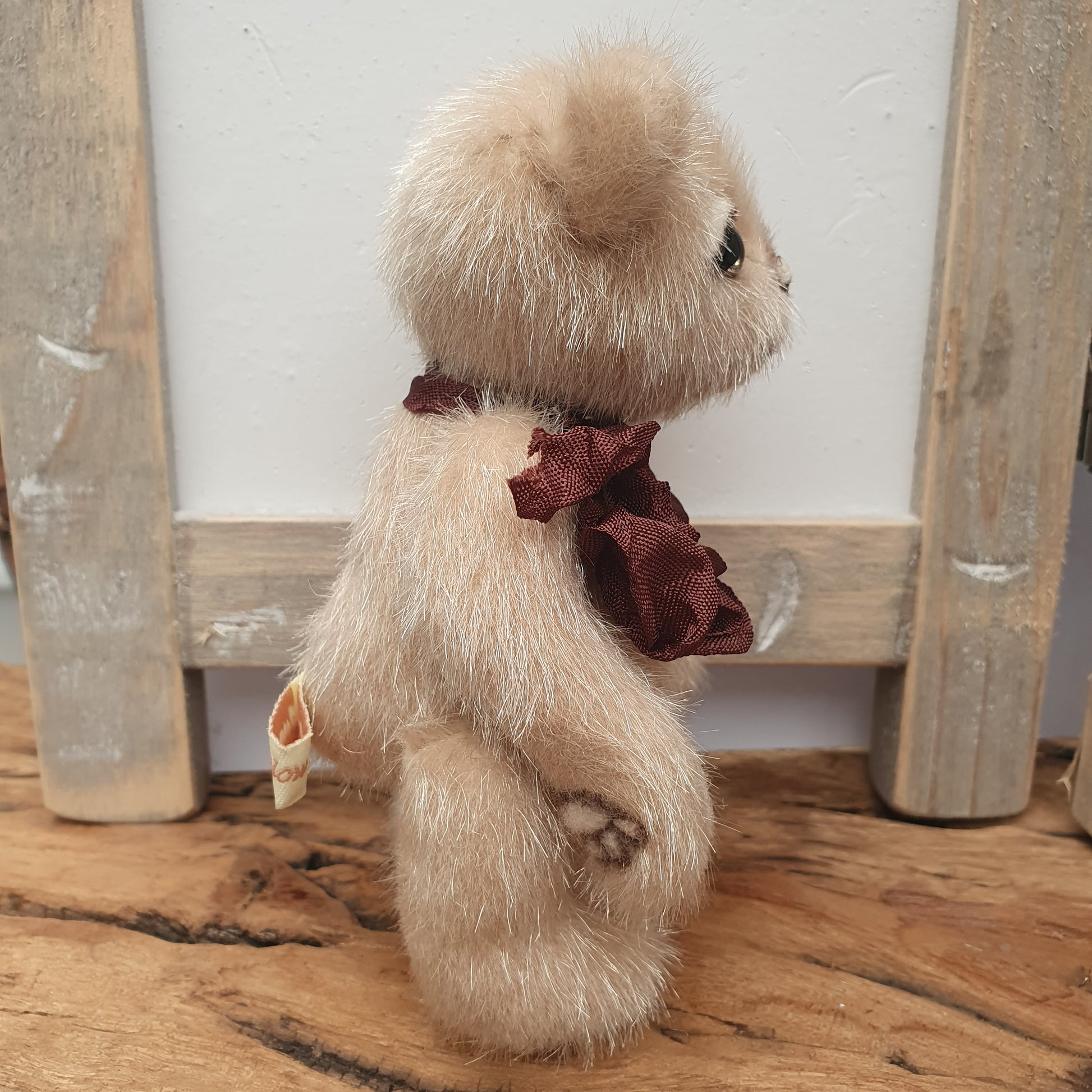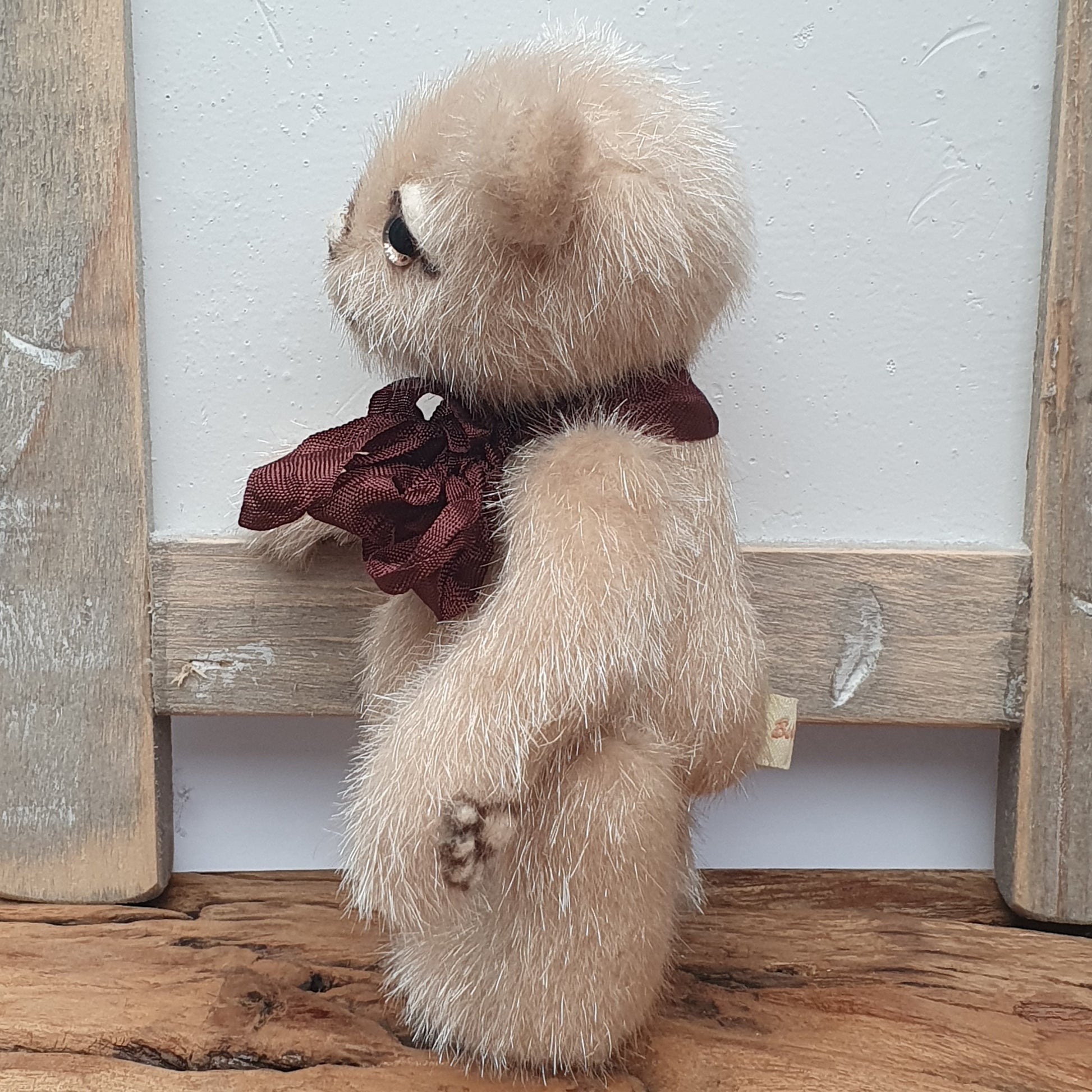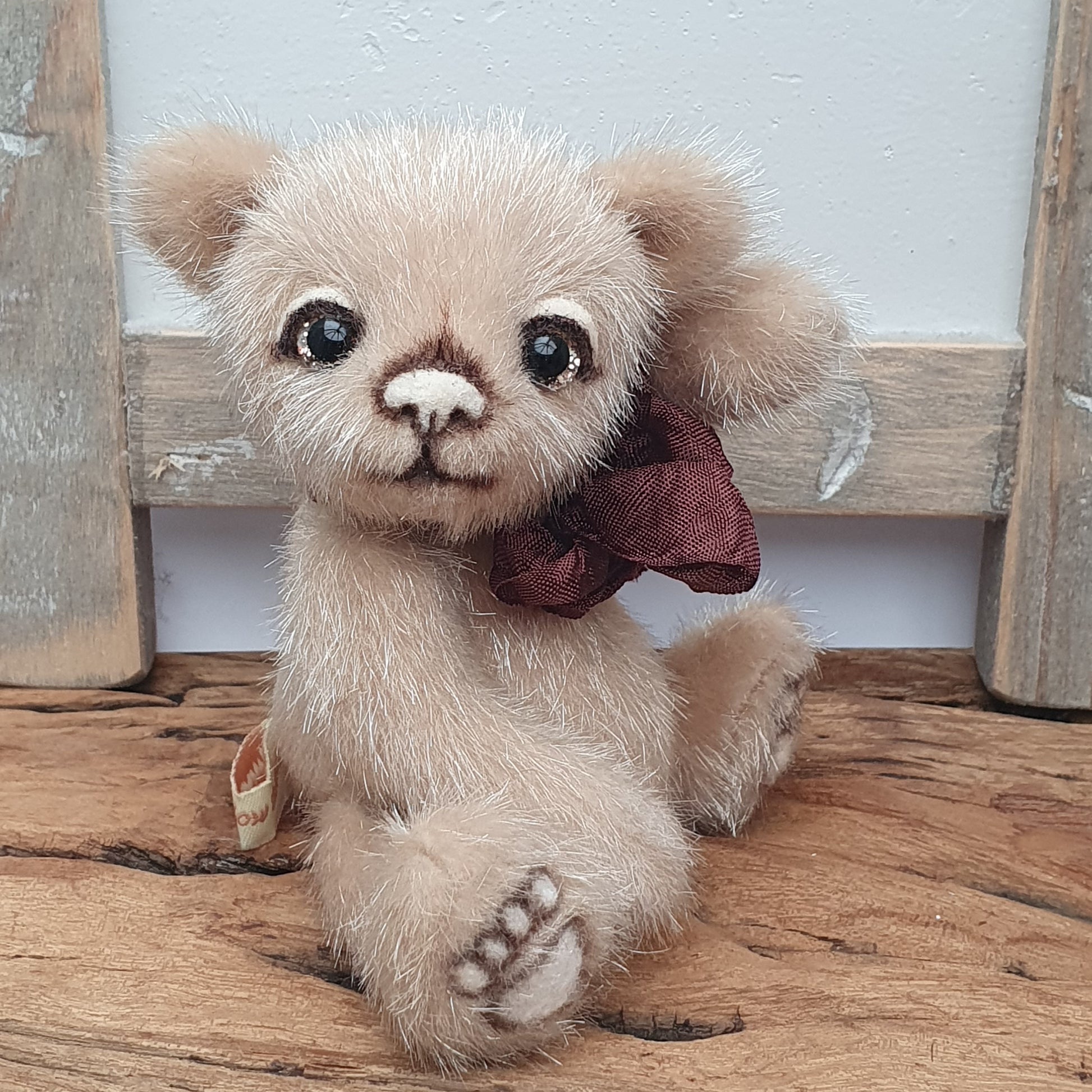 Handsewn from a soft ivory beige short pile faux fur, he is 5 way cotter-pin jointed and stuffed with a mix of synthetic fibre fill and real wool and slightly weighted to his tummy with stainless steel shot pellets.