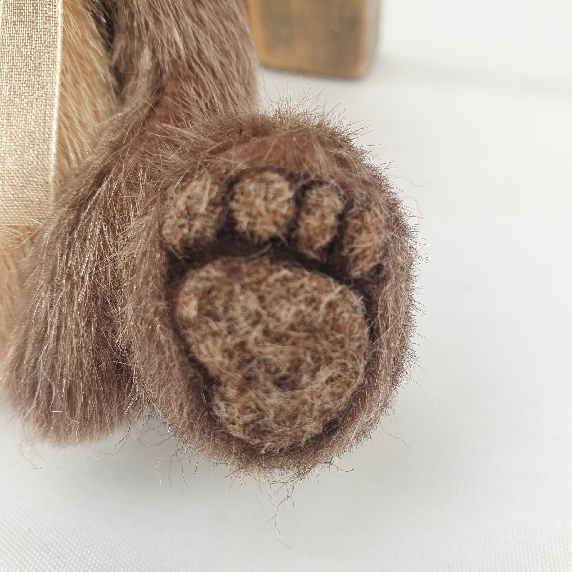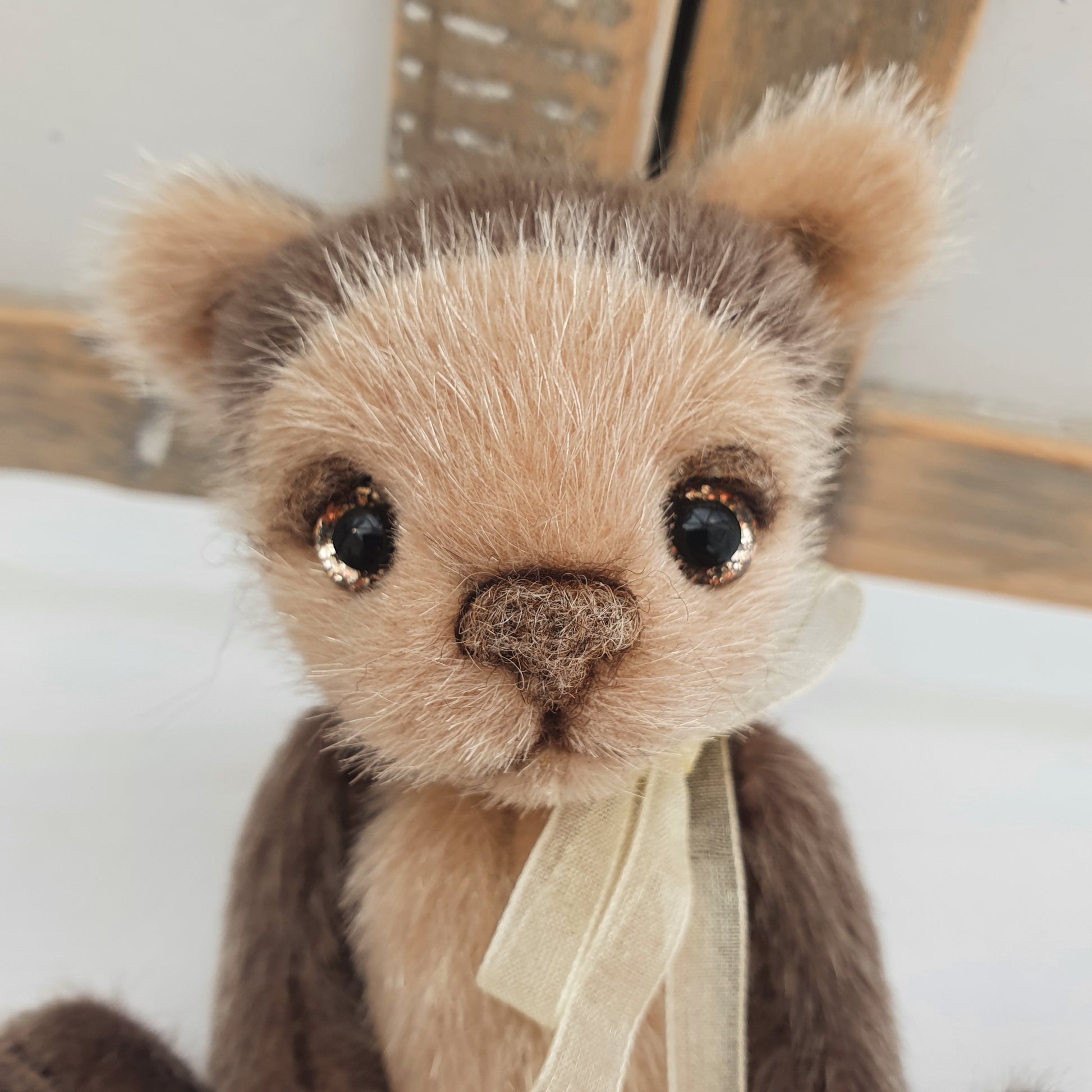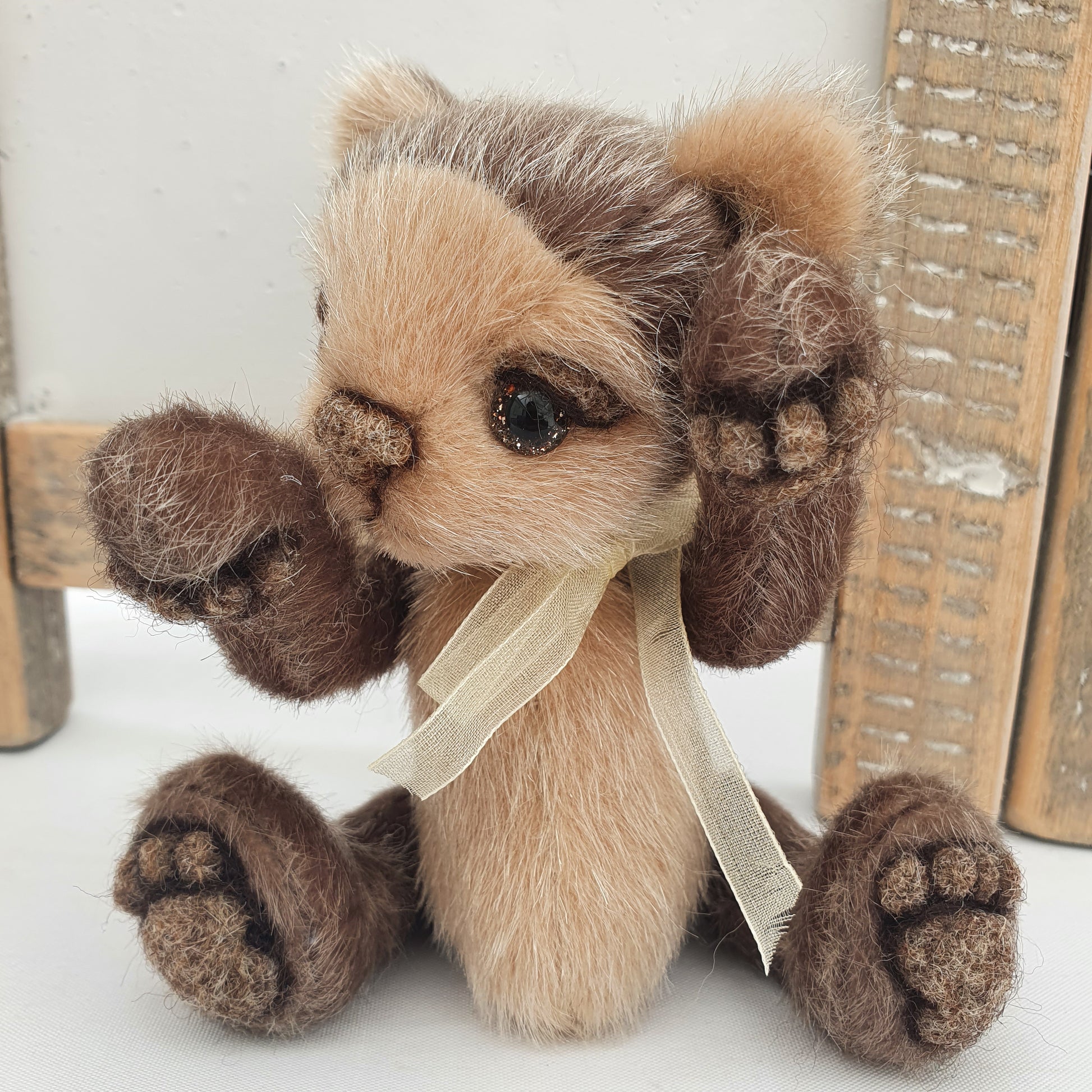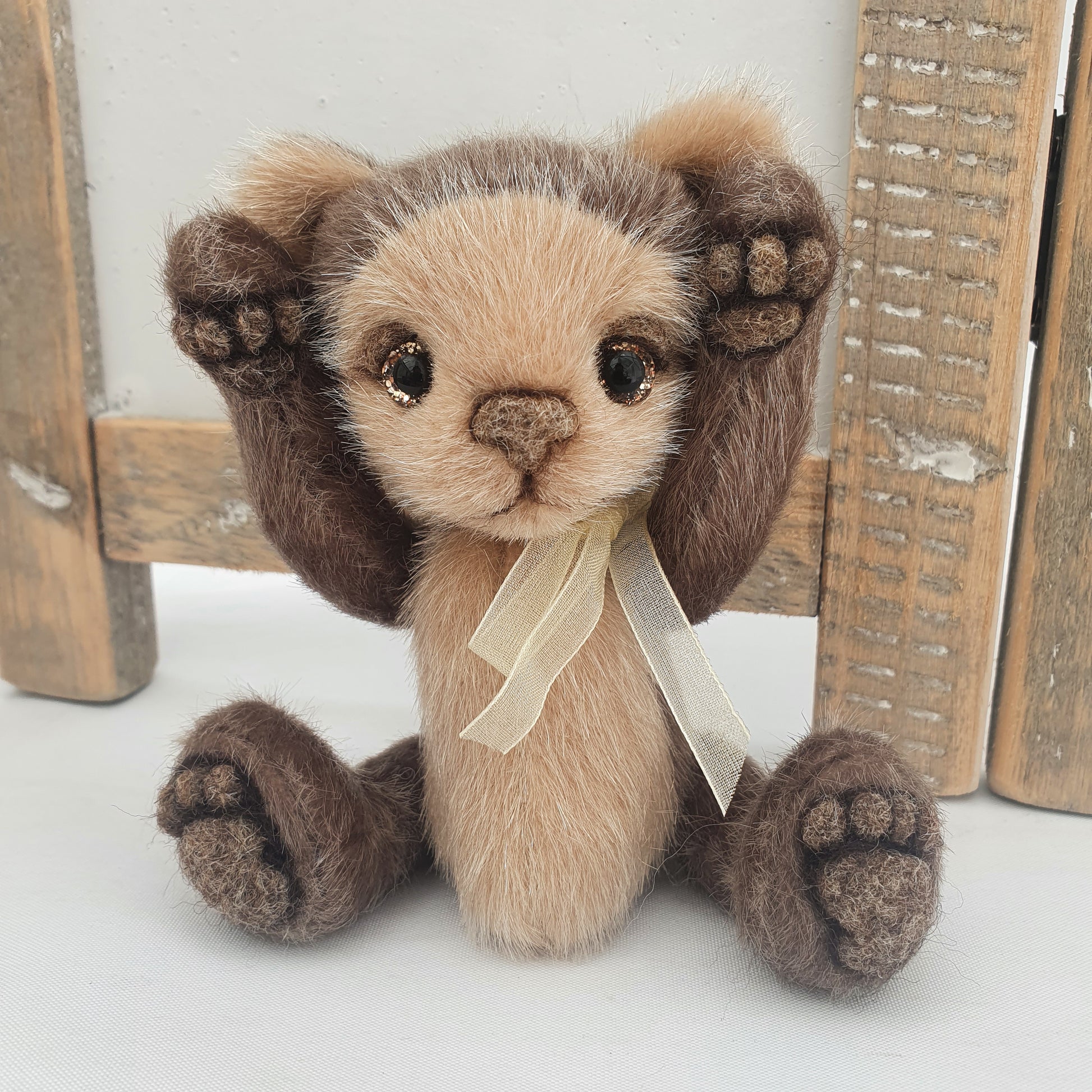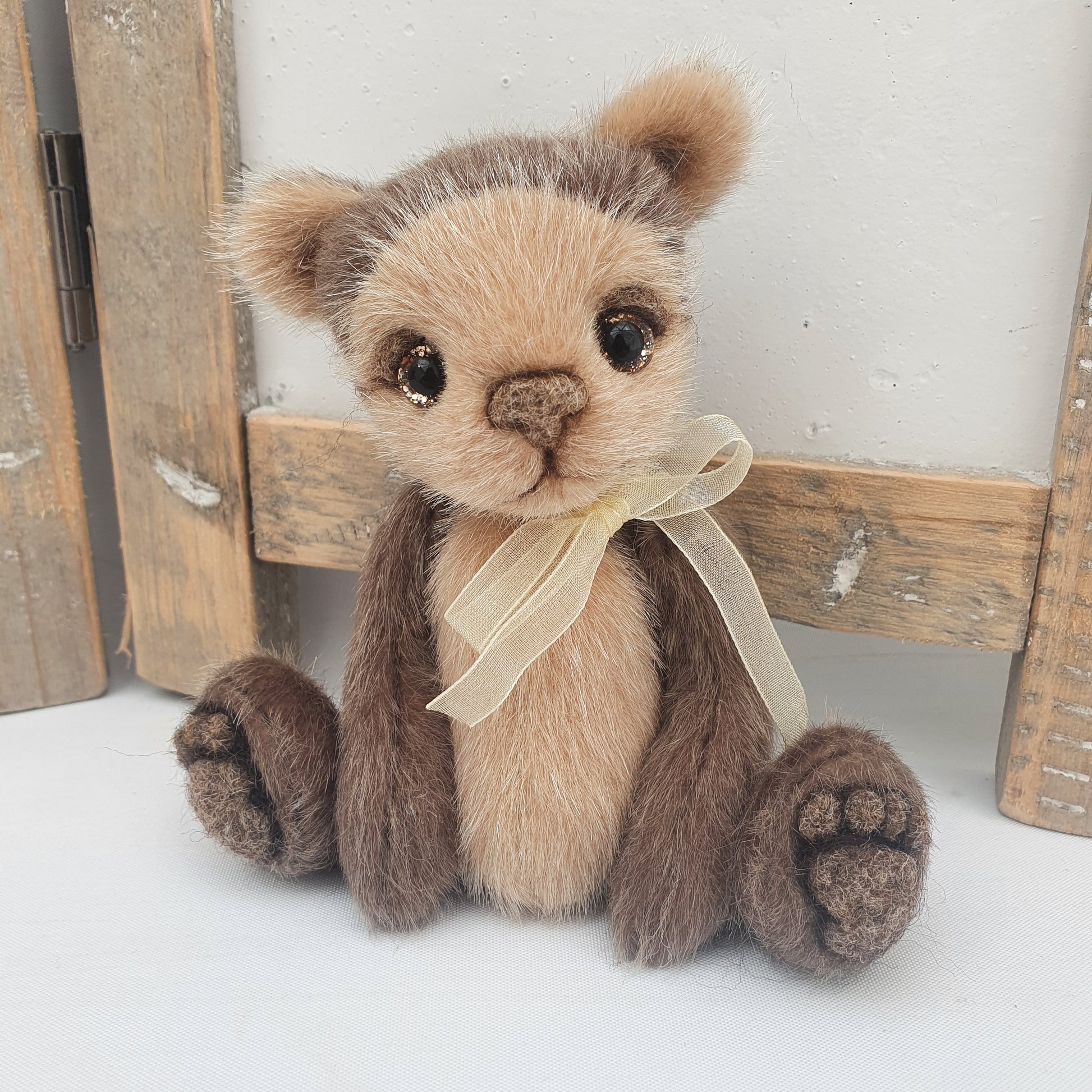 His paw-pads, nose and eyelids are all needle felted using alpaca wool in a complementary natural brown shading and his glass eyes are hand-painted with a golden glitter effect to them. He also has a little tail.