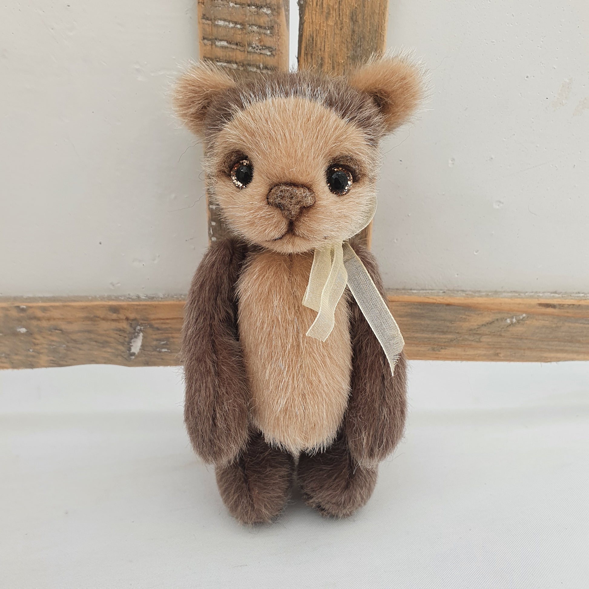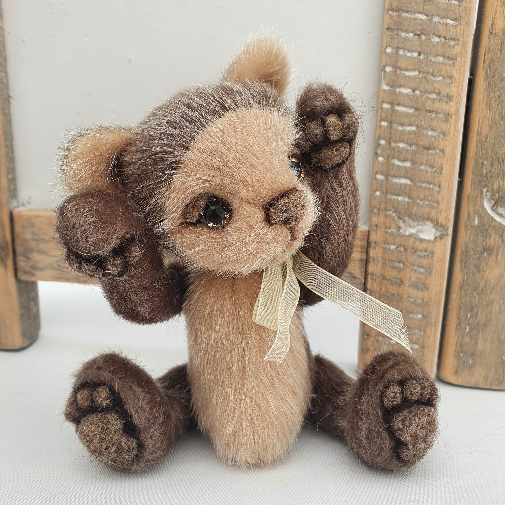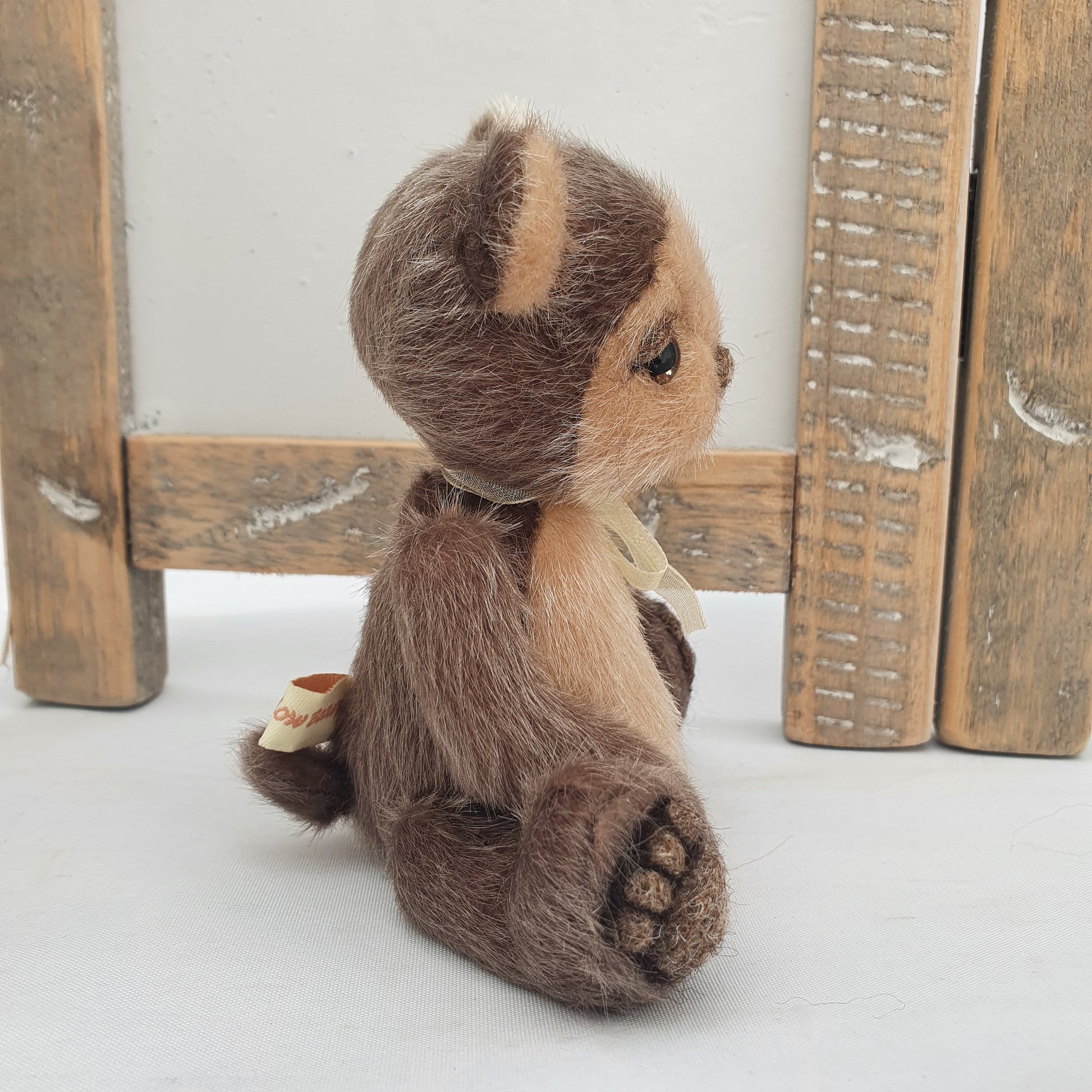 Handsewn from a glistening tipped beige and dark brown synthetic faux fur, he is 5 way cotter-pin jointed and stuffed with a synthetic fibre fill stuffing and weighted to his tummy with stainless steel shot pellets.