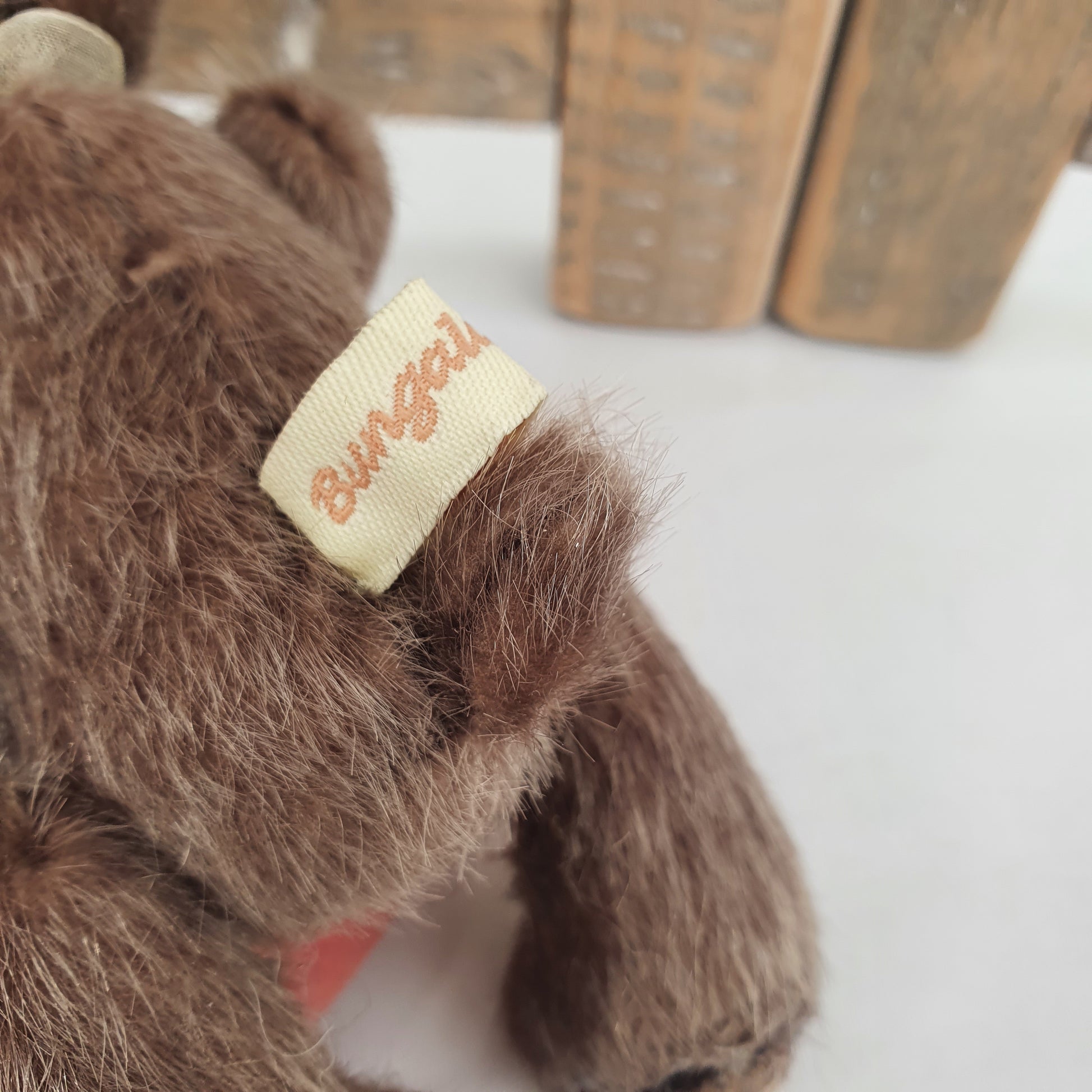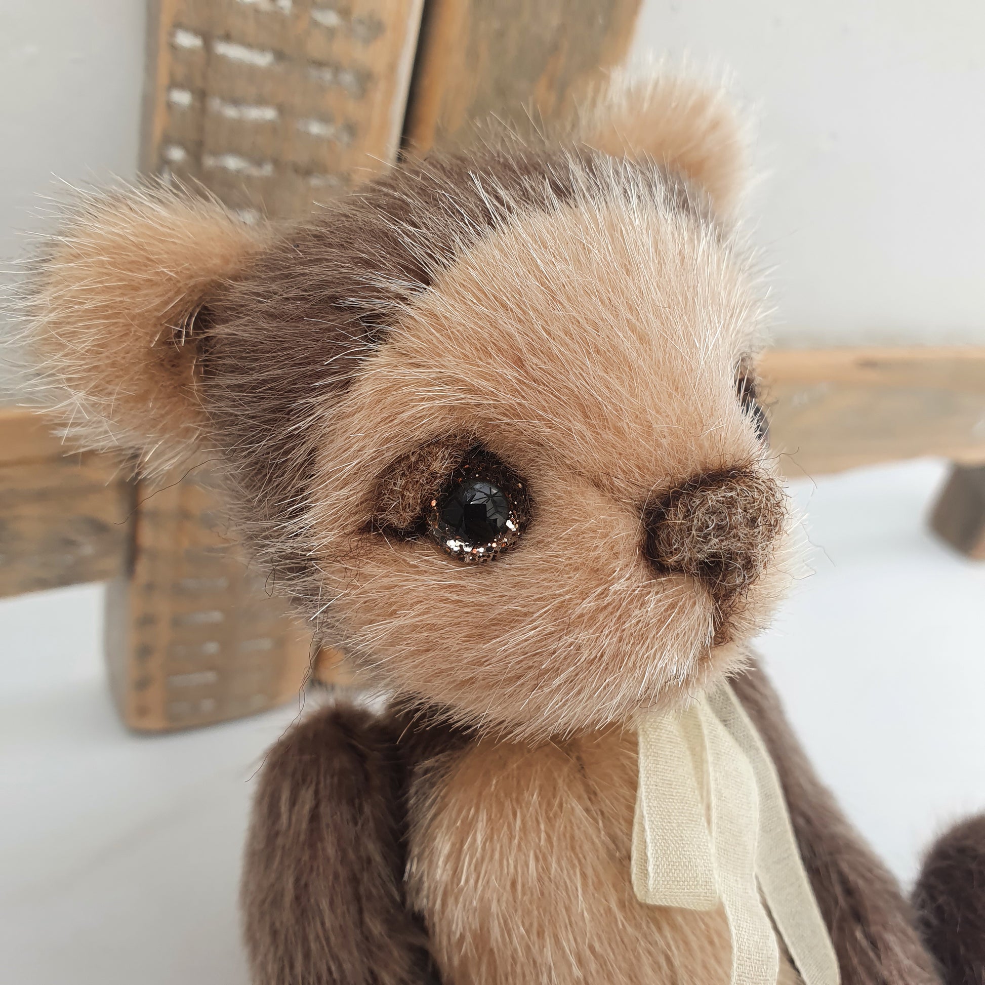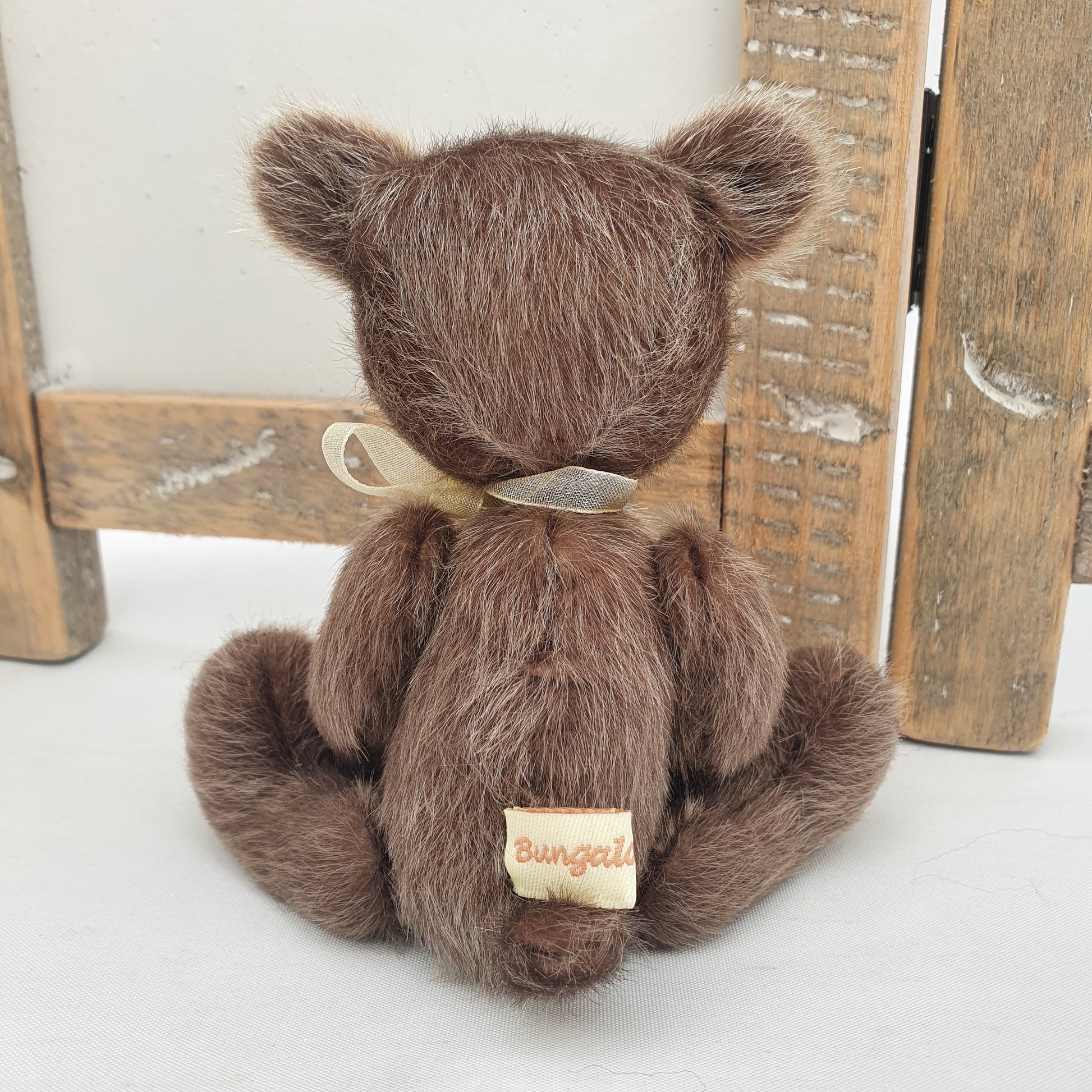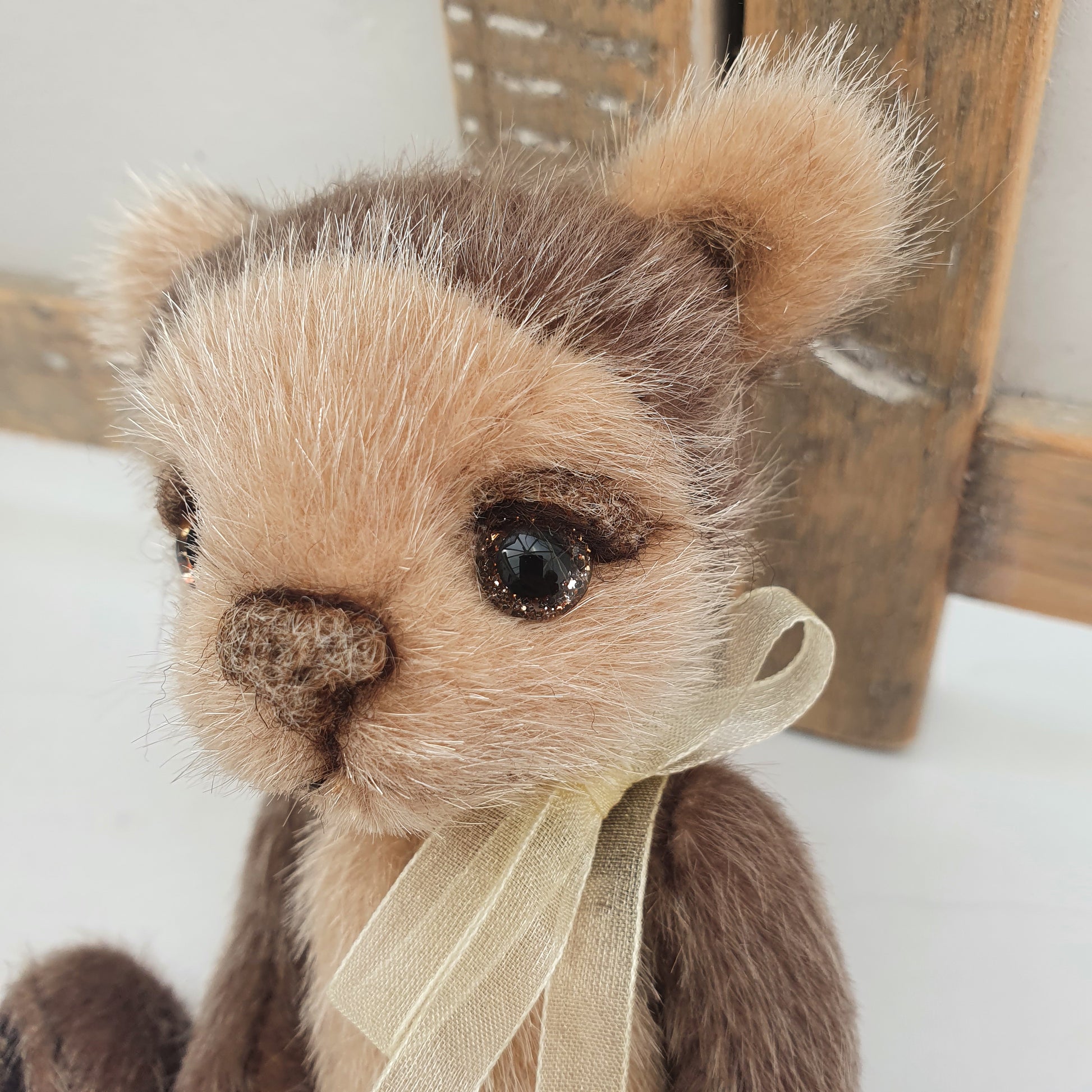Handsewn from a glistening tipped beige and dark brown synthetic faux fur, he is 5 way cotter-pin jointed and stuffed with a synthetic fibre fill stuffing and weighted to his tummy with stainless steel shot pellets.