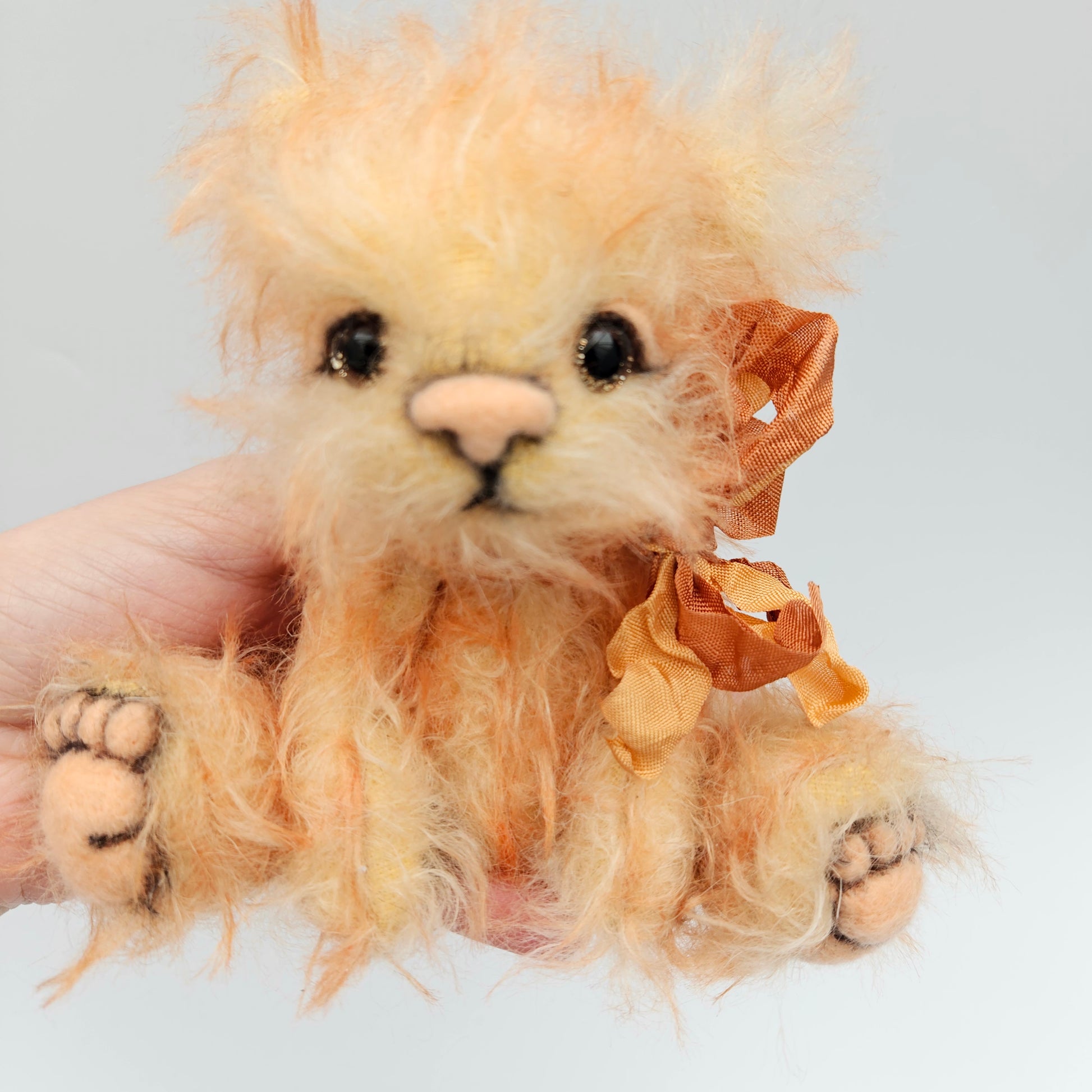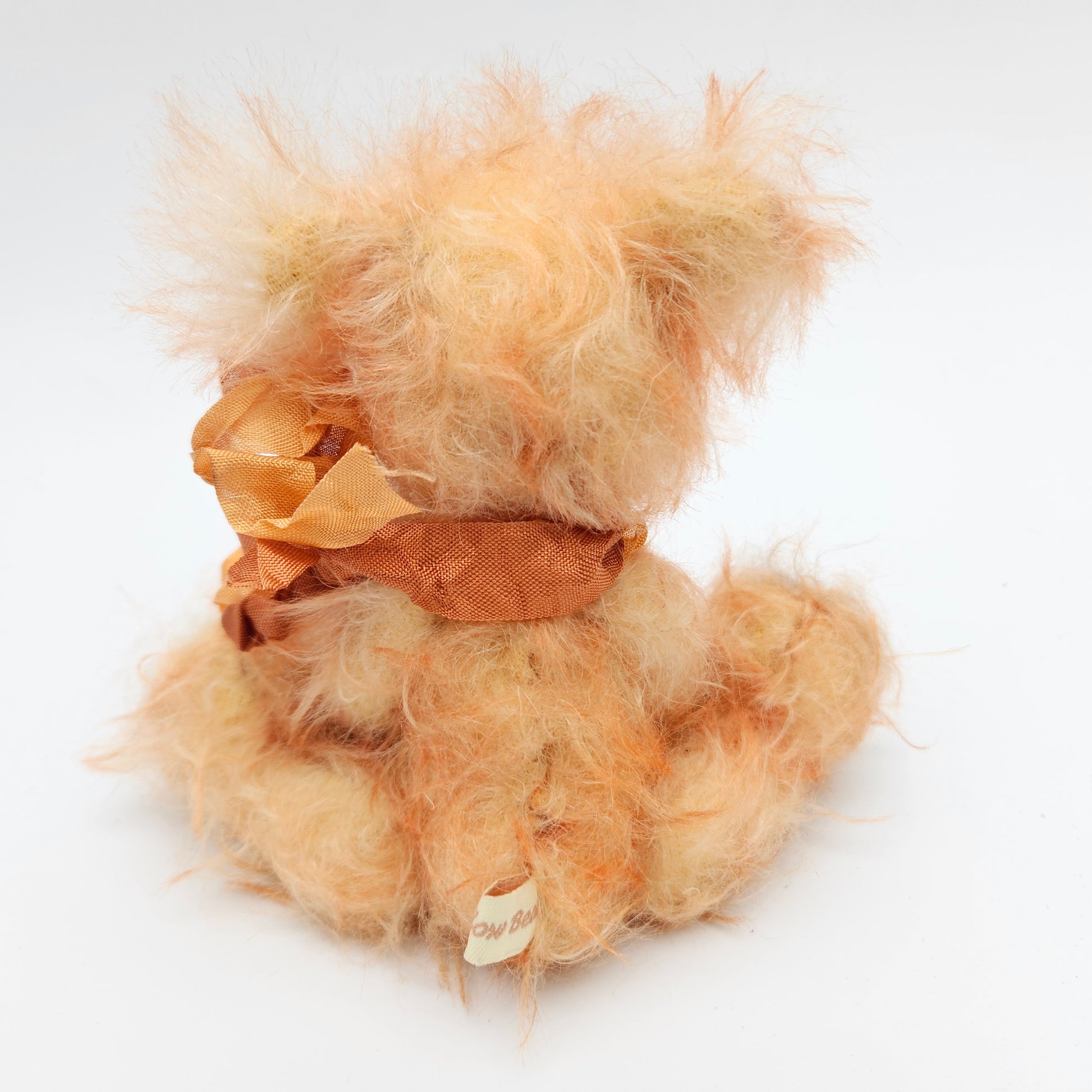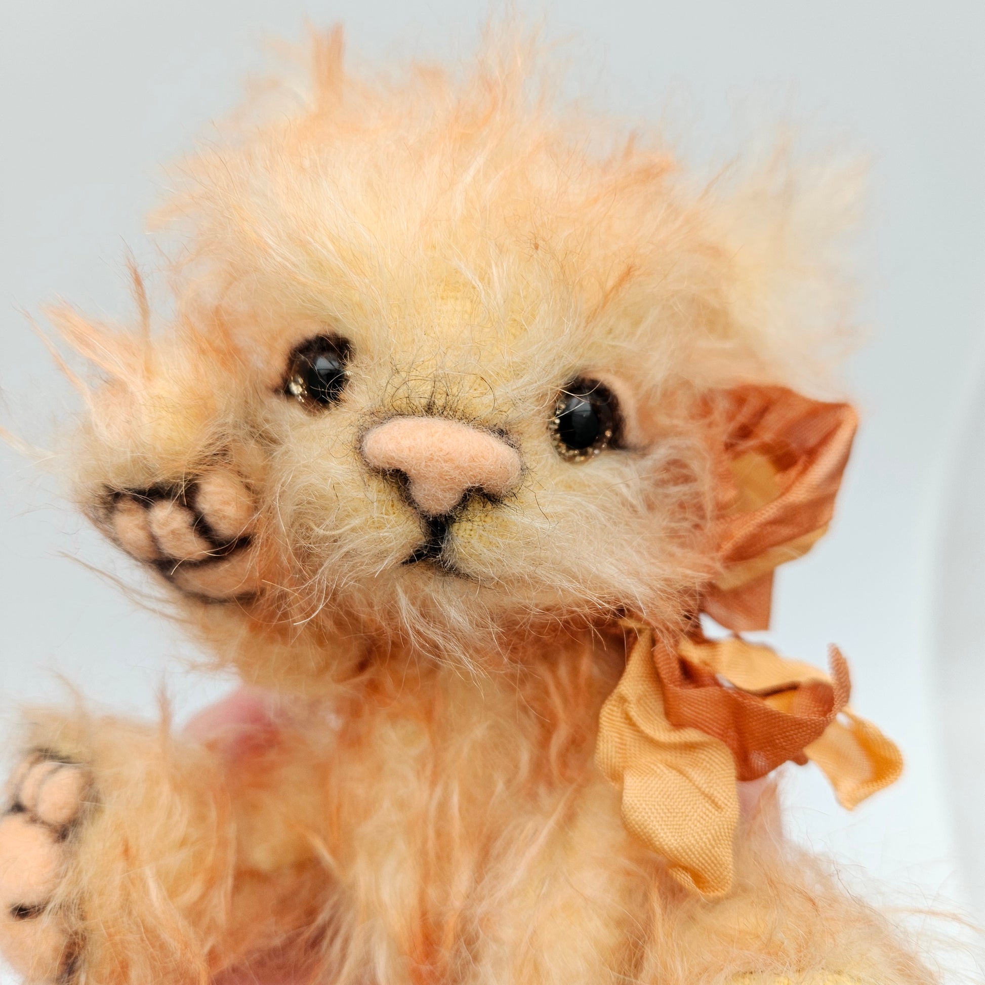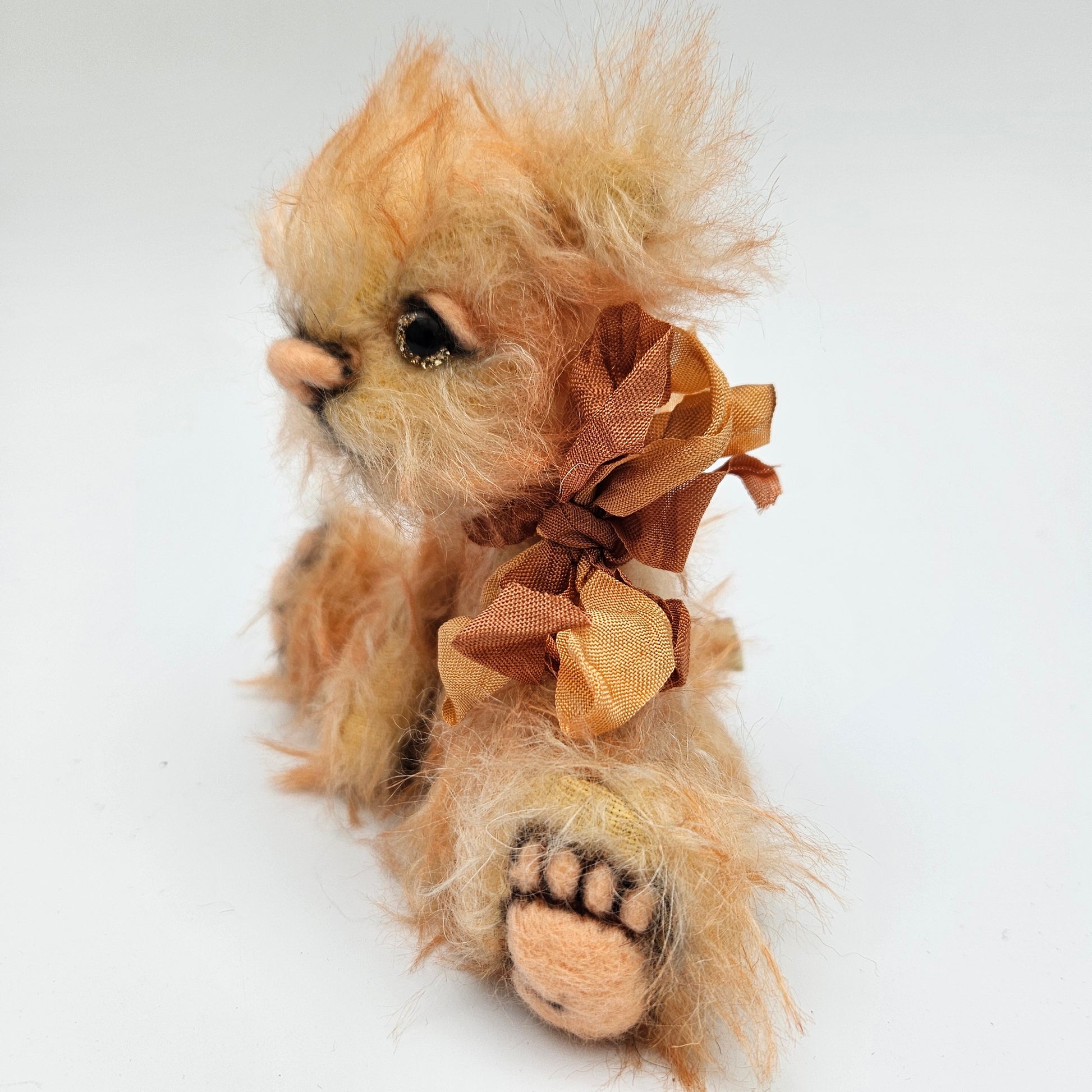 Made from my own original pattern, Firecracker is fully handmade, handsewn, and has been designed by me. Although a sitting bear, with a little positioning and support, Oro is able to stand in an upright position against/beside something, which can be nice to pose amongst a collection, in a display or for photos/diorama.
