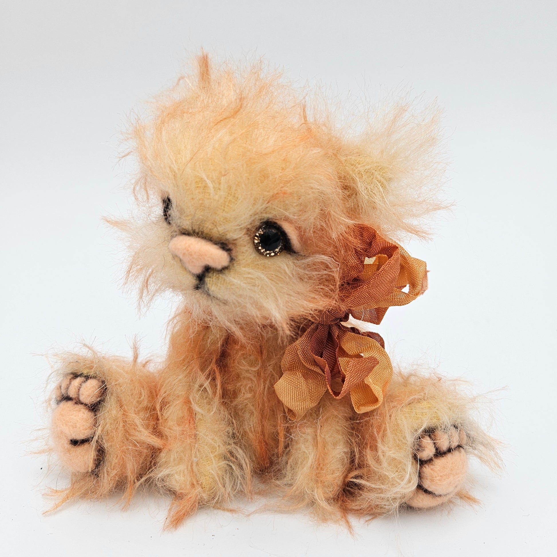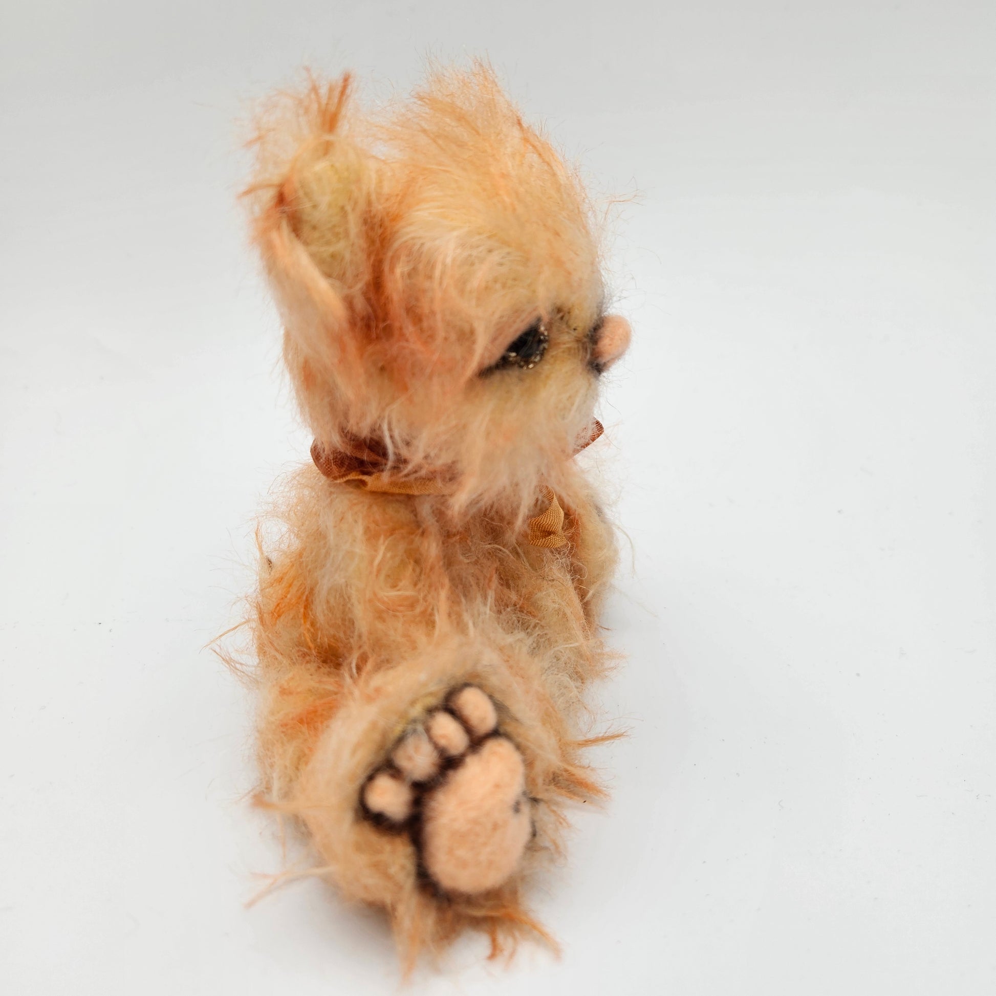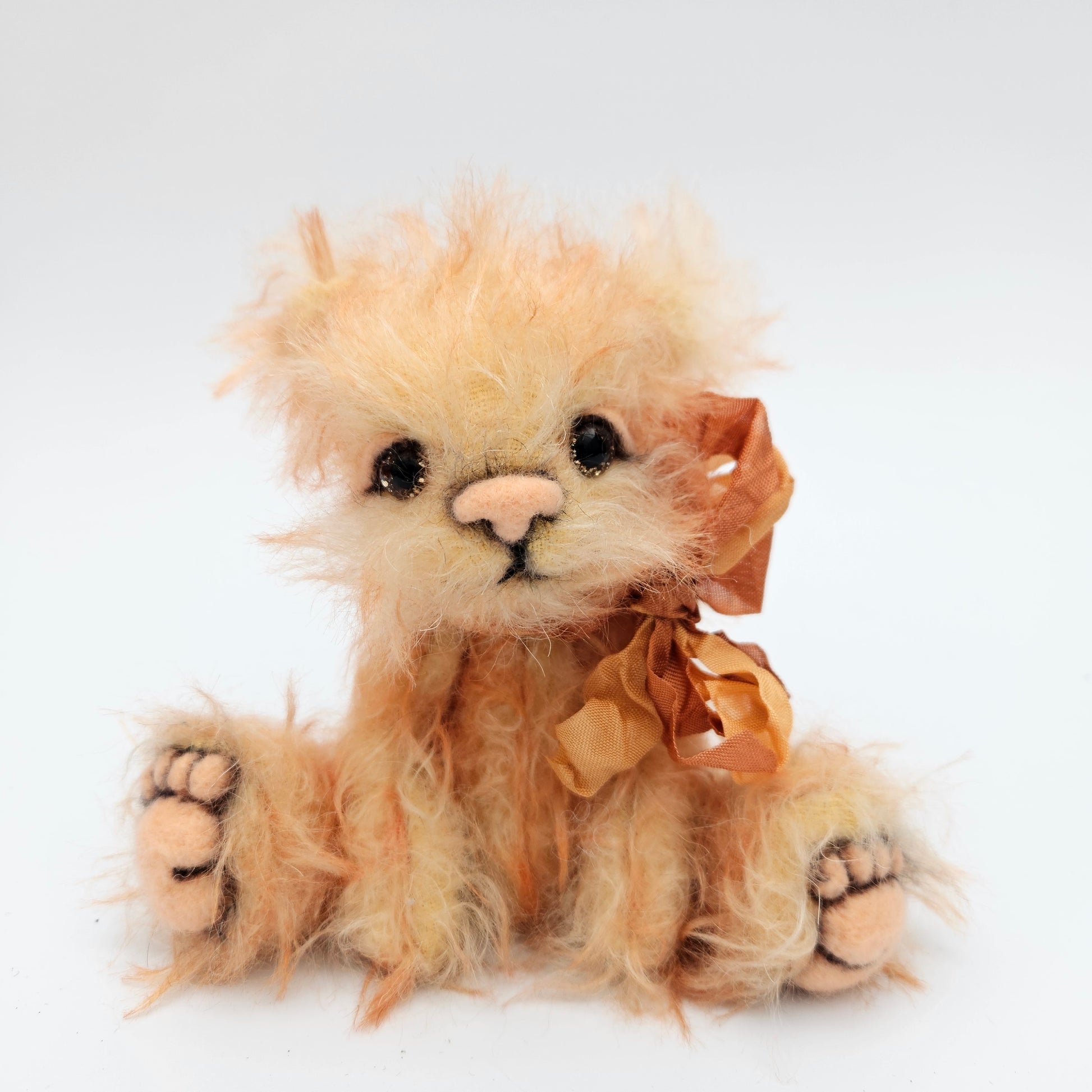 Made from my own original pattern, Firecracker is fully handmade, handsewn, and has been designed by me. Although a sitting bear, with a little positioning and support, Oro is able to stand in an upright position against/beside something, which can be nice to pose amongst a collection, in a display or for photos/diorama.