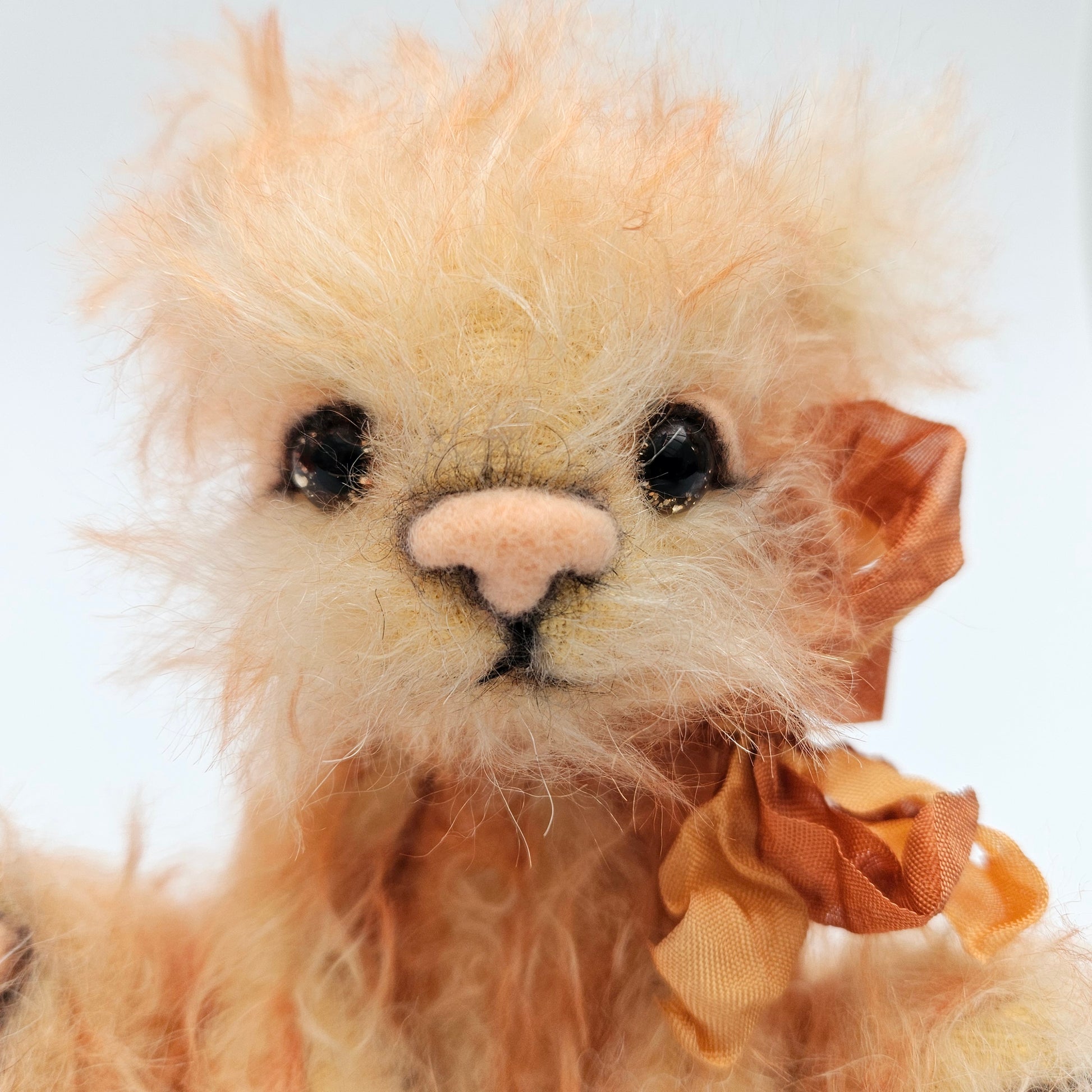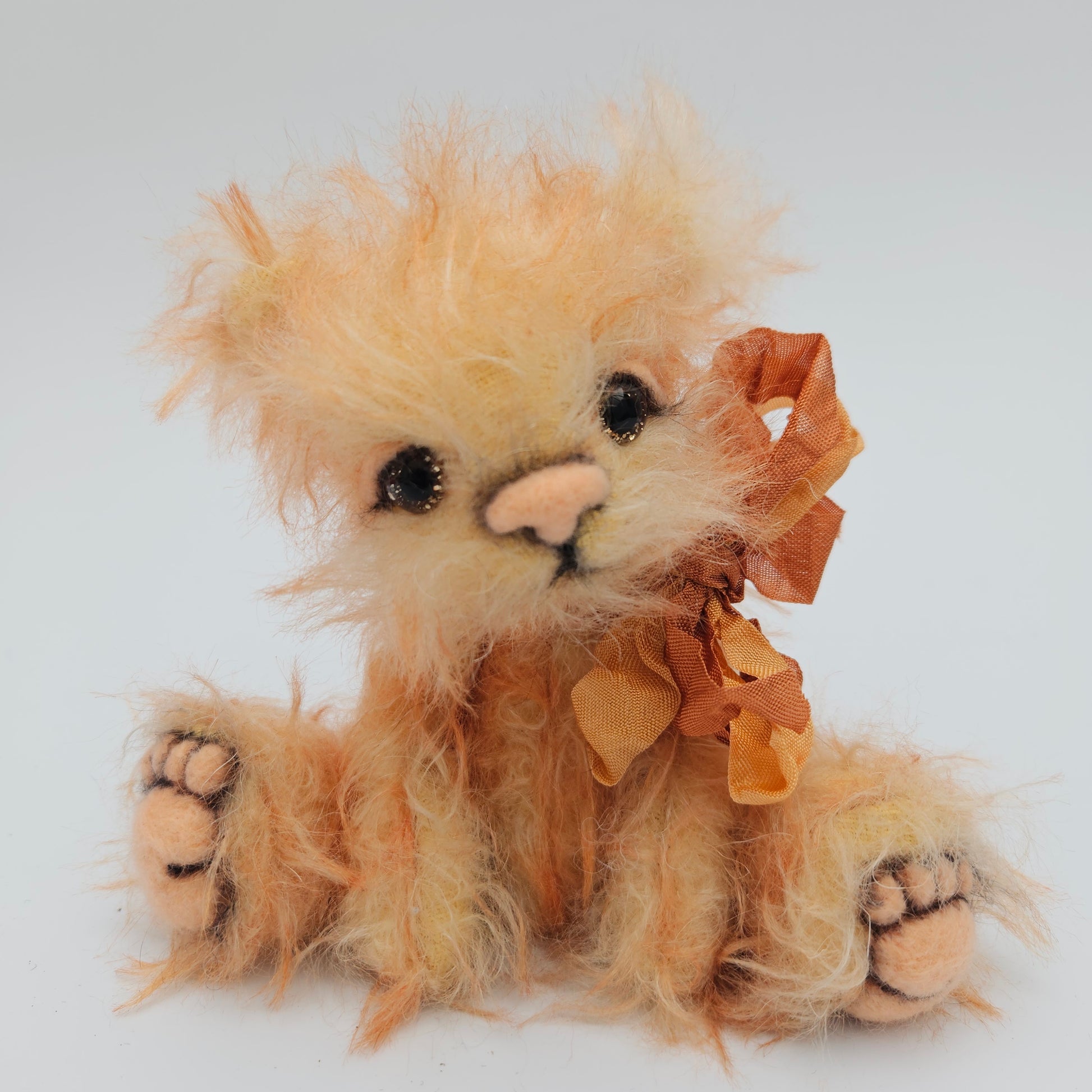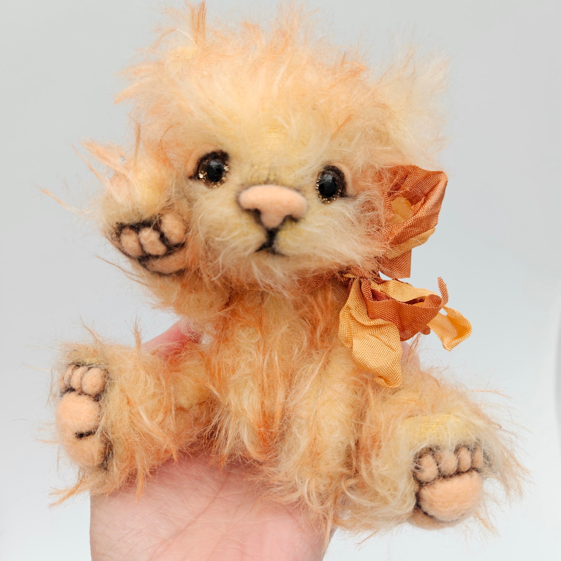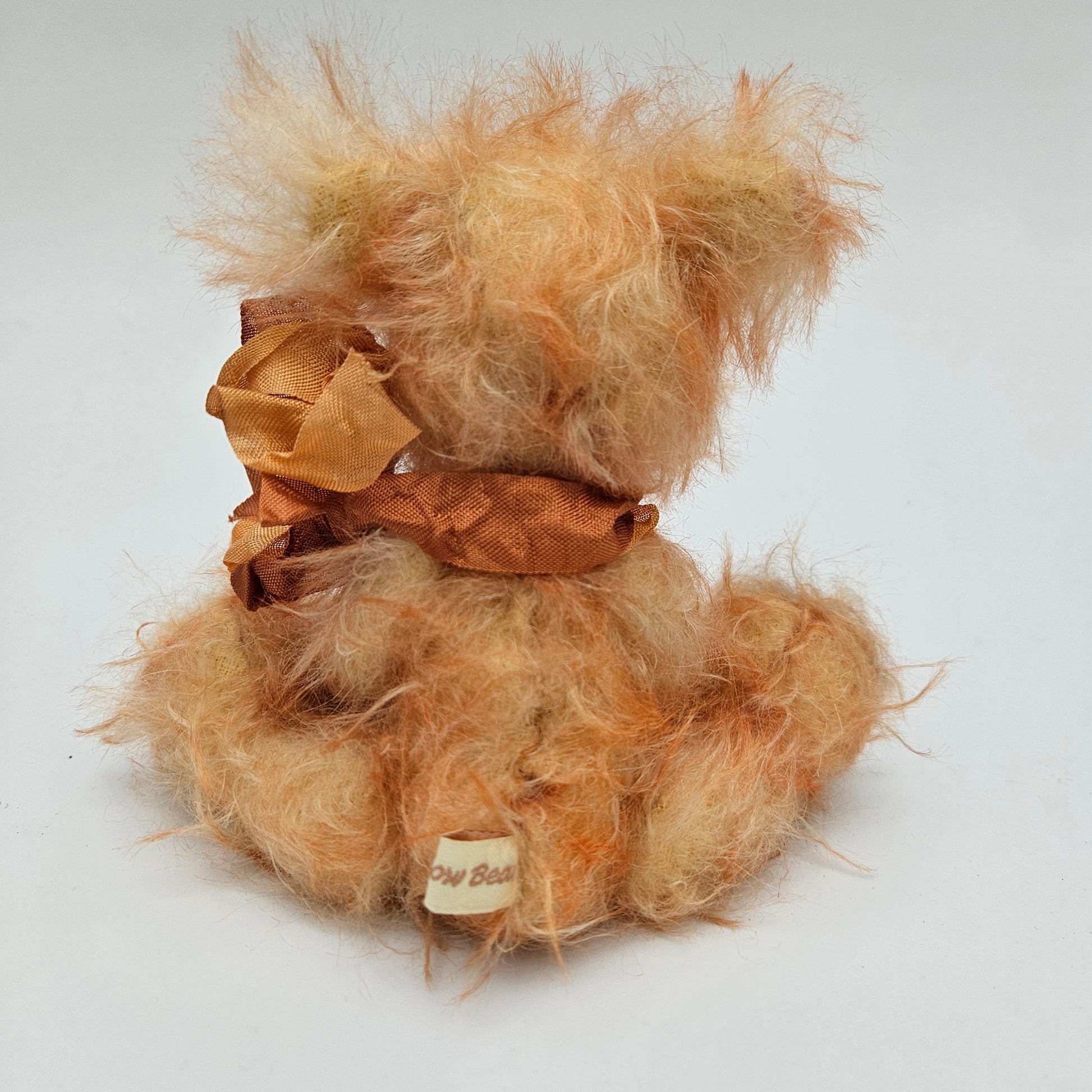 Made from my own original pattern, Firecracker is fully handmade, handsewn, and has been designed by me. Although a sitting bear, with a little positioning and support, Oro is able to stand in an upright position against/beside something, which can be nice to pose amongst a collection, in a display or for photos/diorama.