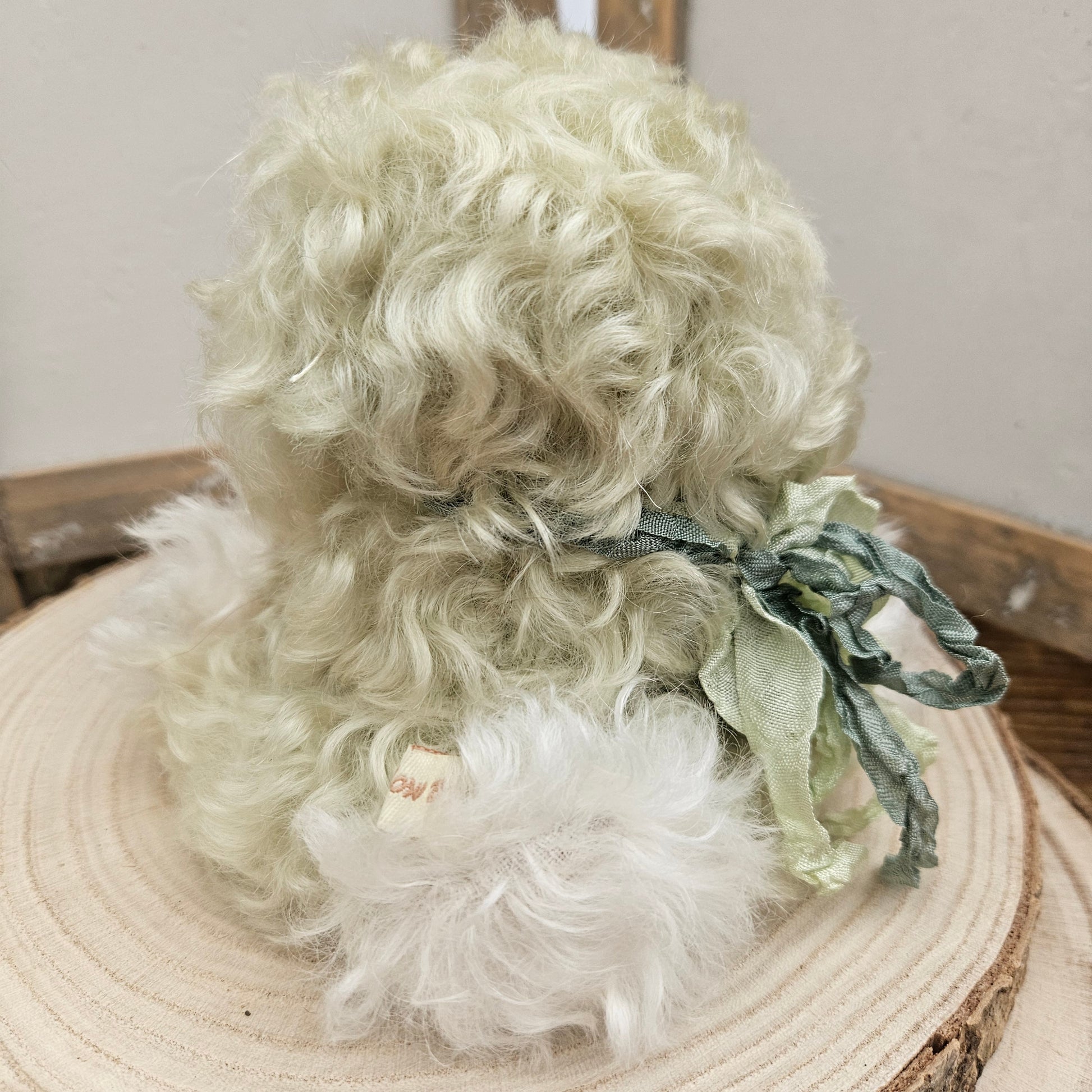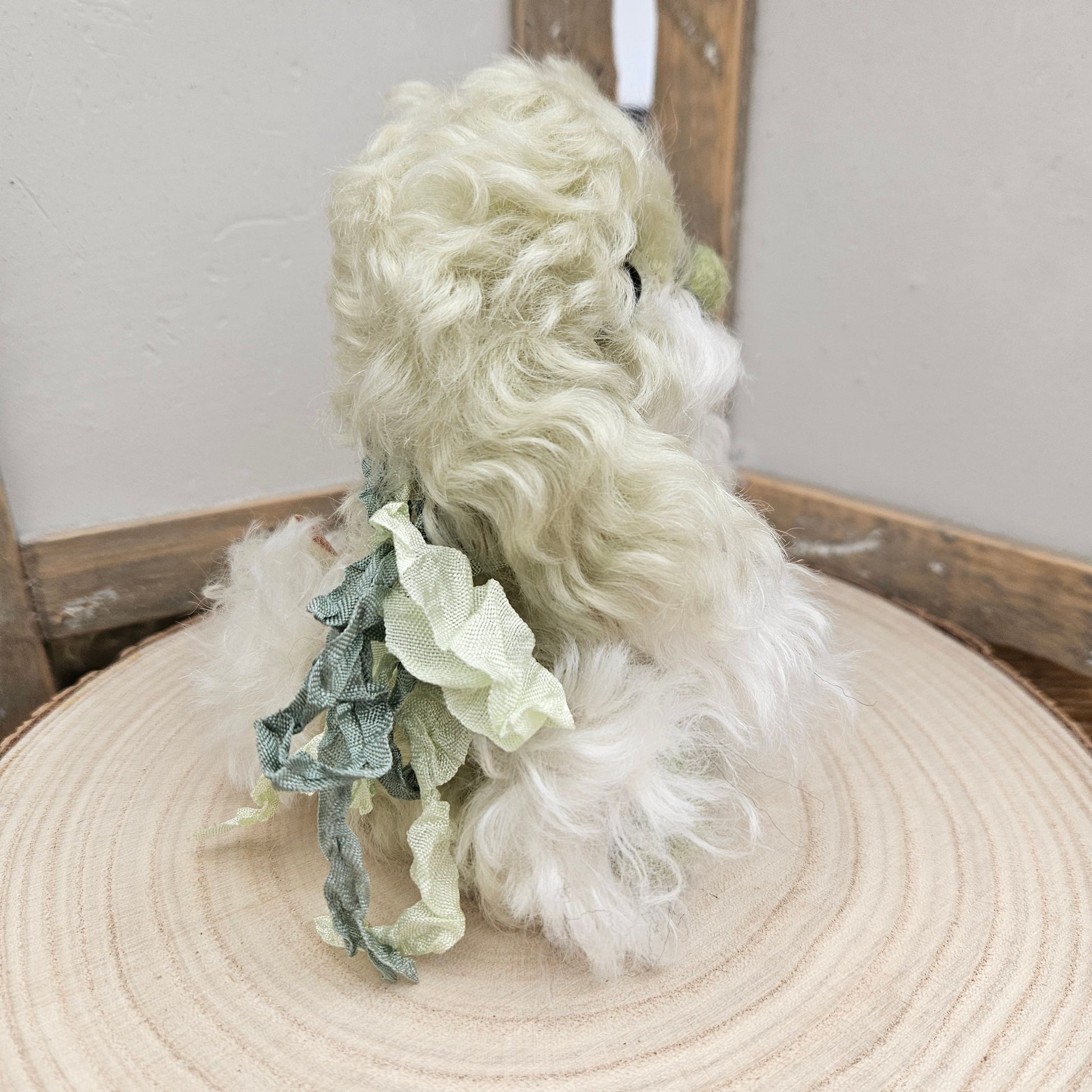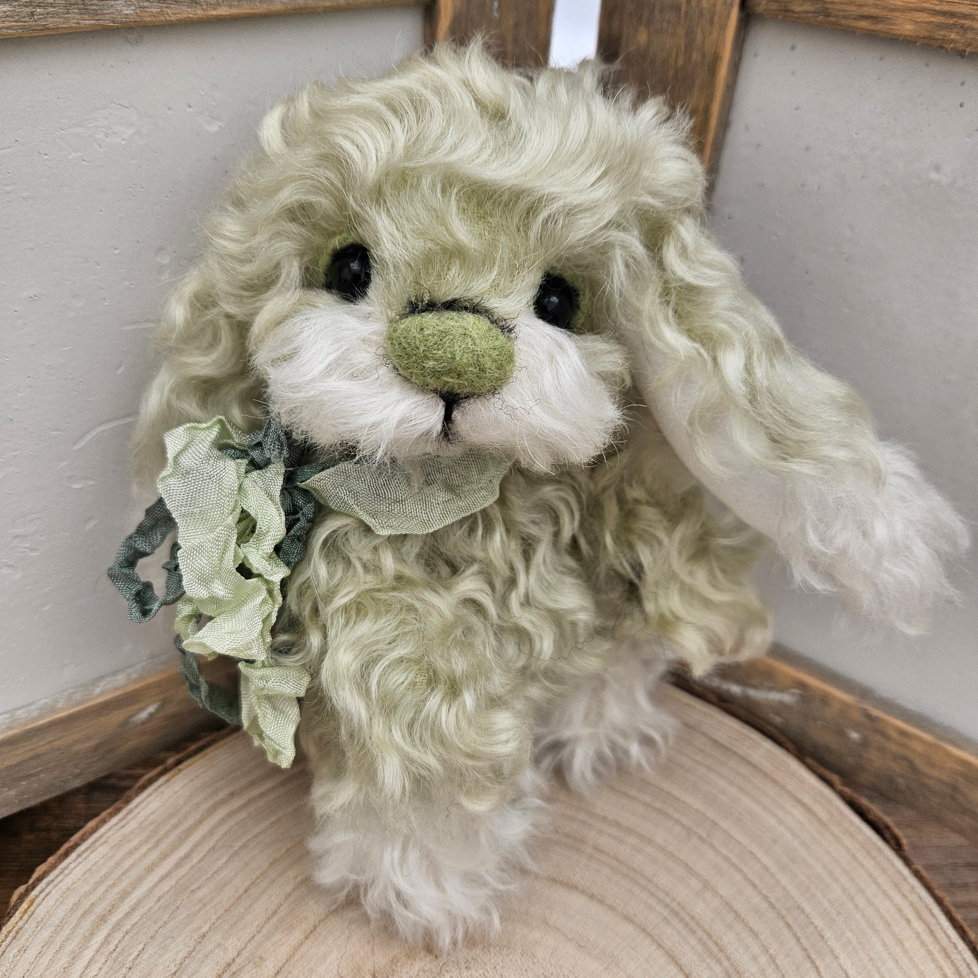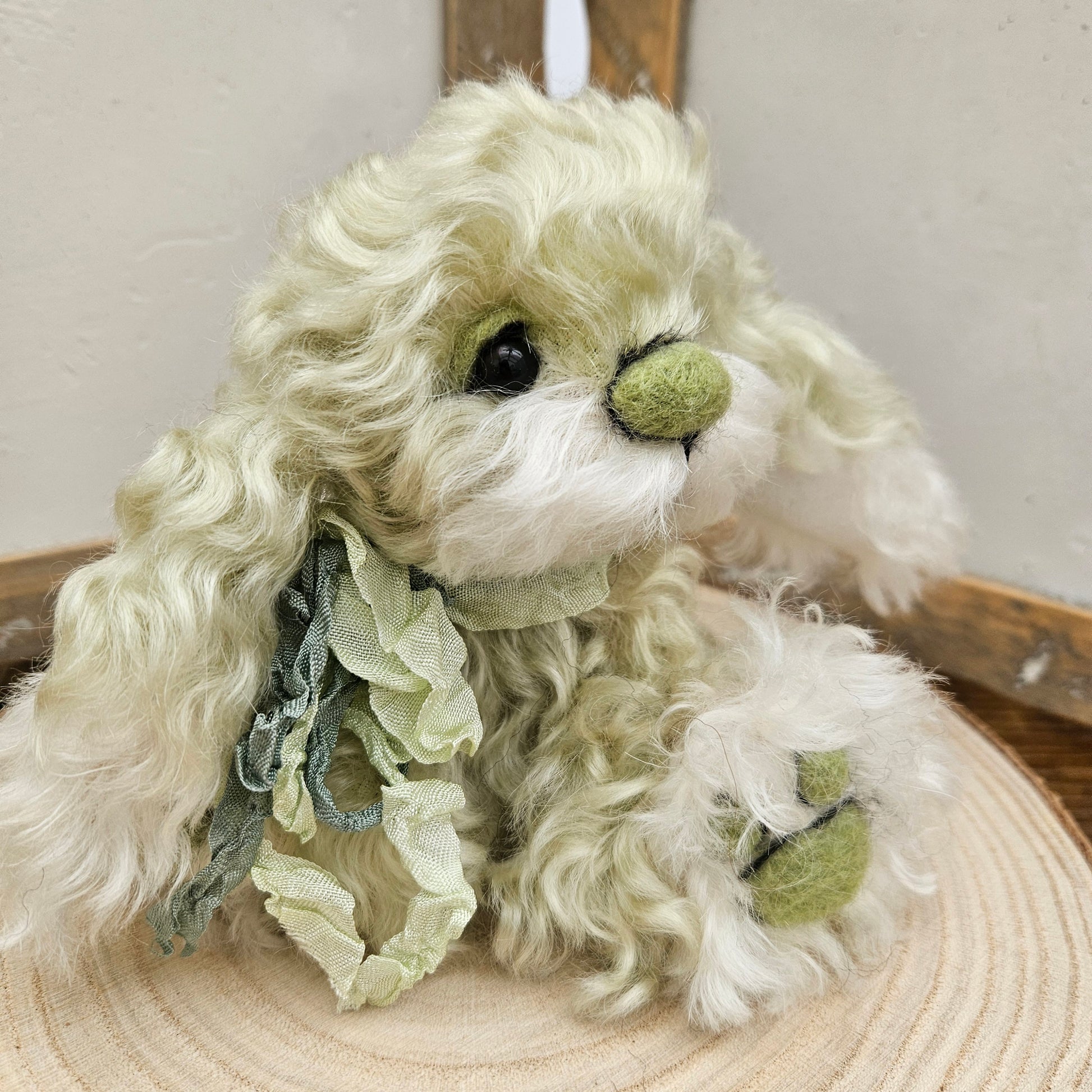 Made from my own original pattern, Minty is fully handmade, handsewn, and has been designed by me. Although a sitting bear, with a little positioning and support, Minty is able to stand in an upright position against/beside something as in the images which can be nice to pose amongst a collection, in a display or for photos/diorama. He is a little bit of a looser jointed bear.