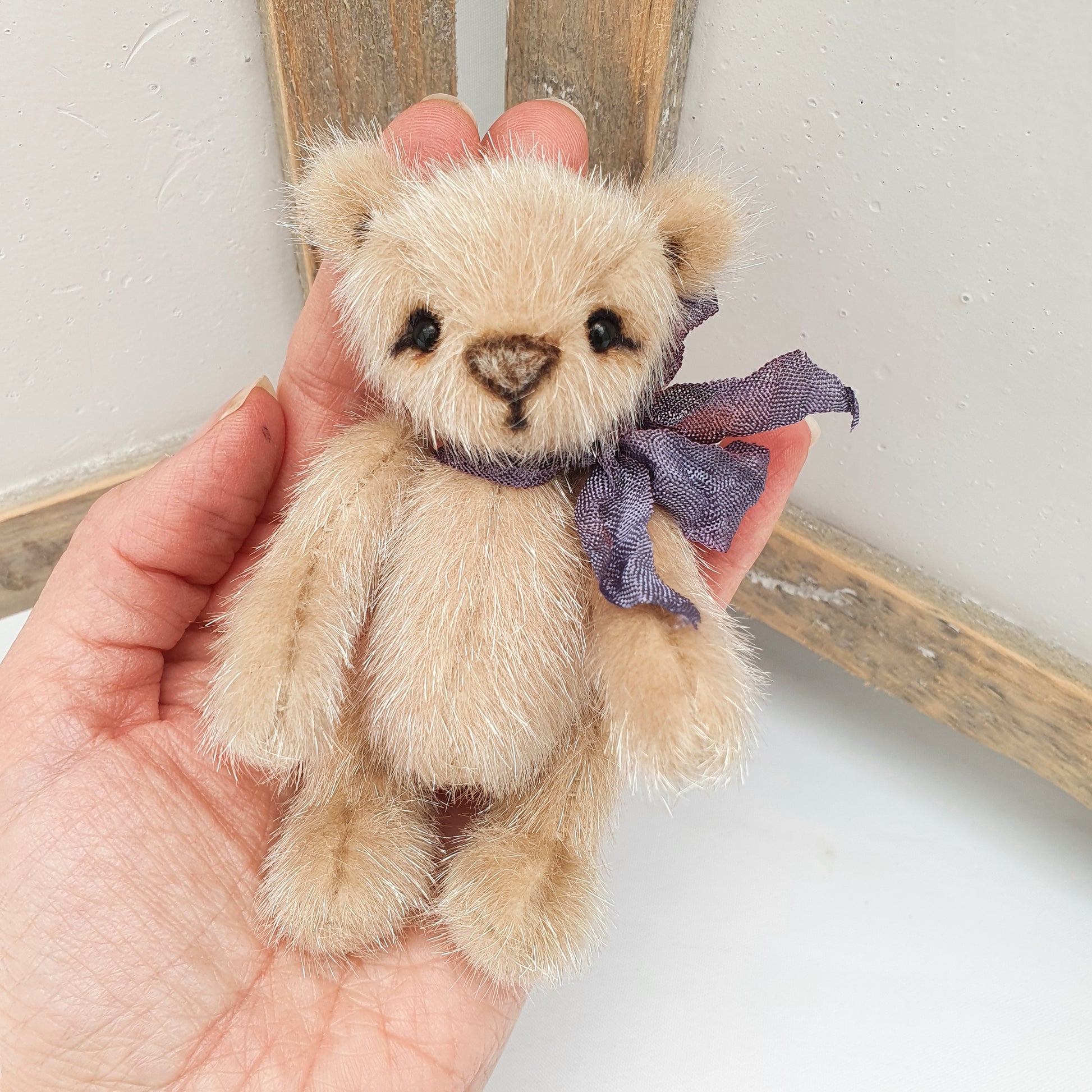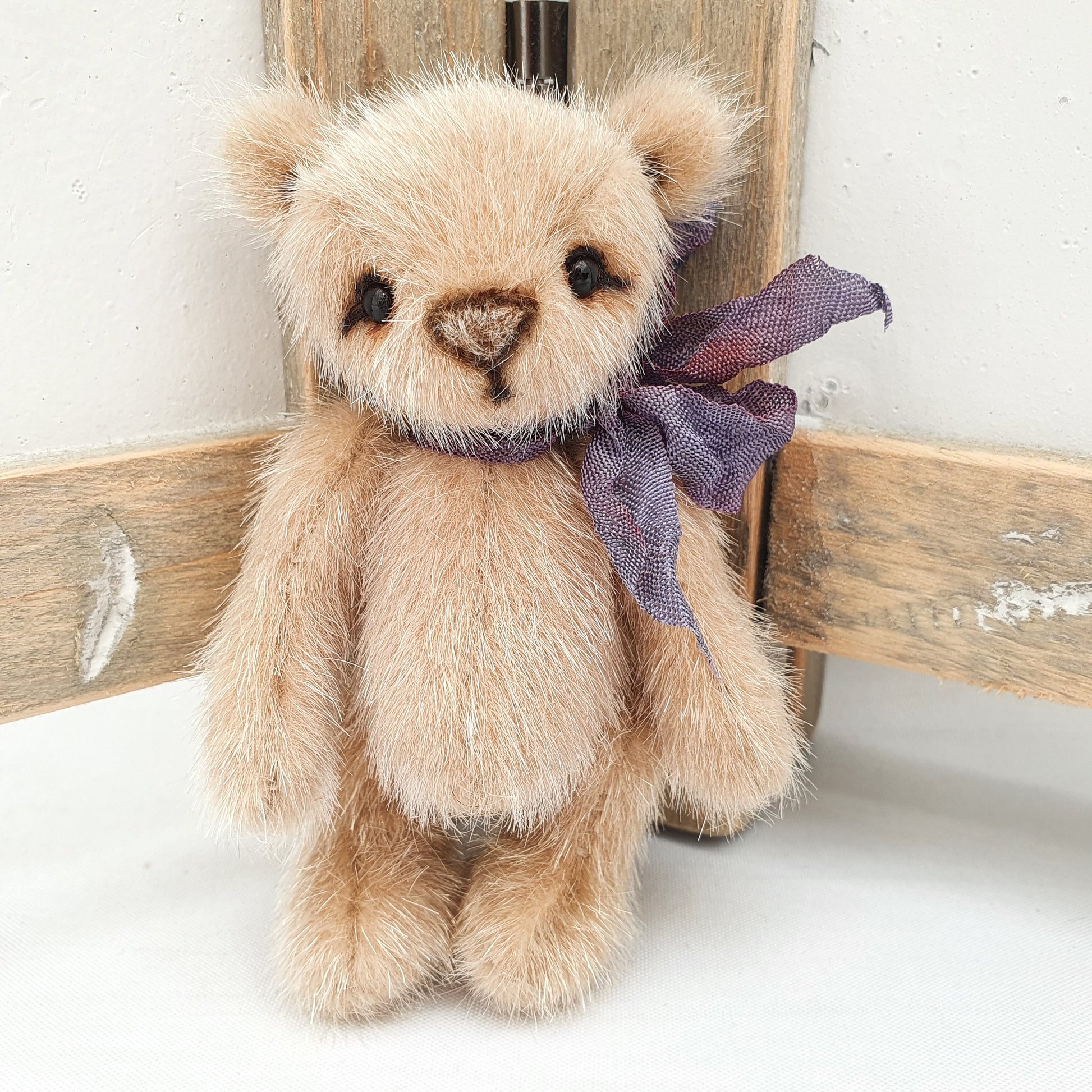 Decorated to her neck with a deep dusky purple crinkle silk ribbon, which is removable, this miniature bear will come boxed with a swing tag with all her details. And a hand made with love tag sewn on. And as with all handmade creation she will be a one of a kind with no two ever exactly a like.