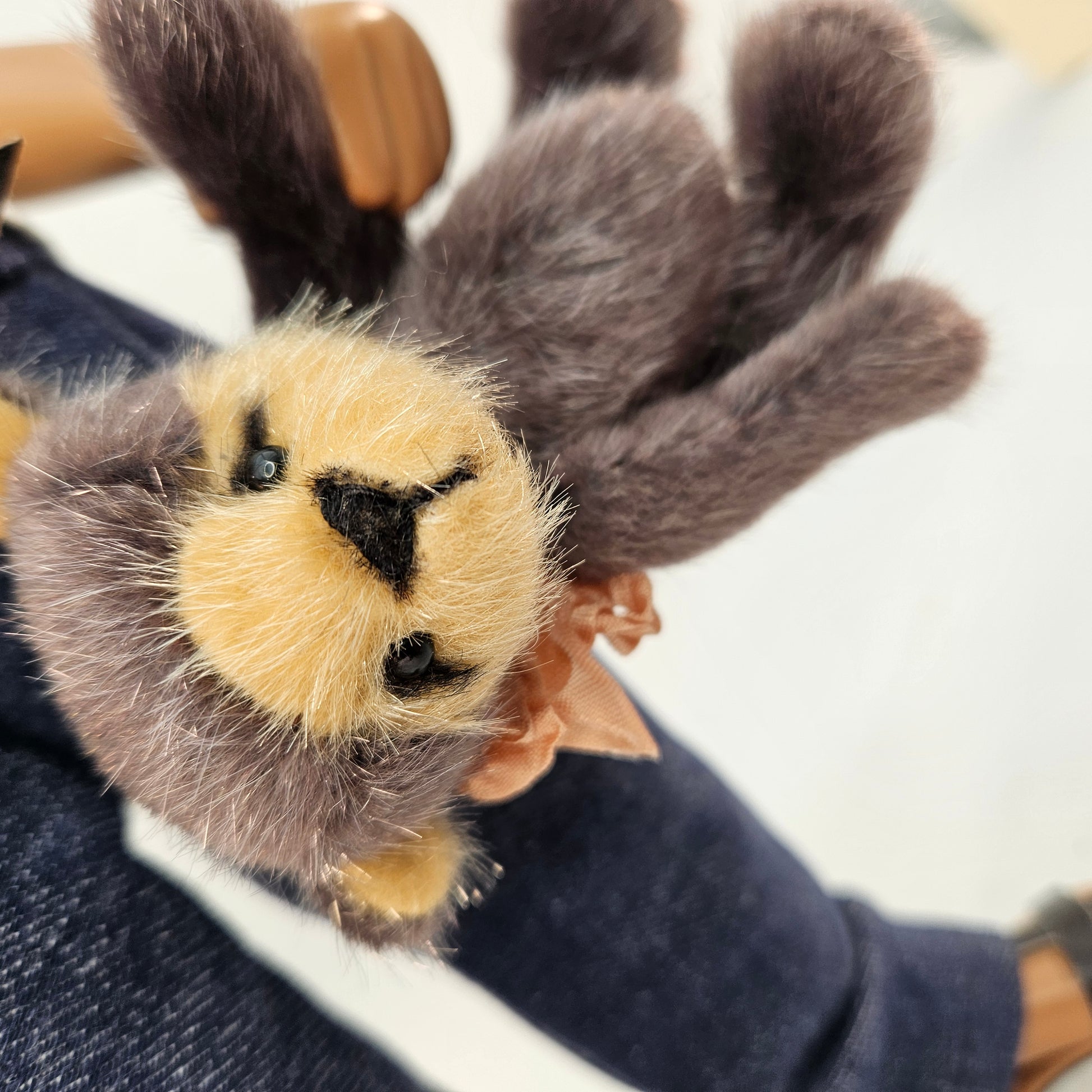 Handsewn from a shimmering beige and deep brown short pile faux fur, this little bear is 5 way jointed and stuffed with synthetic fibre fill. I have not weighted her with any metal pellets so she is lightweight which is ideal for a doll to hold.