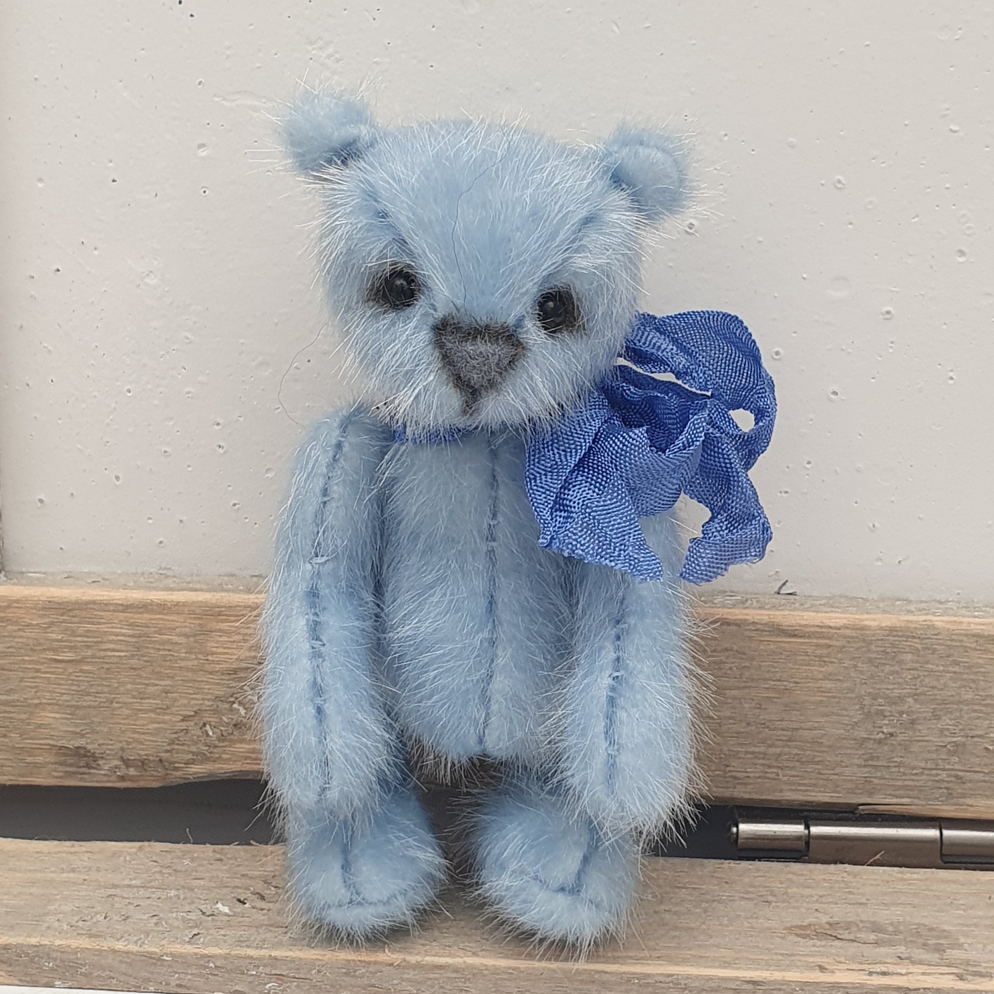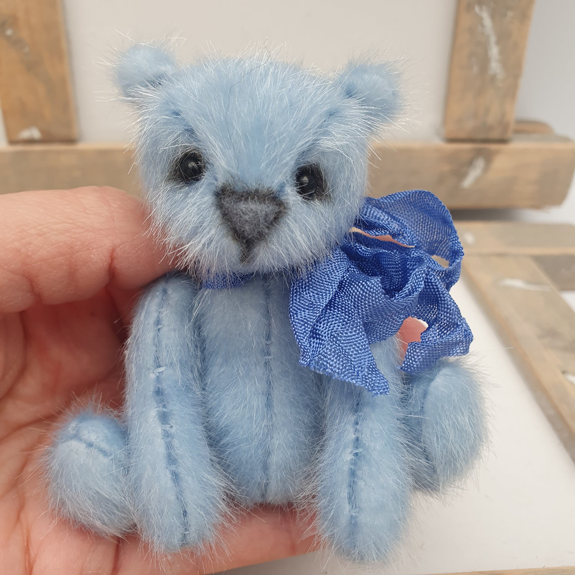 Decorated to his neck with a blue crinkle silk ribbon, which is removable, the miniature blue bear will come boxed with a swing tag with all his details. And a hand made with love tag sewn to his bum. As he is a handmade creation he will be a one of a kind with no two ever exactly a like.
