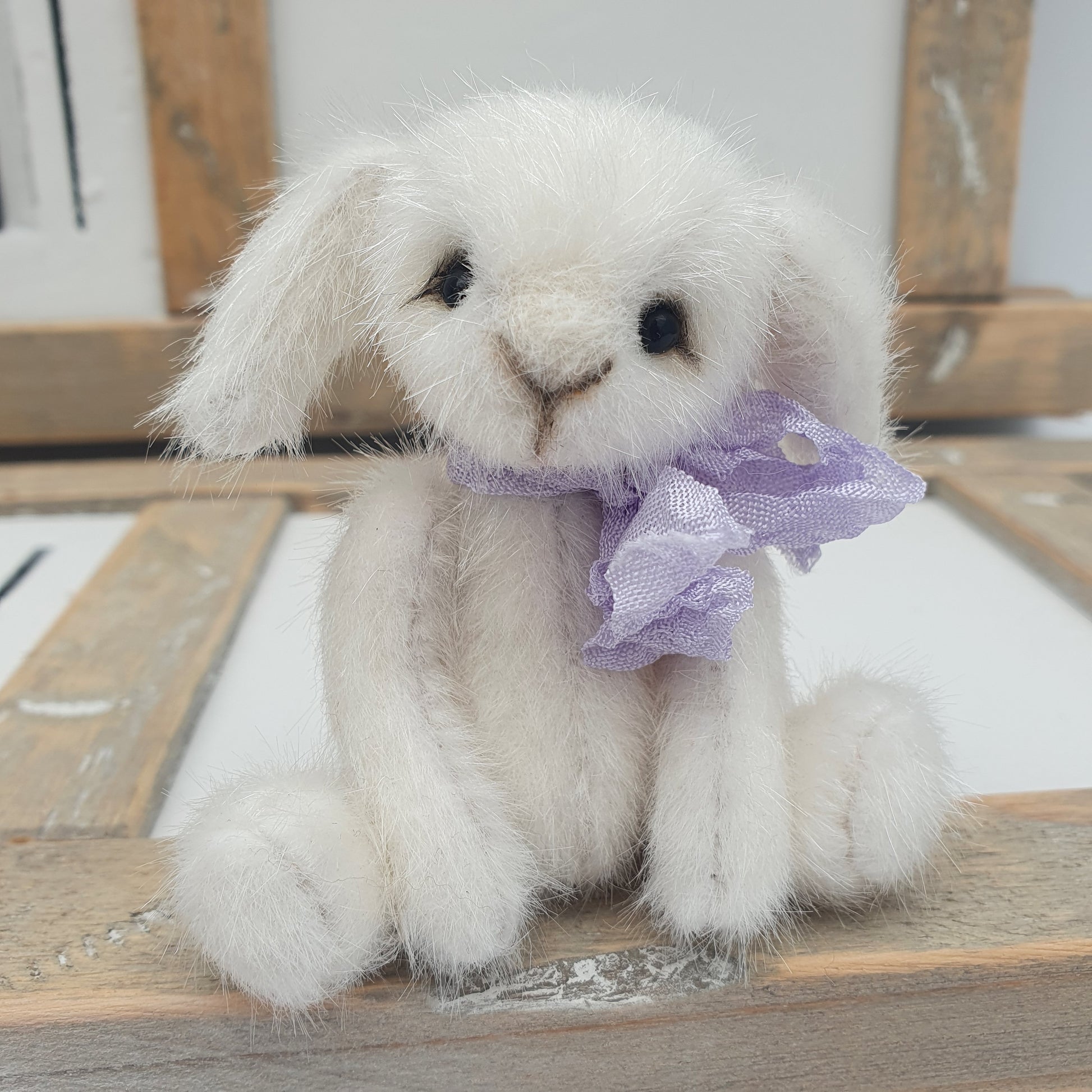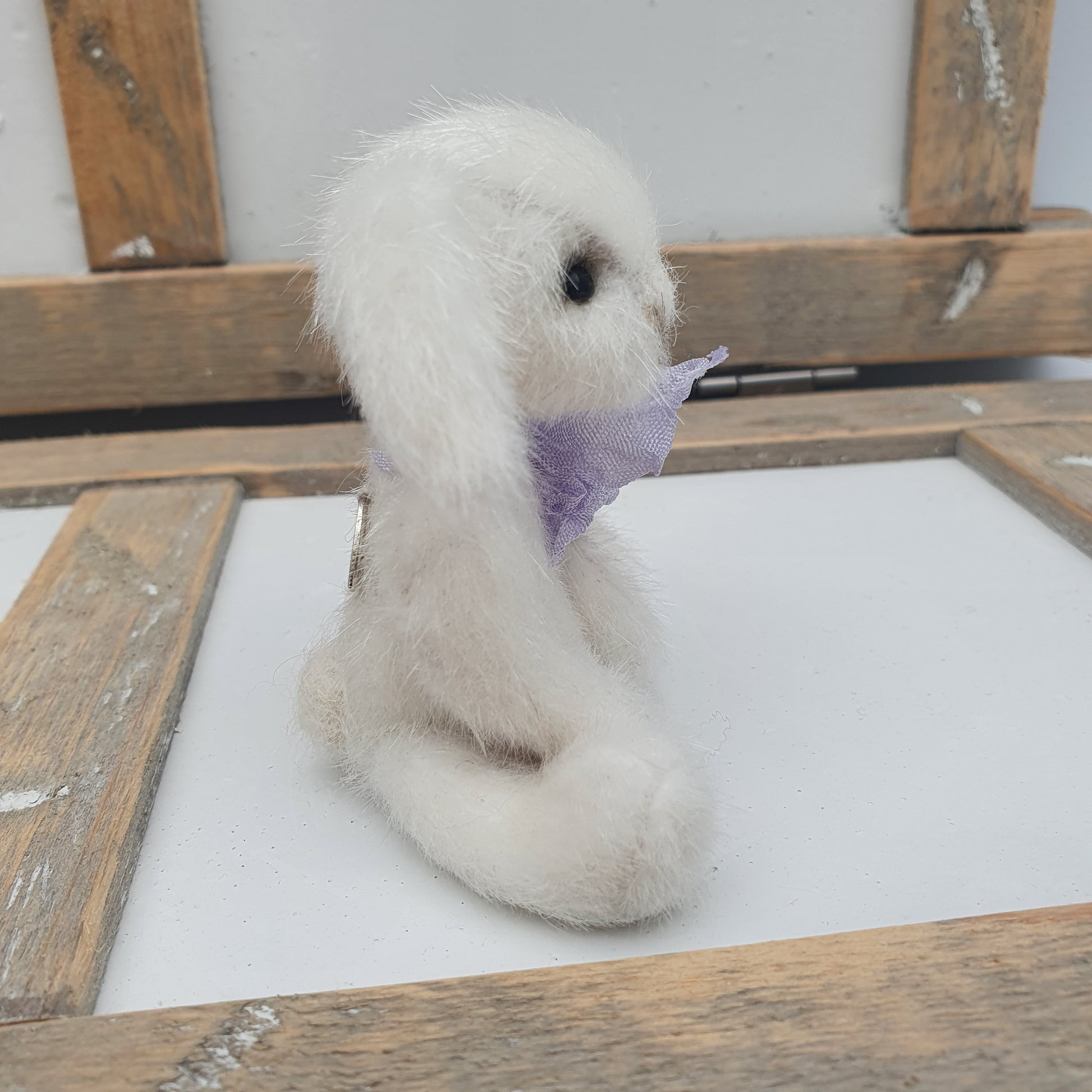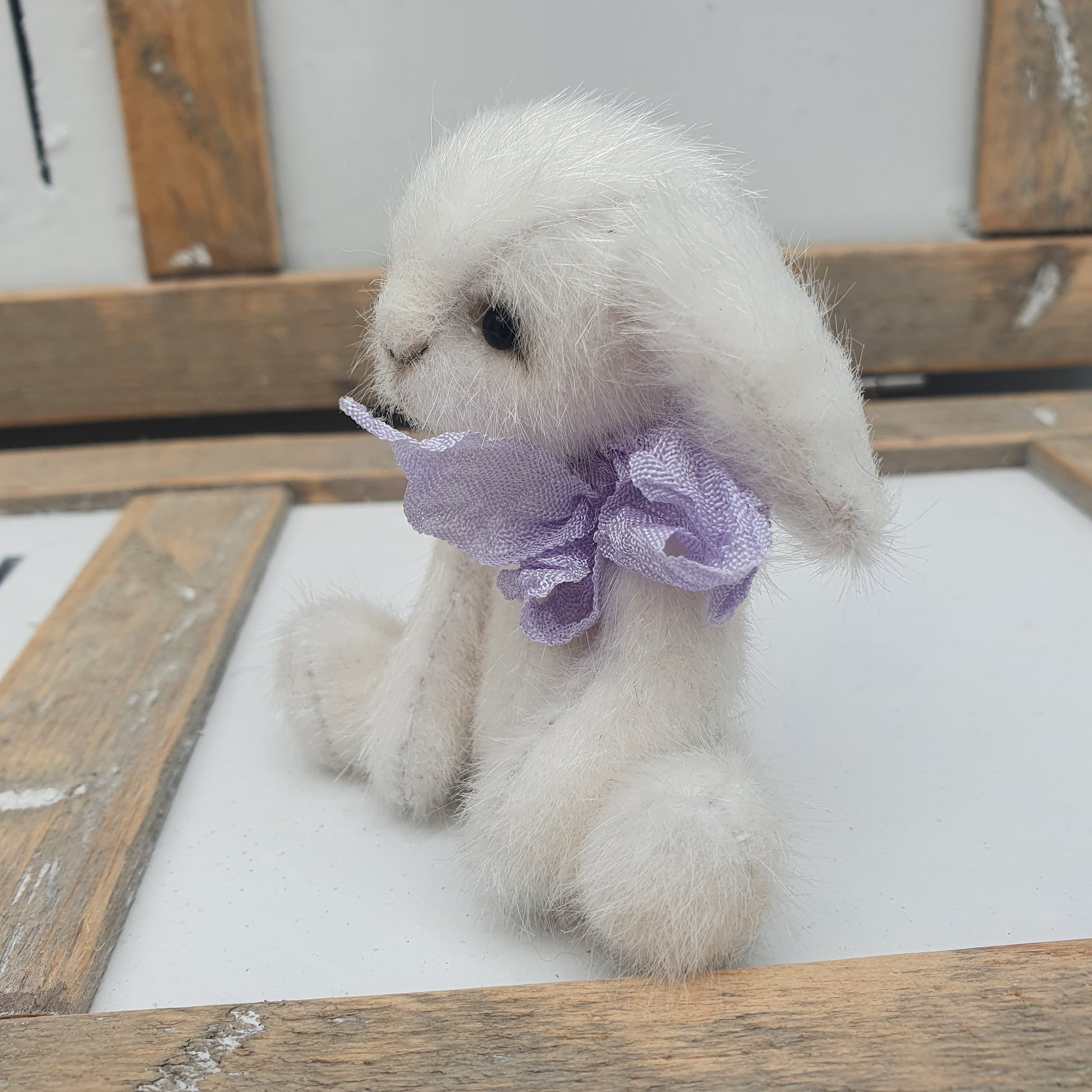 Decorated to her neck with a lilac crinkle silk ribbon, which is removable, the miniature bunny will come boxed with a swing tag with all her details. And a hand made with love tag sewn to her upper back.