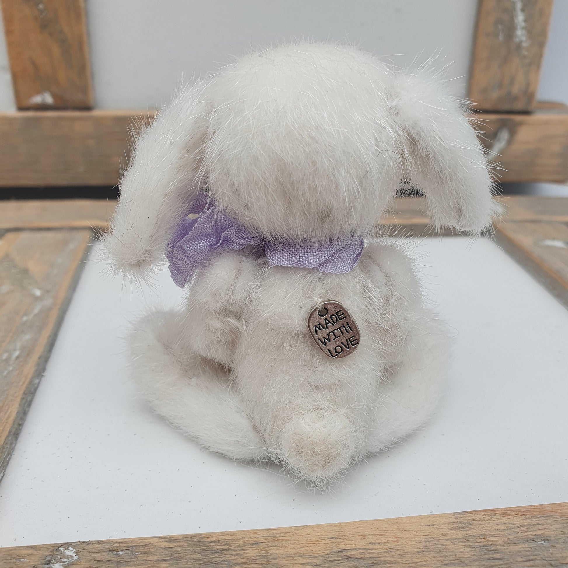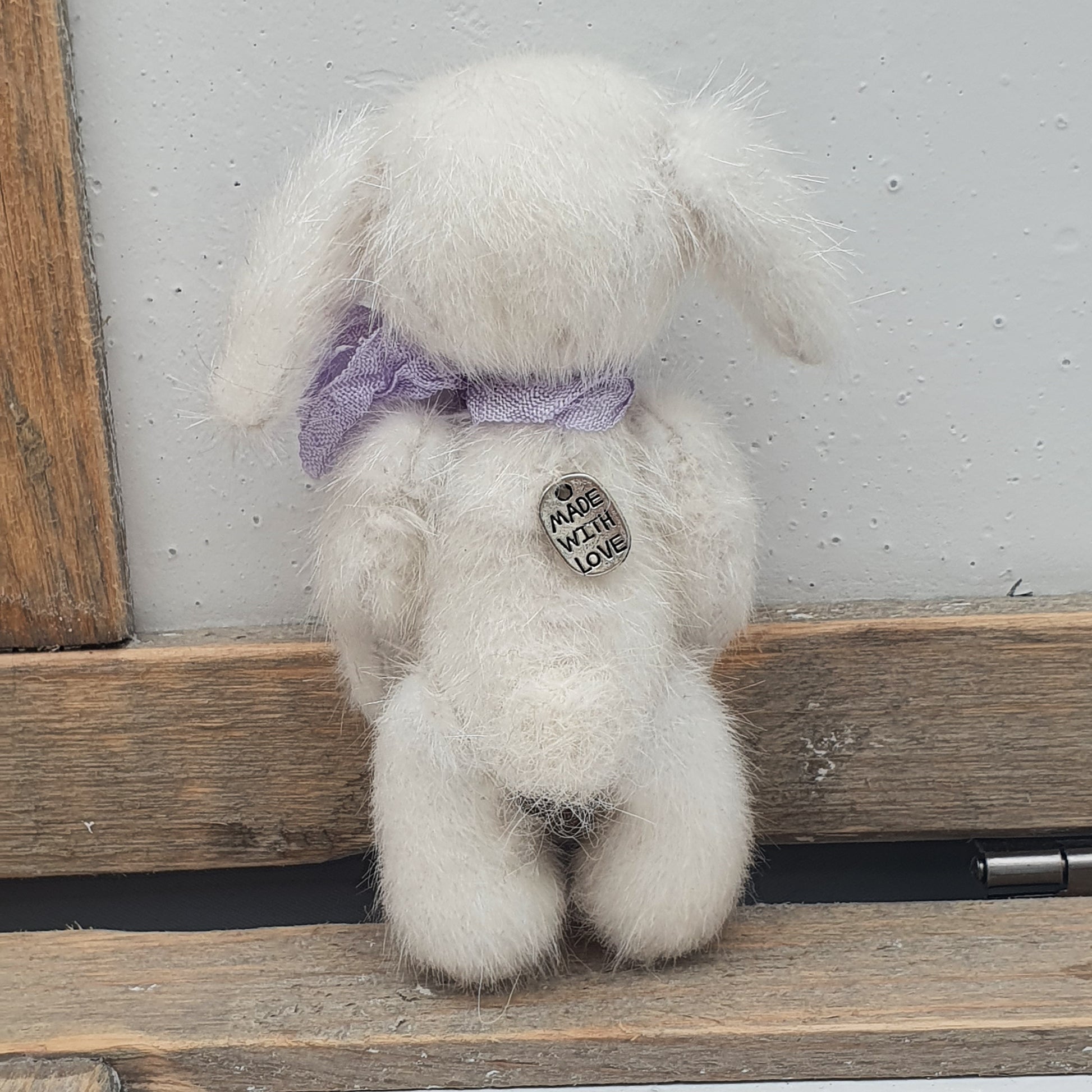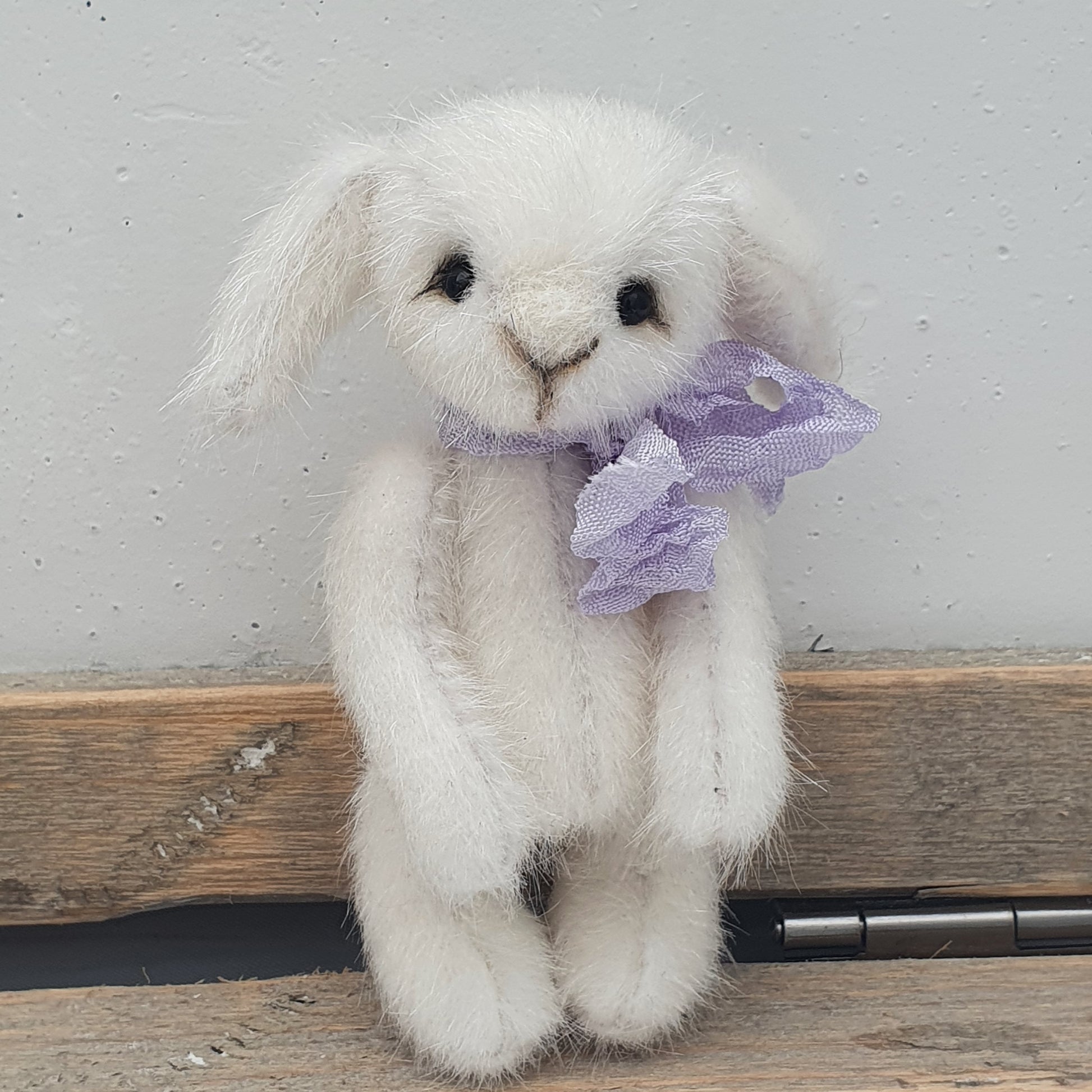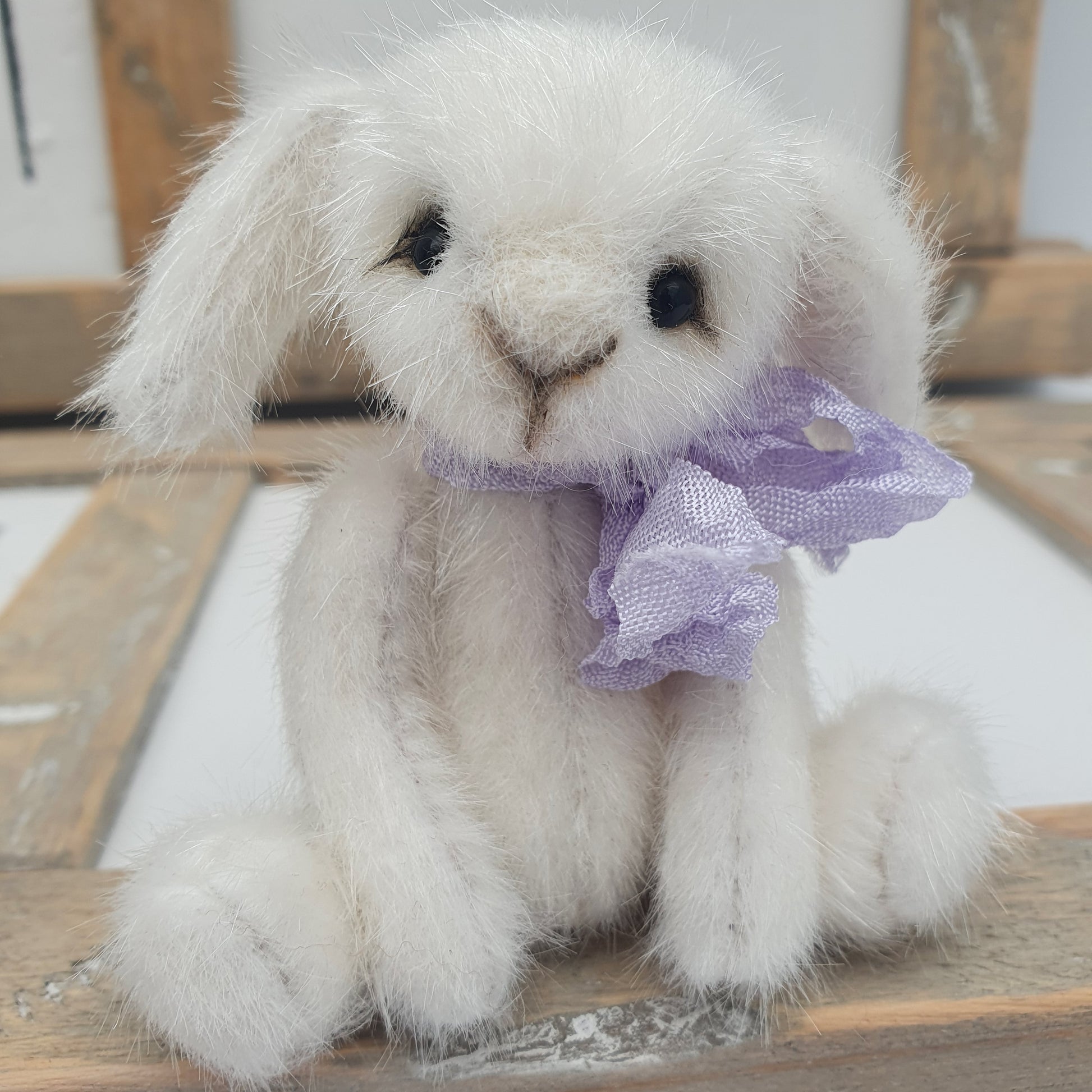 Decorated to her neck with a lilac crinkle silk ribbon, which is removable, the miniature bunny will come boxed with a swing tag with all her details. And a hand made with love tag sewn to her upper back.