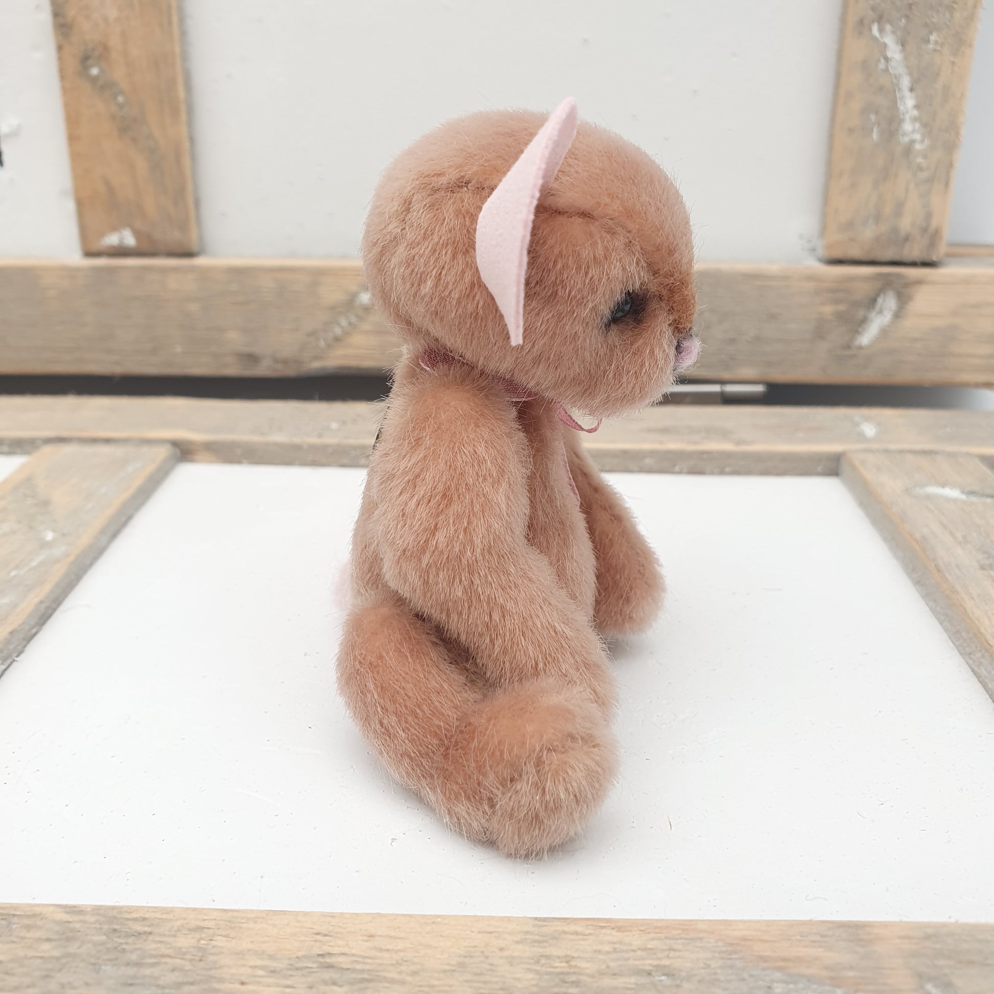 Handsewn from a short pile brown faux fur, baby mouse is 5 way jointed and stuffed with synthetic fibre fill. I have not weighted him with any metal pellets.