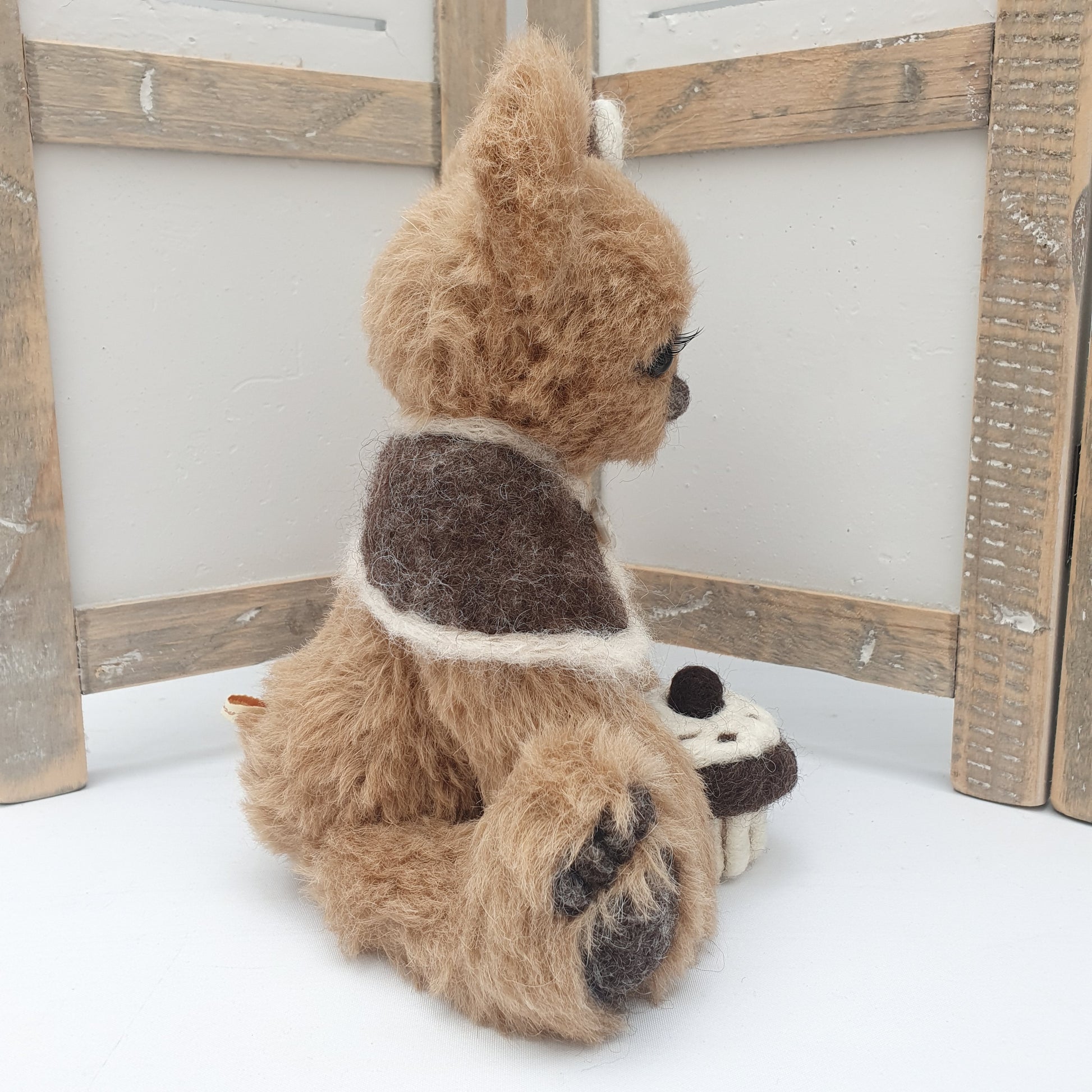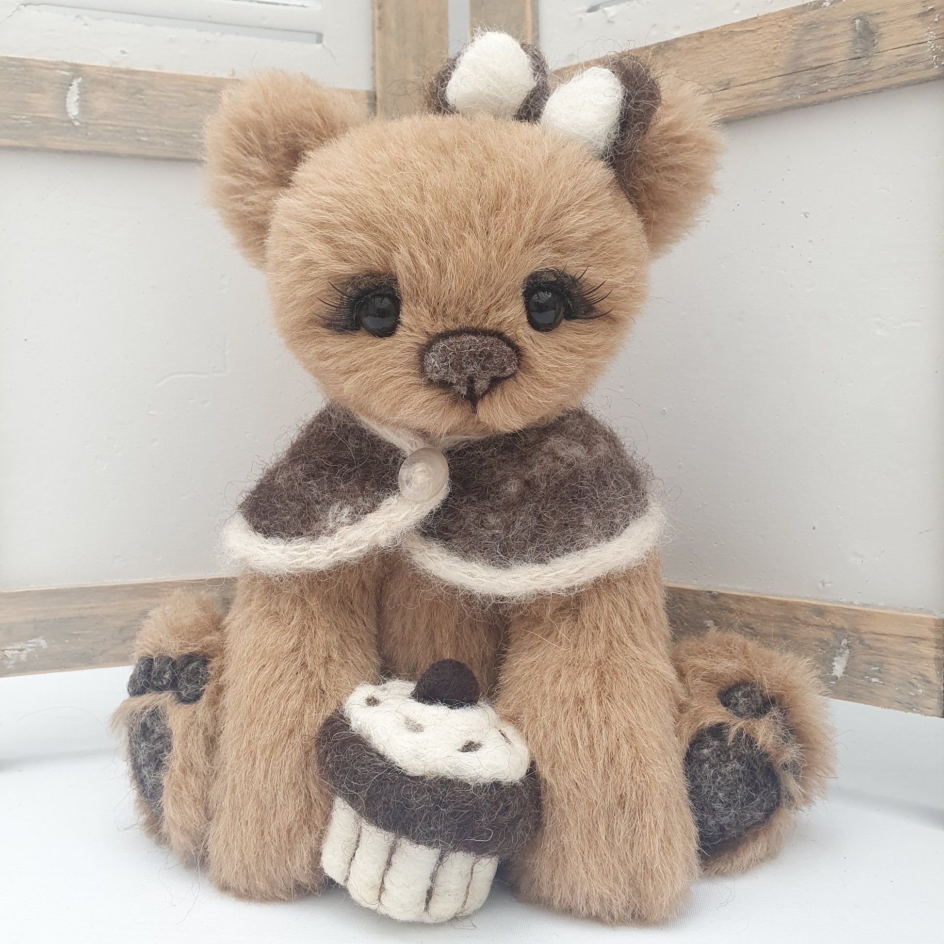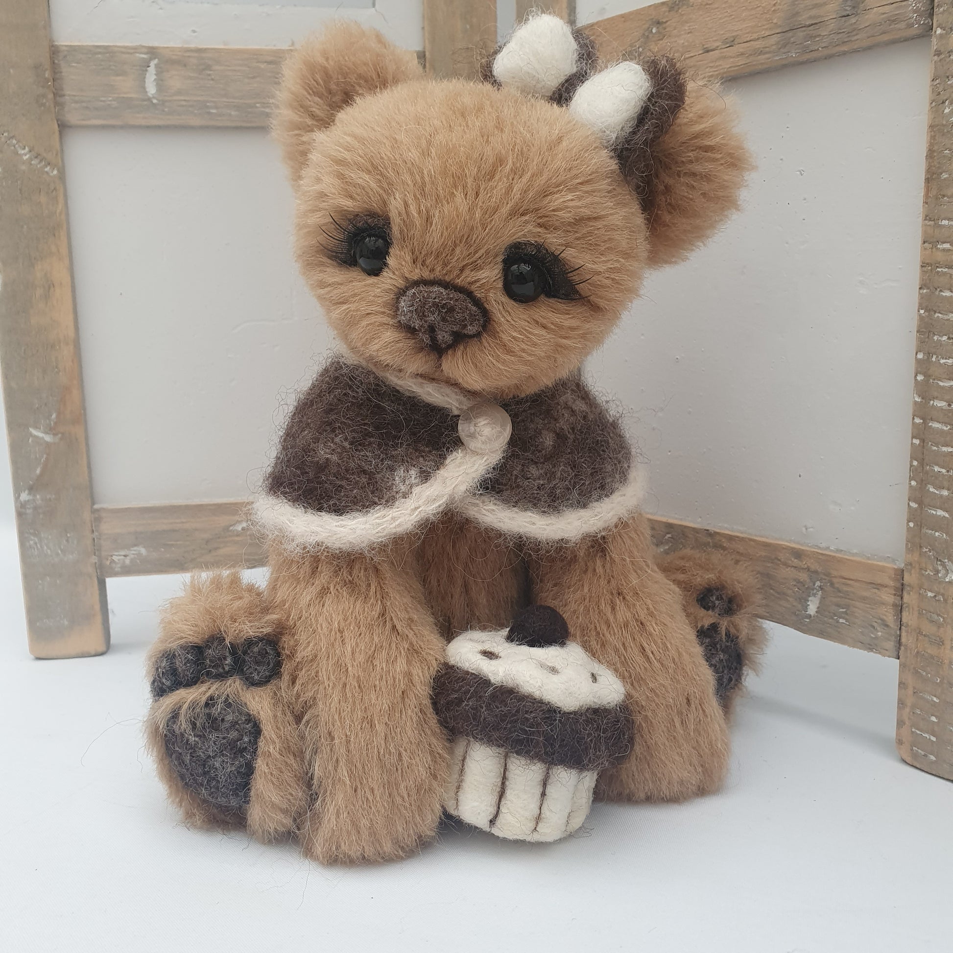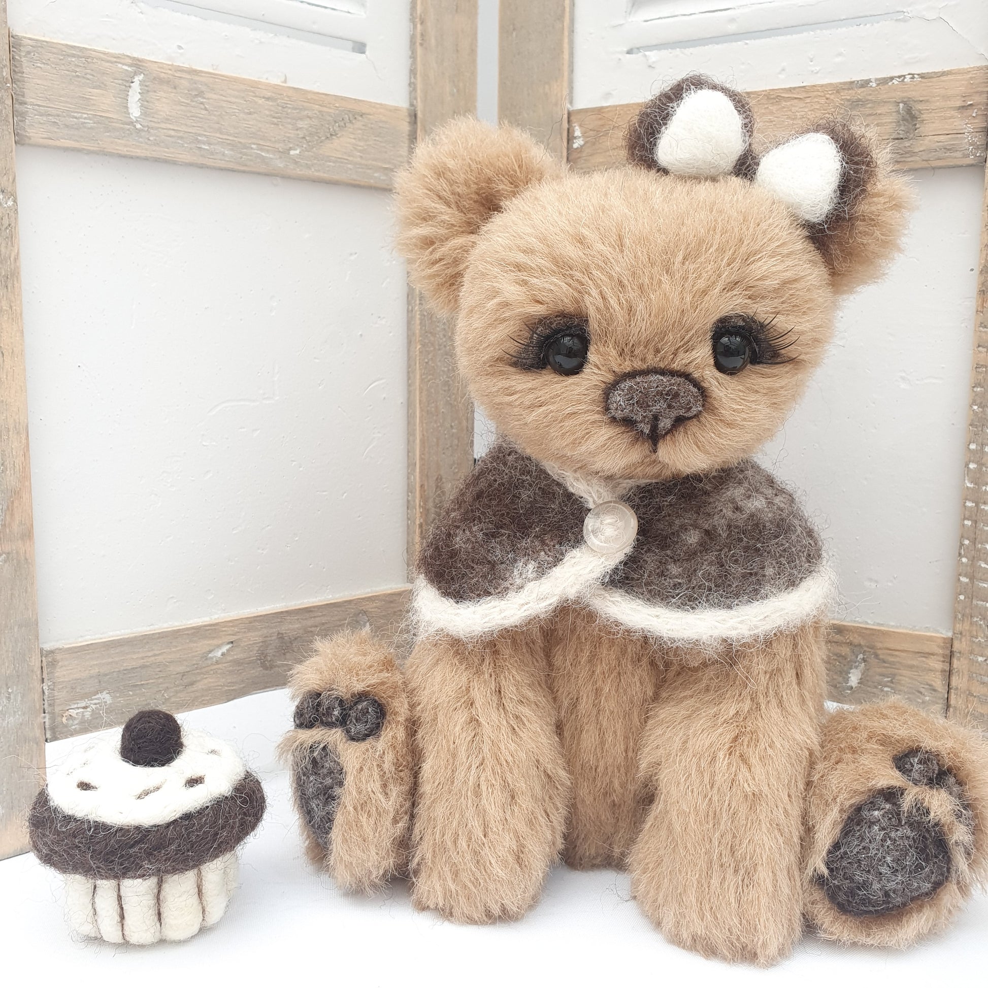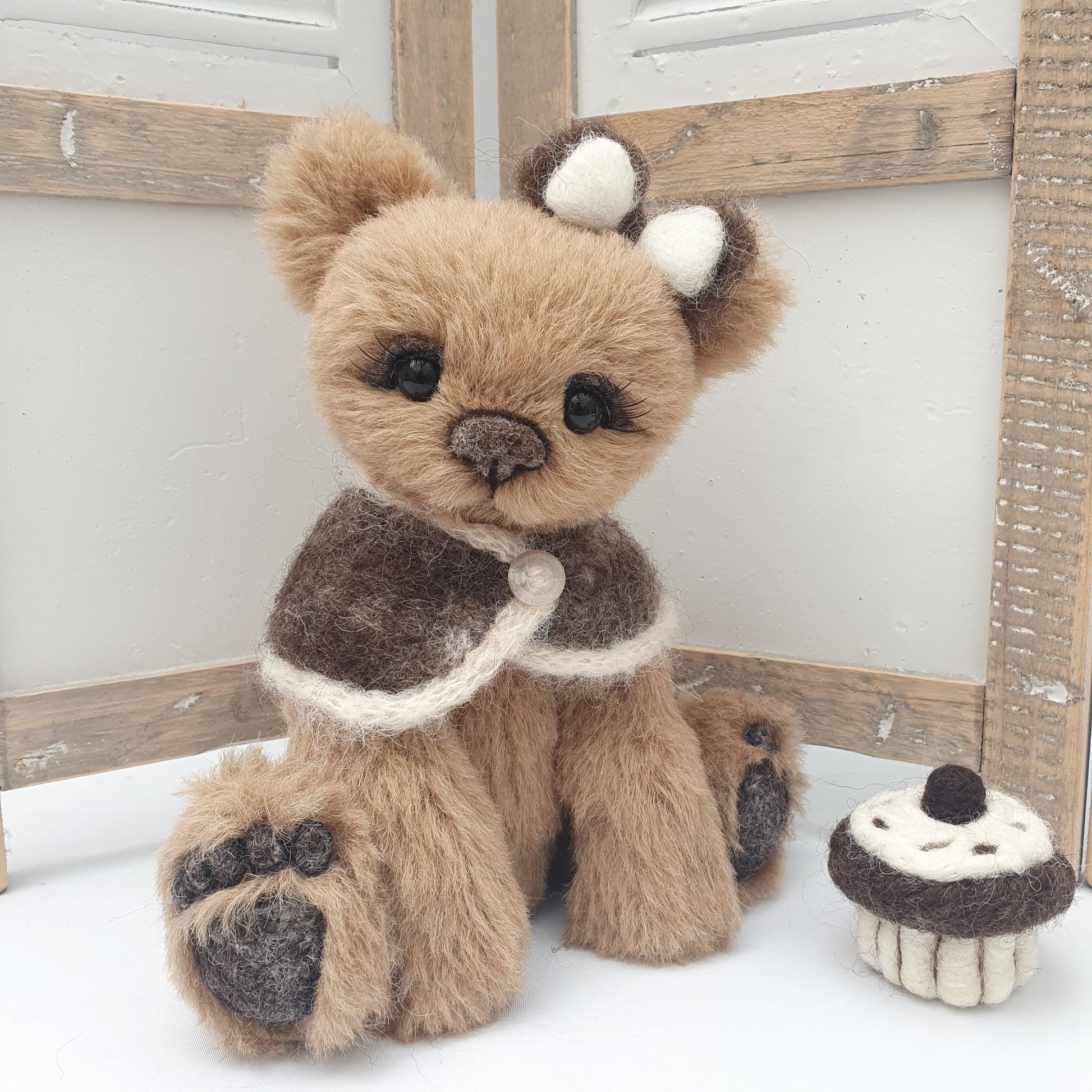 Decorated to her head with a natural wool bow and to her body with a wool shawl both of which removable and have been made using a marble mix of white and brown alpaca wool which complement the colouring of her needle felted wool nose, paw-pads and eyelids perfectly. She has a sewn in Bungalow Bears bum label and a card swing tag with all credentials and will come with her little needle felted chocolate muffin because she is a little muffin herself.