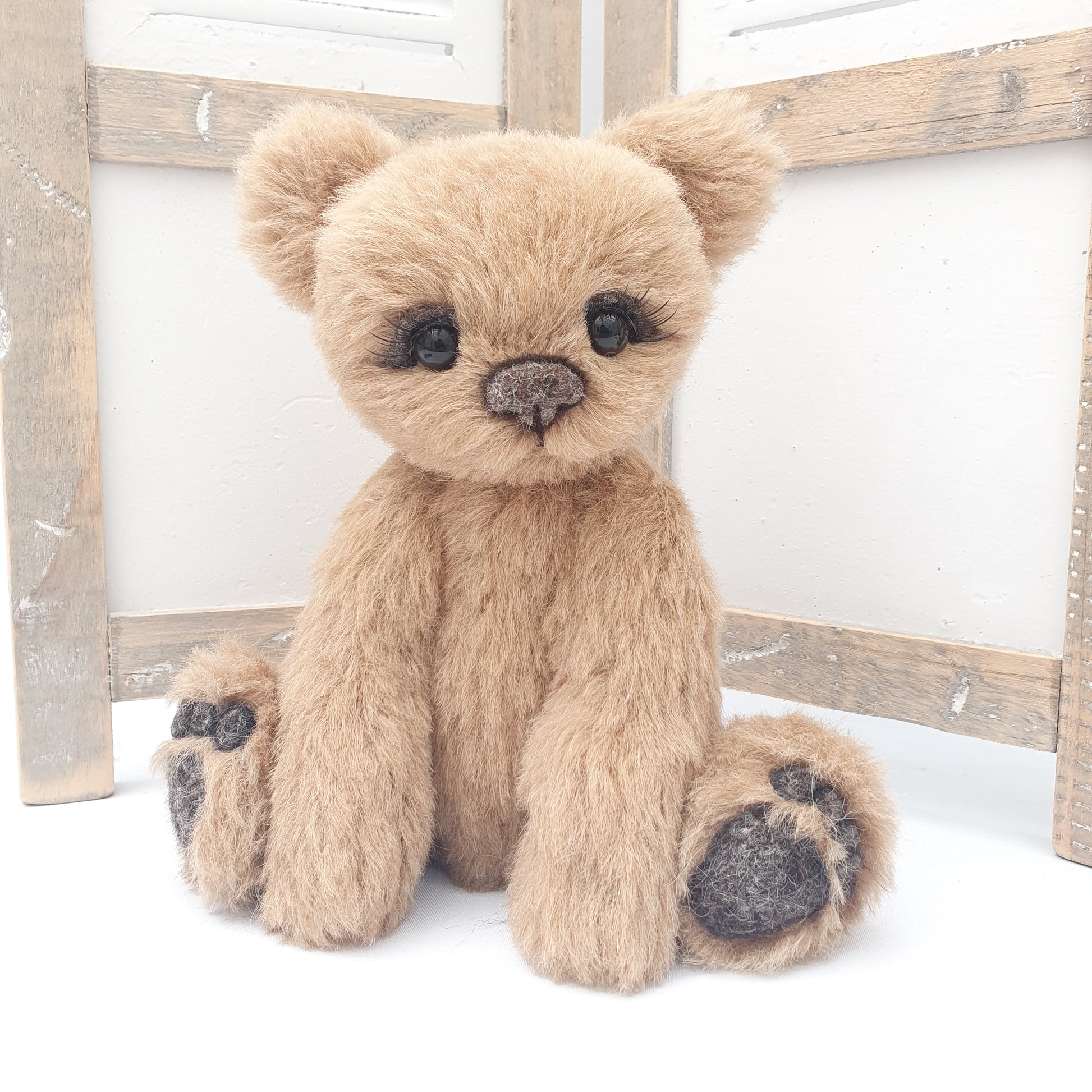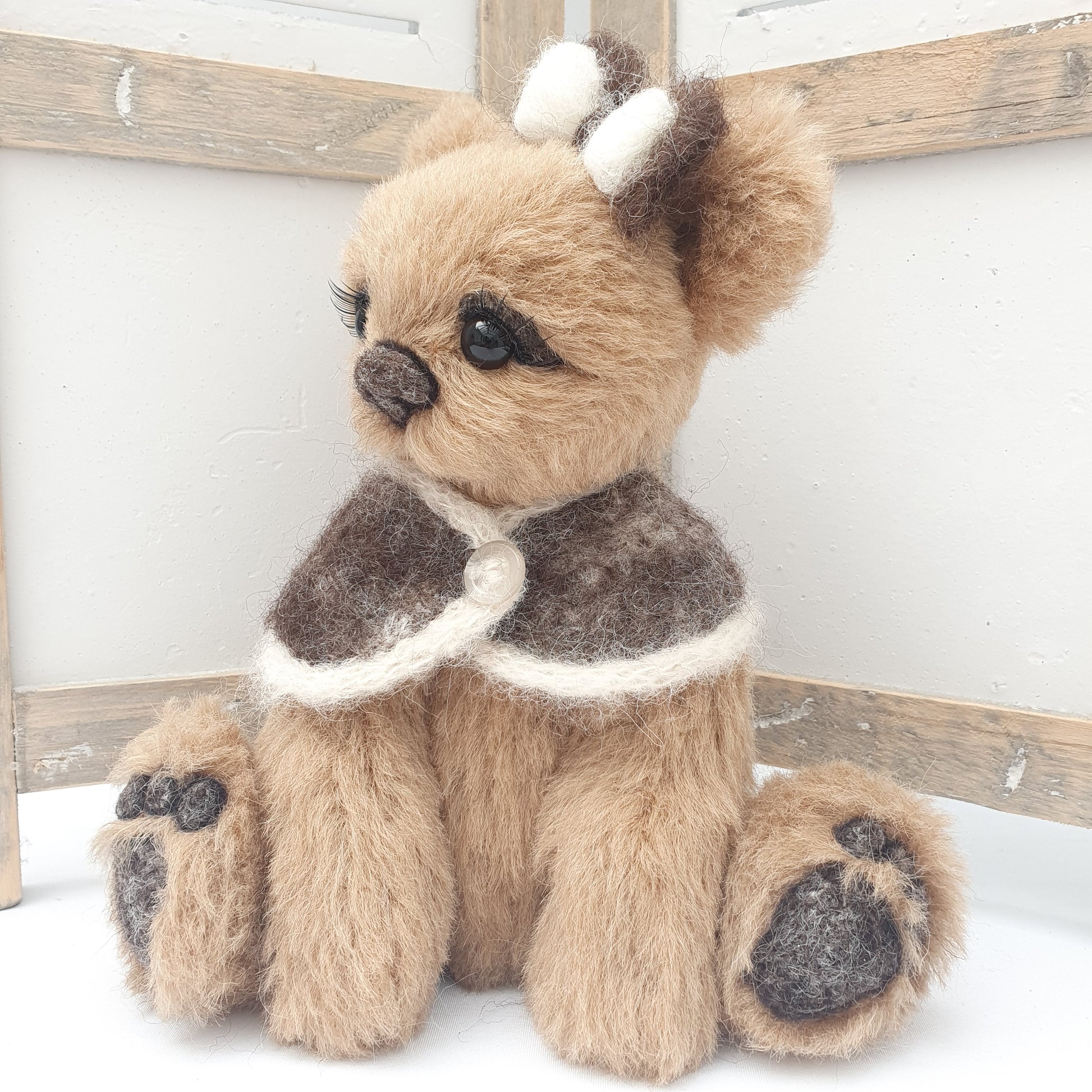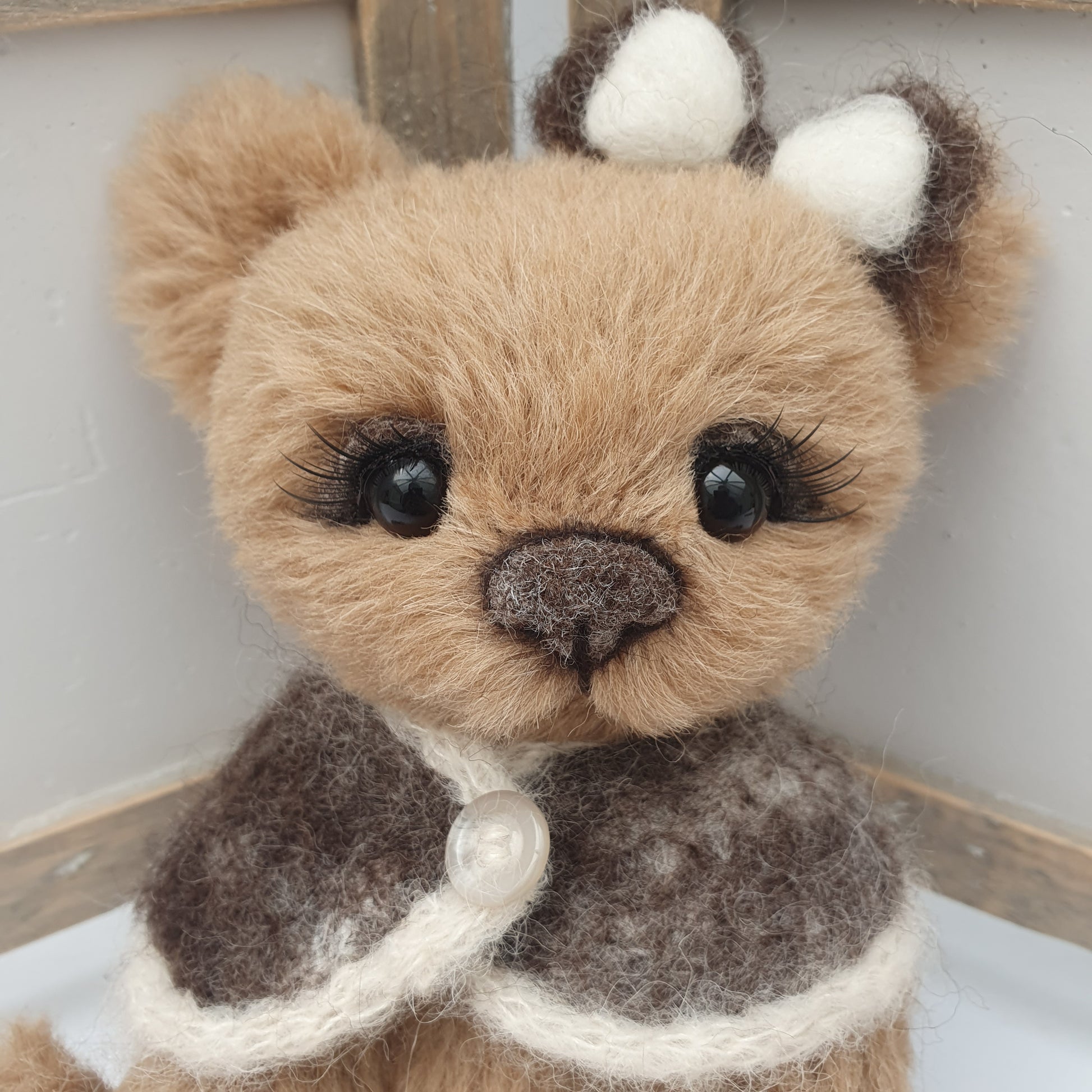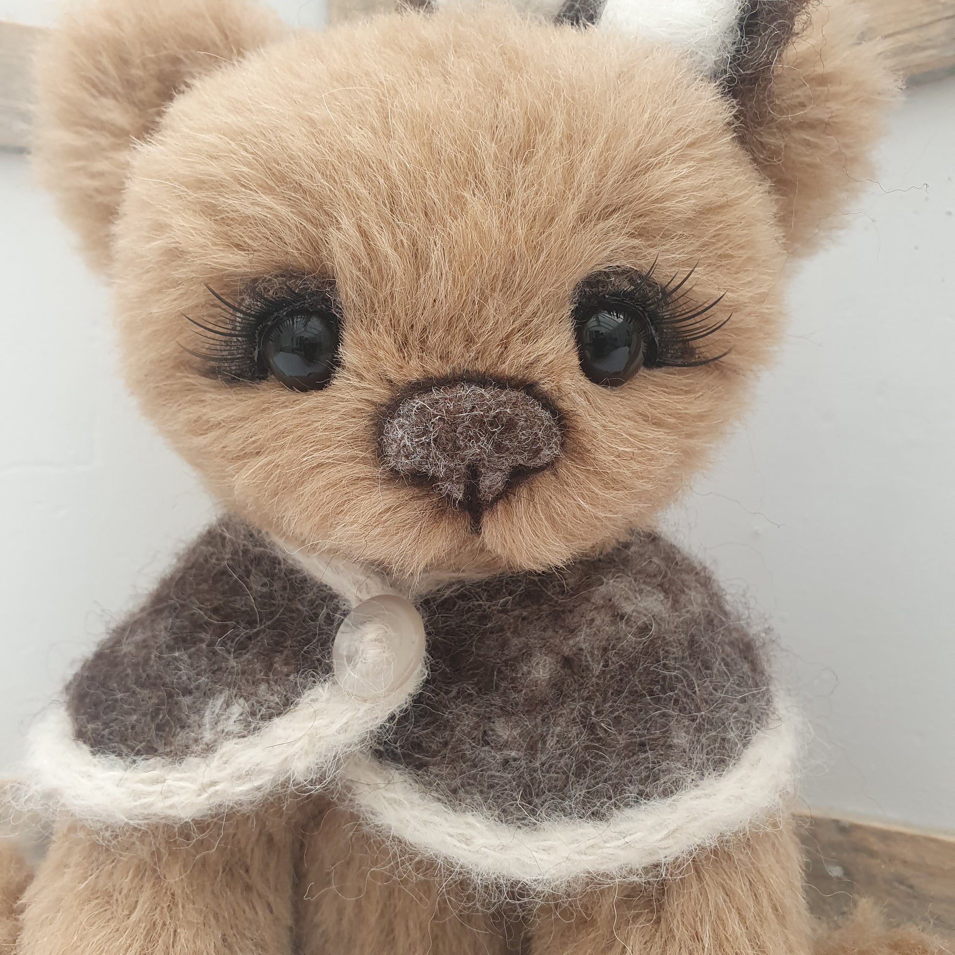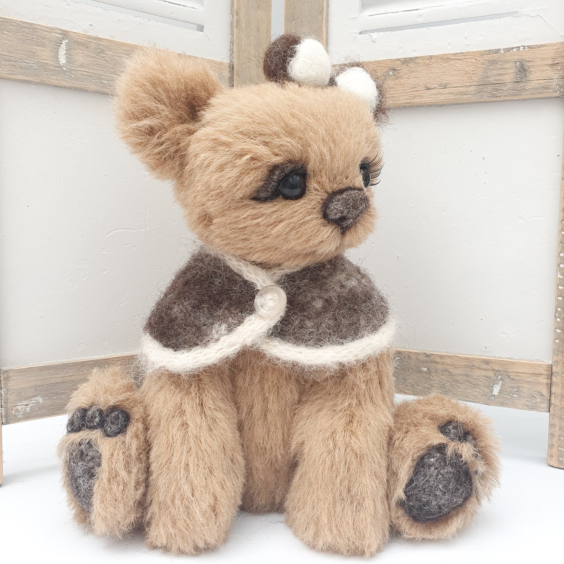 Decorated to her head with a natural wool bow and to her body with a wool shawl both of which removable and have been made using a marble mix of white and brown alpaca wool which complement the colouring of her needle felted wool nose, paw-pads and eyelids perfectly. She has a sewn in Bungalow Bears bum label and a card swing tag with all credentials and will come with her little needle felted chocolate muffin because she is a little muffin herself.