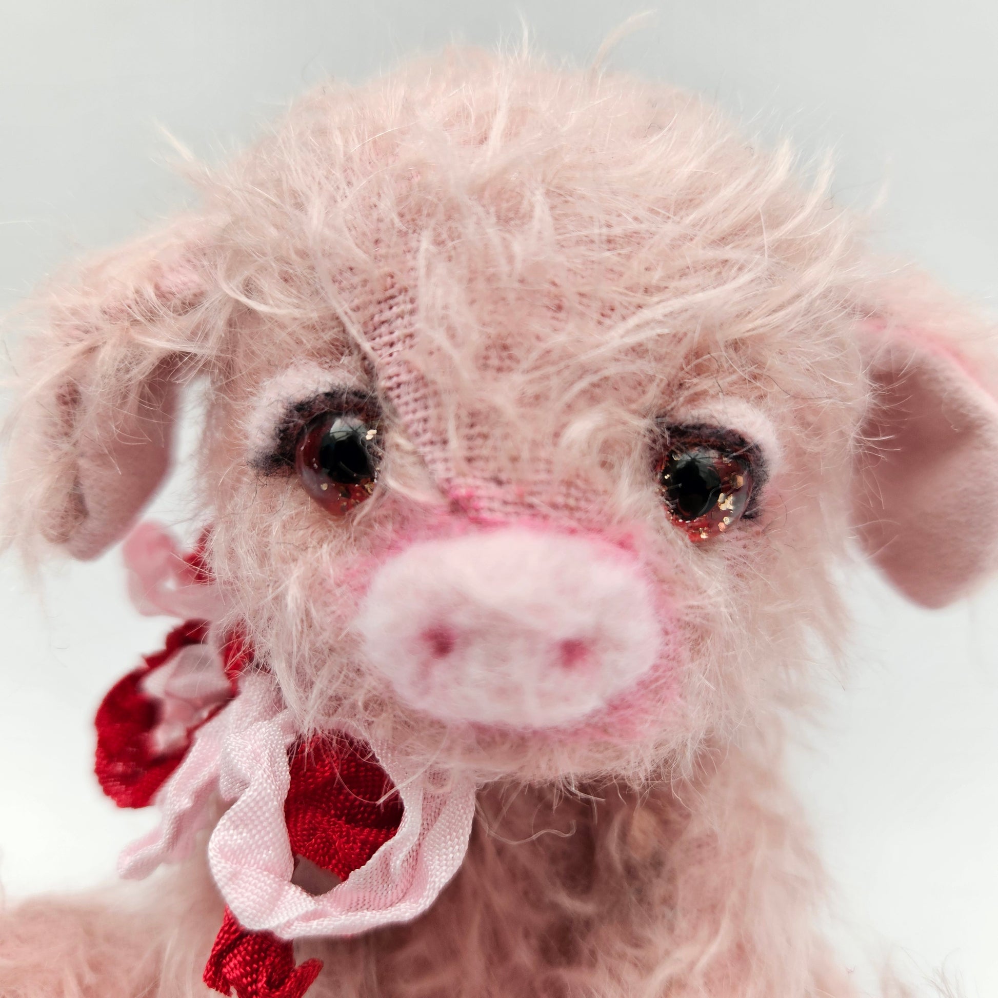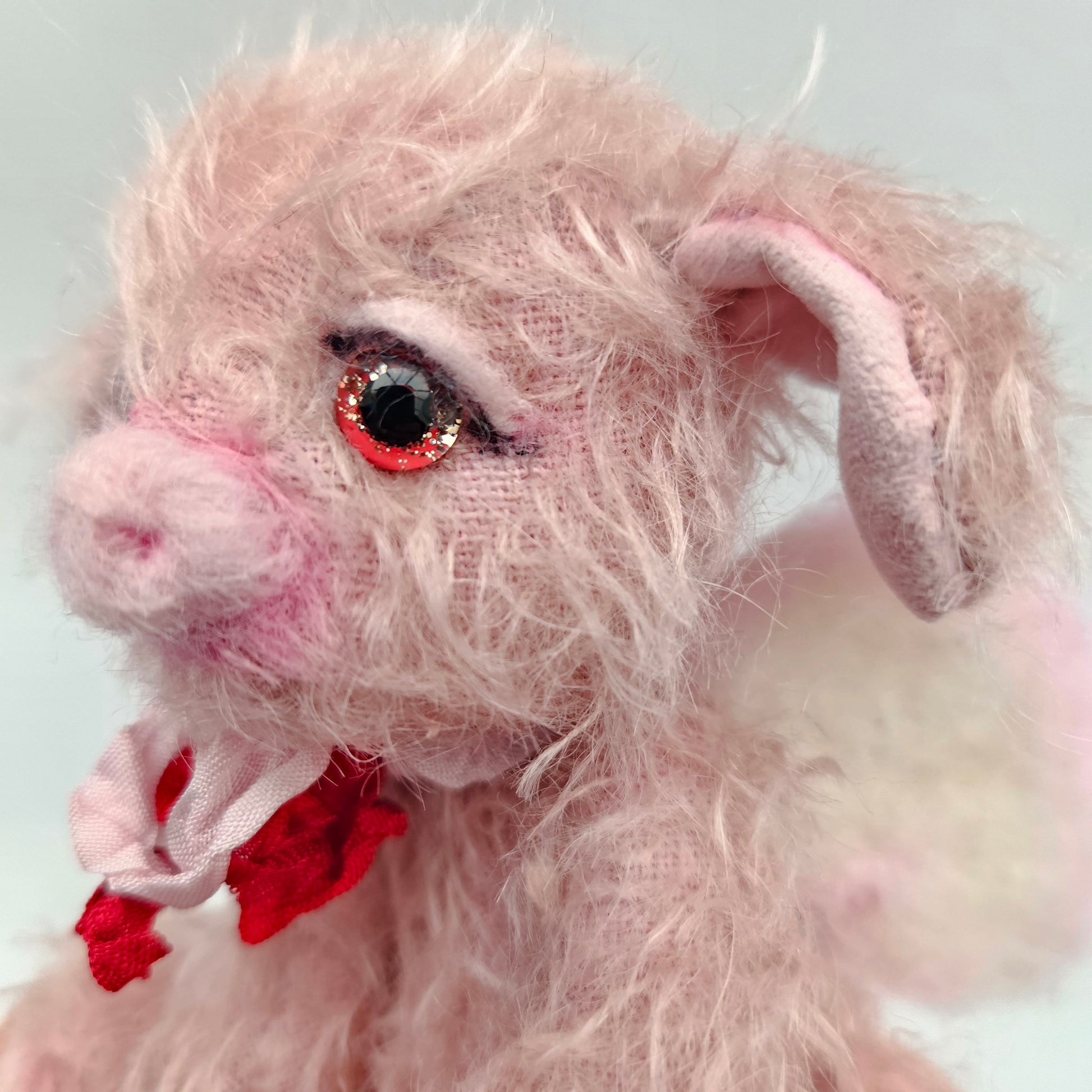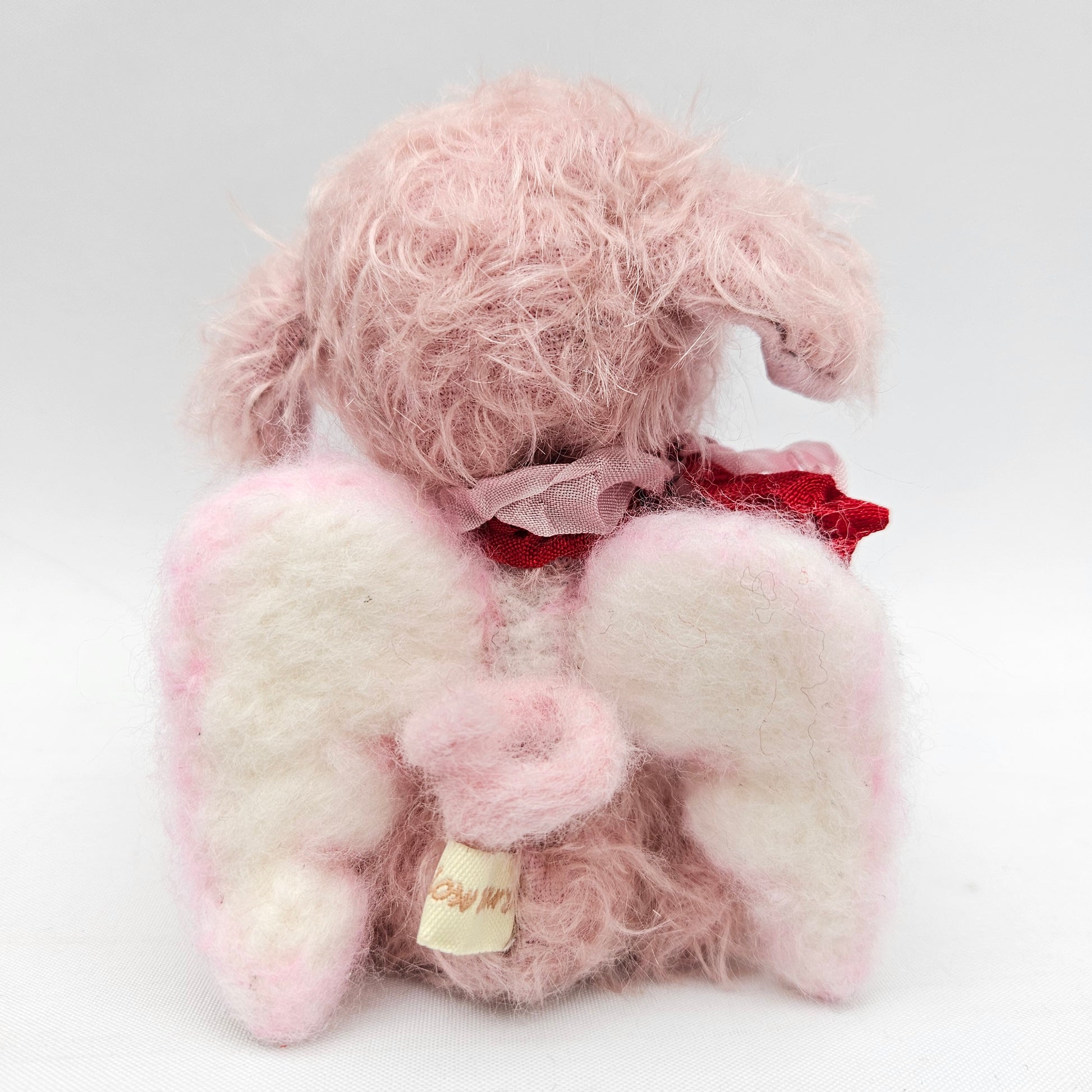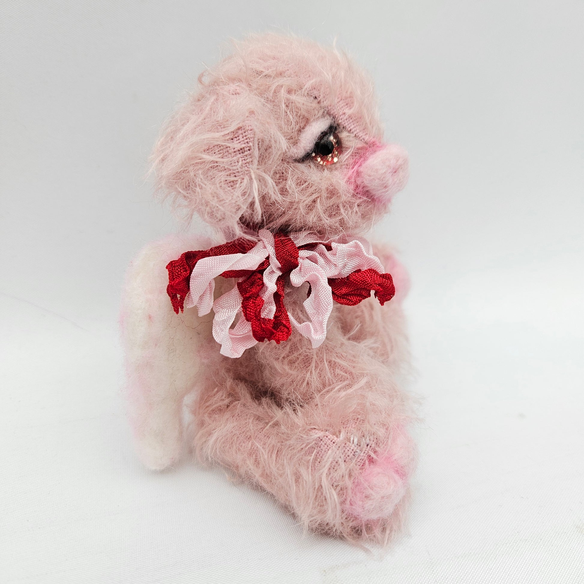 Cupig is a little cupid piggy and as such has some needlefelted cupid angel wings and a red heart to go with her. She is decorated with Silk Ribbons.
