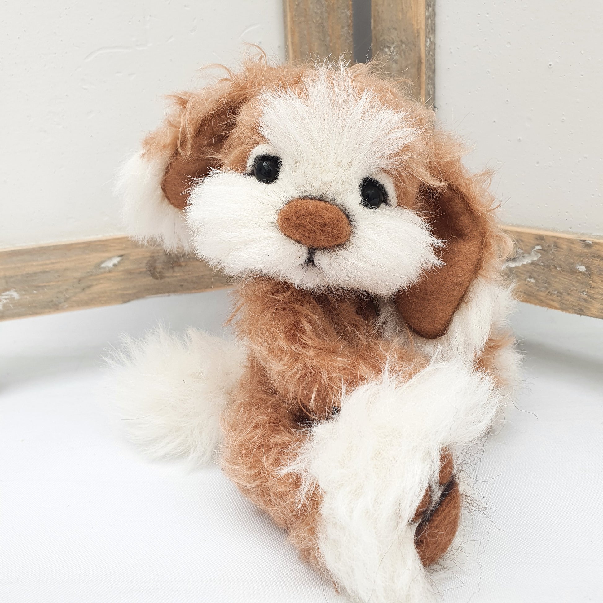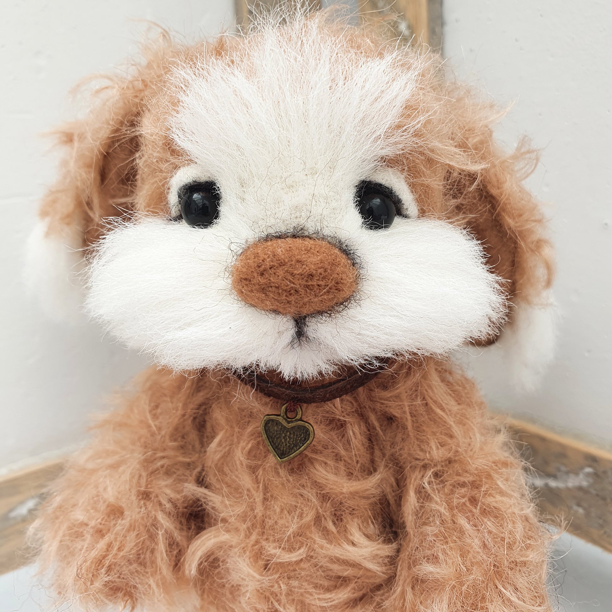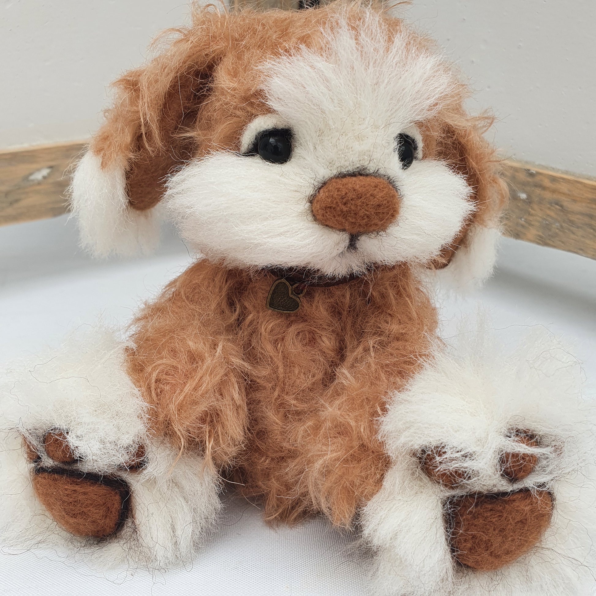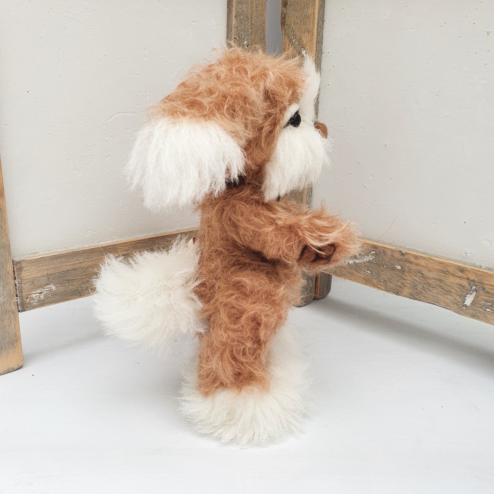 Made from my own original pattern, Pupsy is fully handmade, handsewn, and has been designed by me. Pupsy is a sitting puppy, however, with a little positioning and support, is able to stand in an upright position against/beside something as in the images which can be nice to pose amongst a collection, display or for photos/diorama.