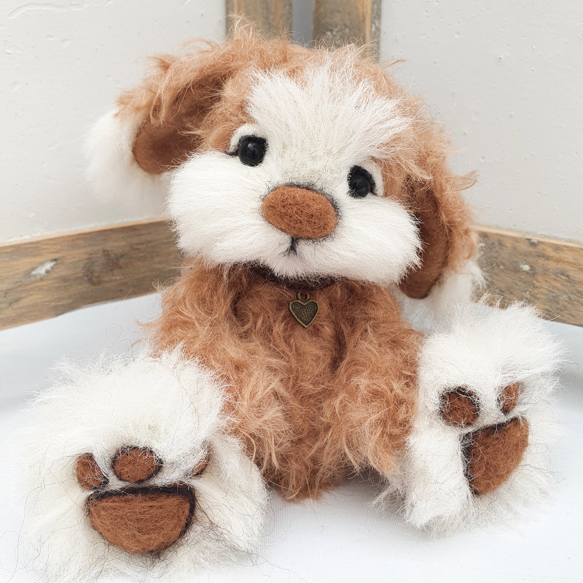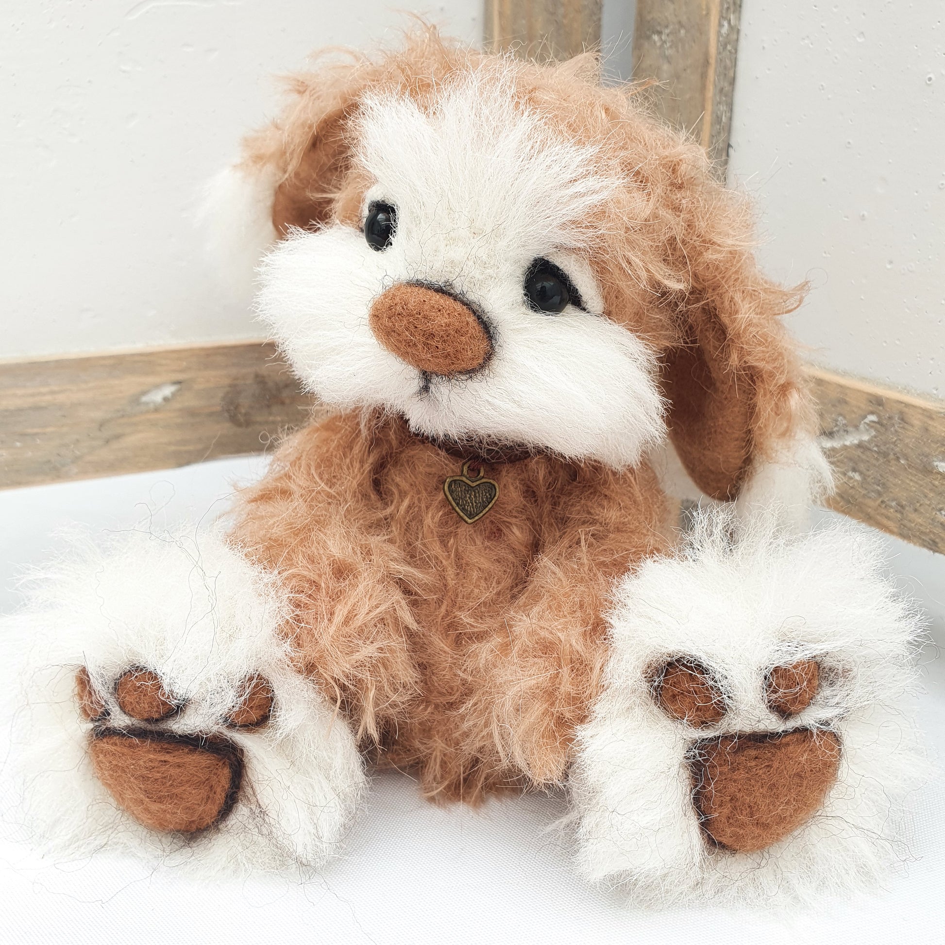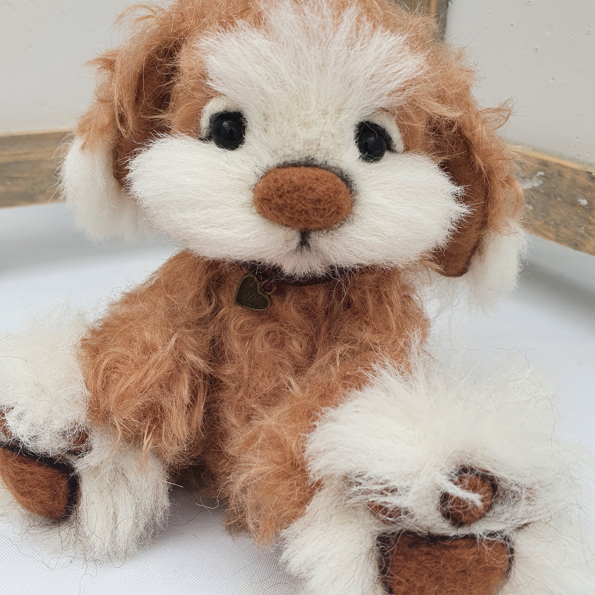 Made from my own original pattern, Pupsy is fully handmade, handsewn, and has been designed by me. Pupsy is a sitting puppy, however, with a little positioning and support, is able to stand in an upright position against/beside something as in the images which can be nice to pose amongst a collection, display or for photos/diorama.