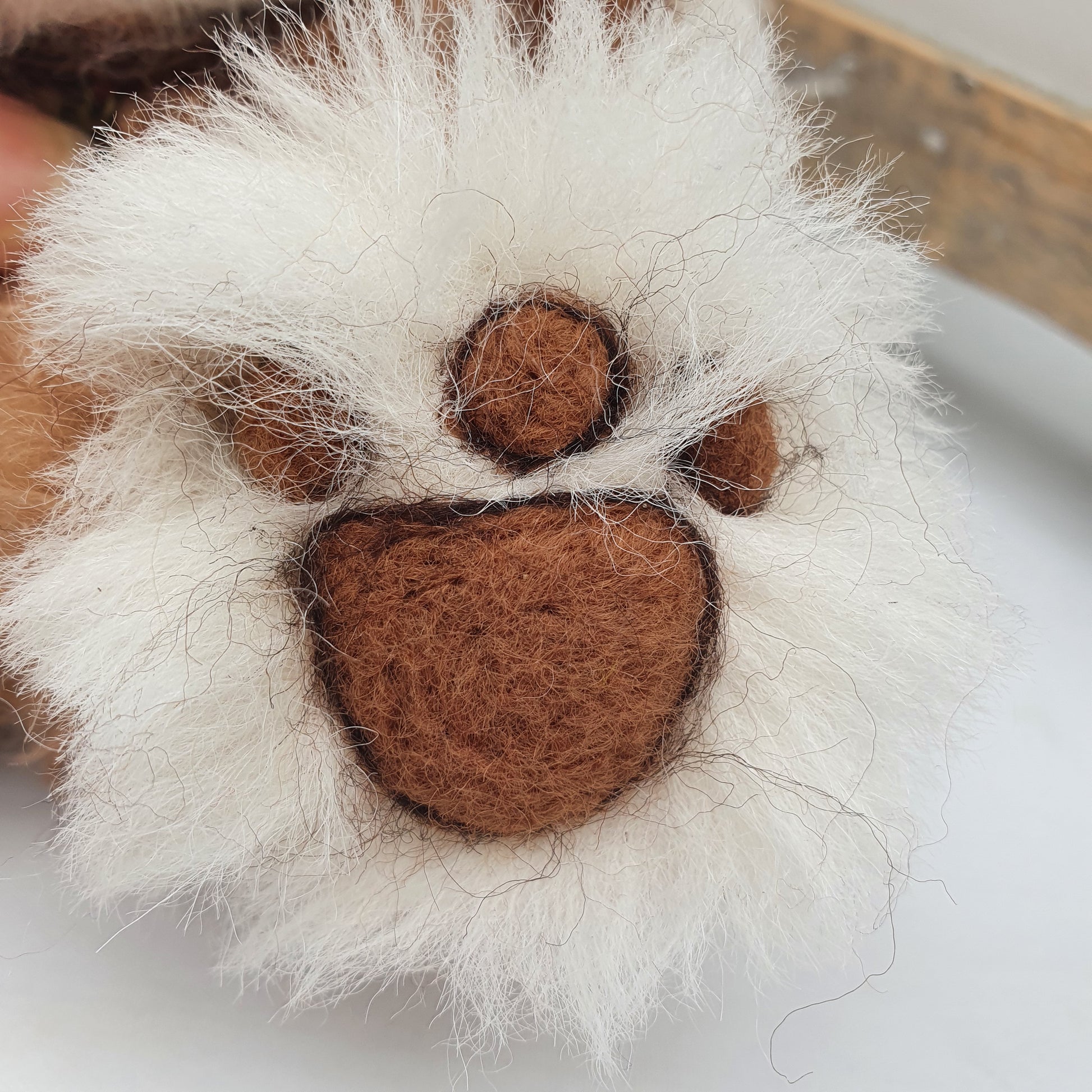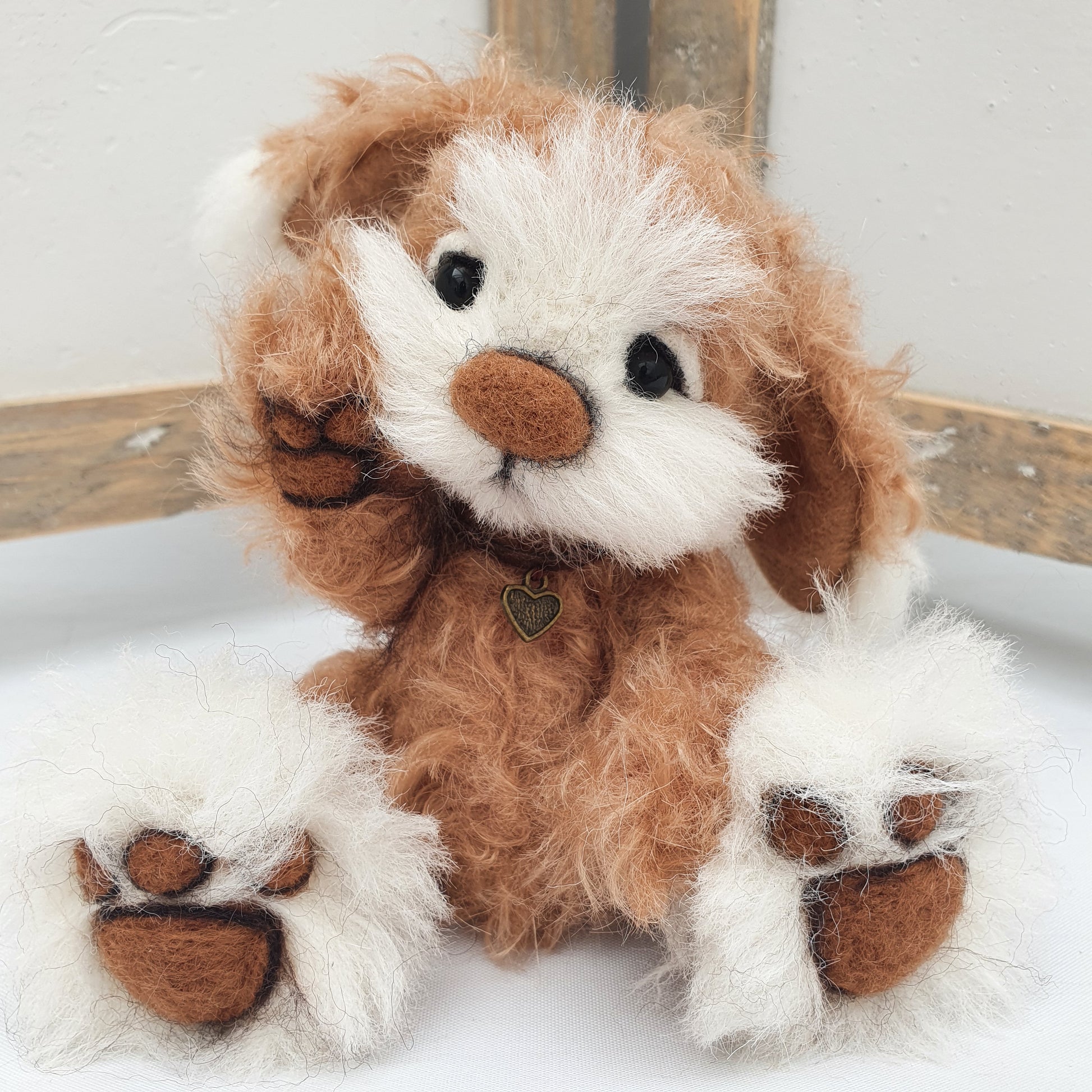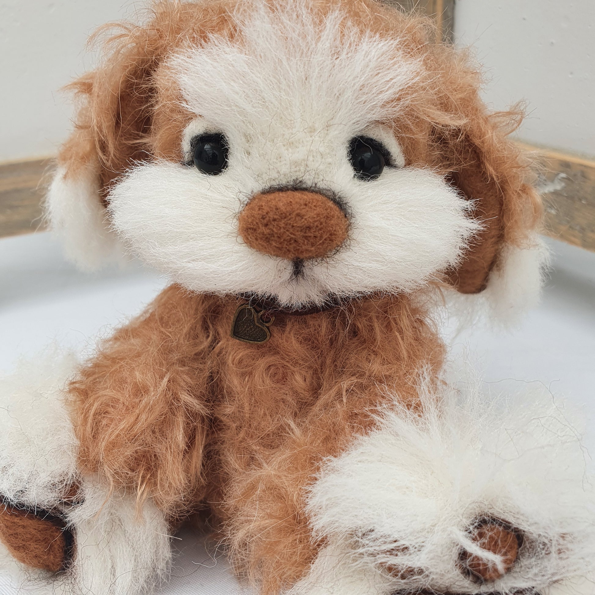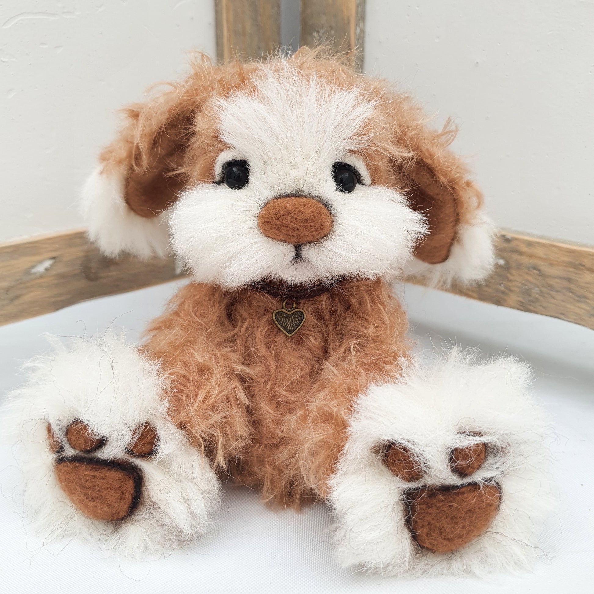 Made from my own original pattern, Pupsy is fully handmade, handsewn, and has been designed by me. Pupsy is a sitting puppy, however, with a little positioning and support, is able to stand in an upright position against/beside something as in the images which can be nice to pose amongst a collection, display or for photos/diorama.