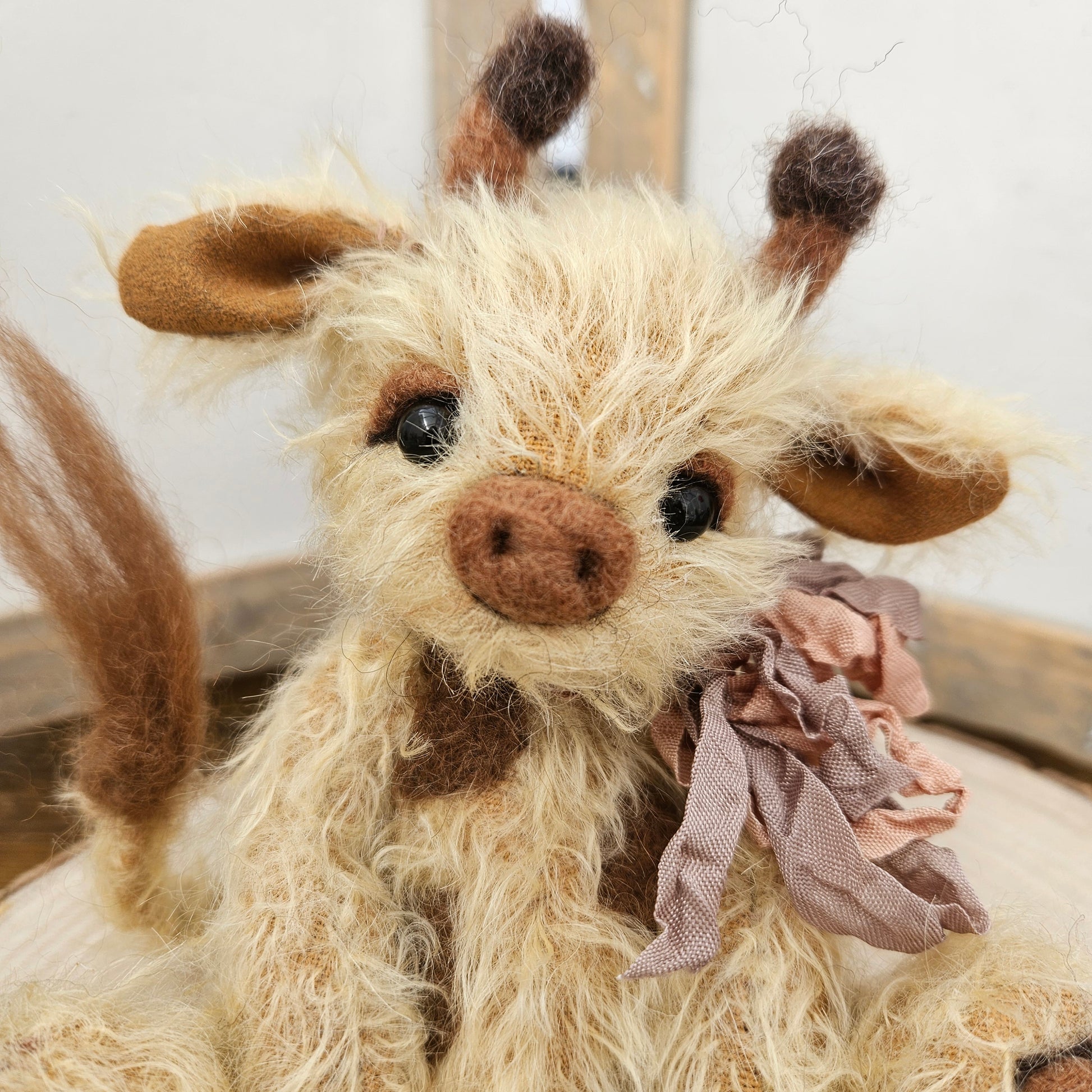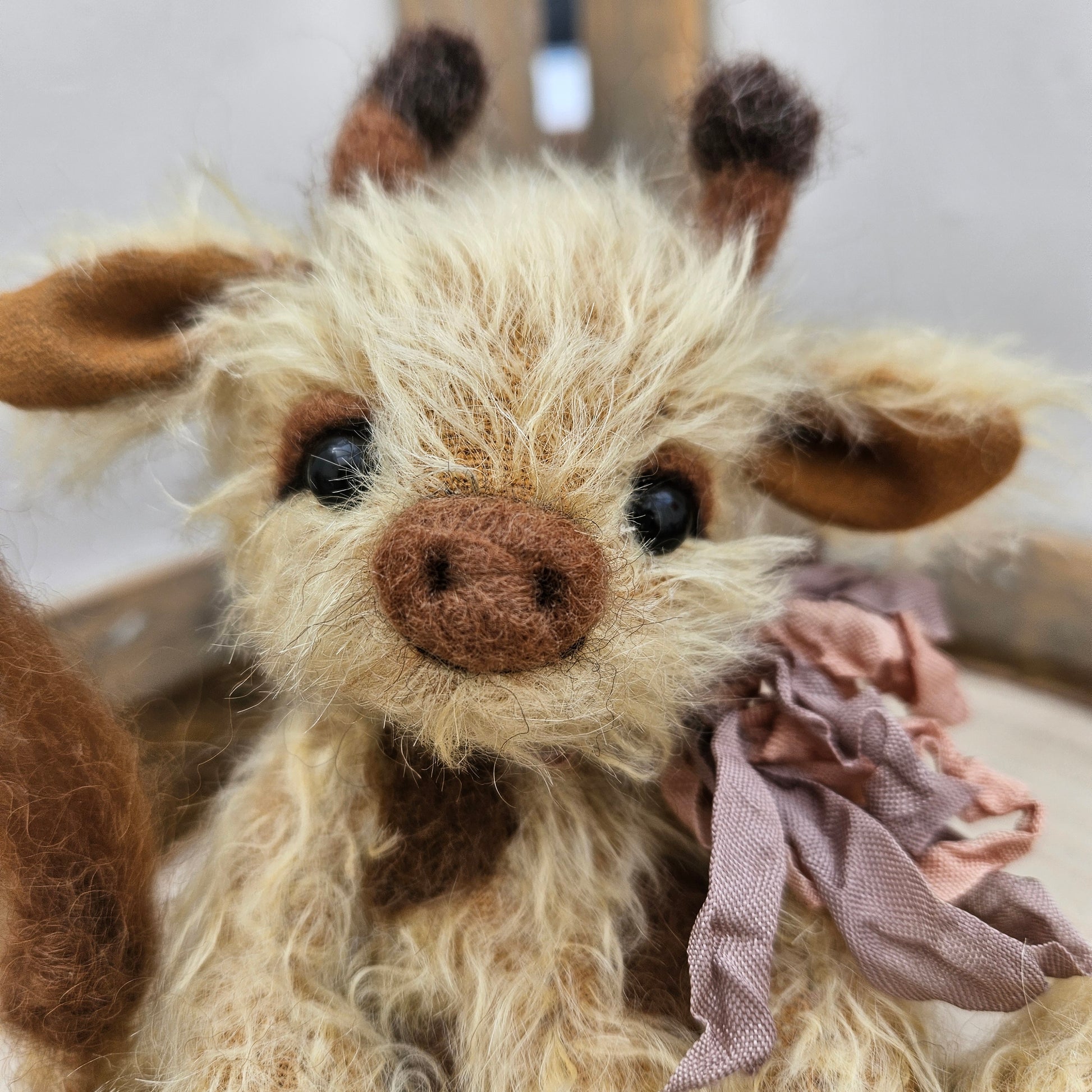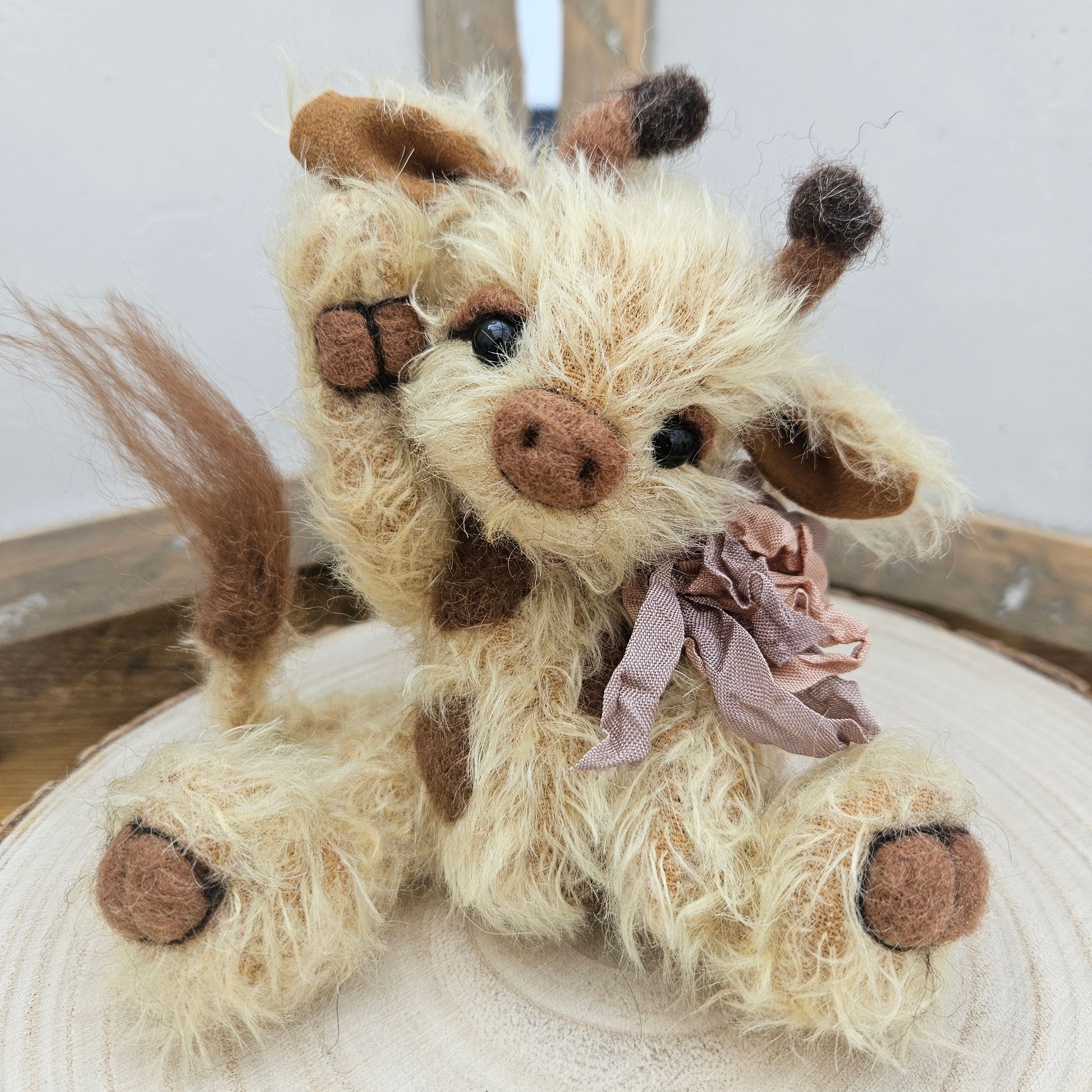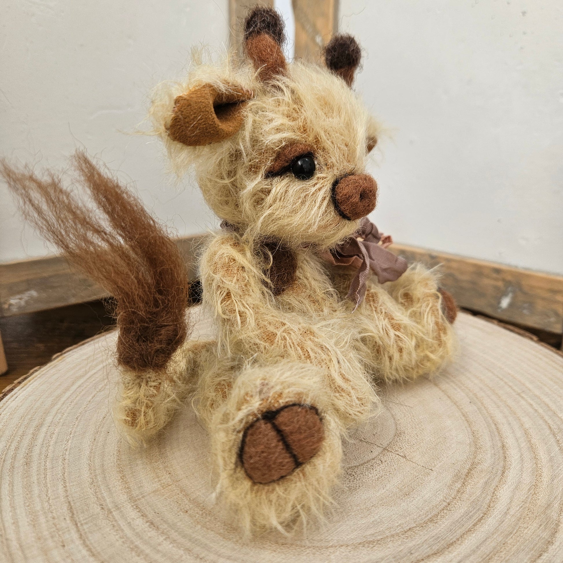 Made from my own original pattern, Raffy is fully handmade, handsewn, and has been designed by me. Although a sitting giraffe, with a little positioning and support, Raffy is able to stand in an upright position against/beside something as in the images which can be nice to pose amongst a collection, in a display or for photos/diorama.